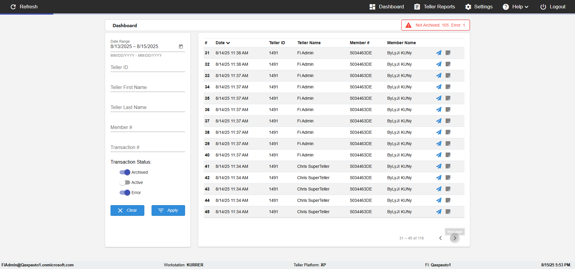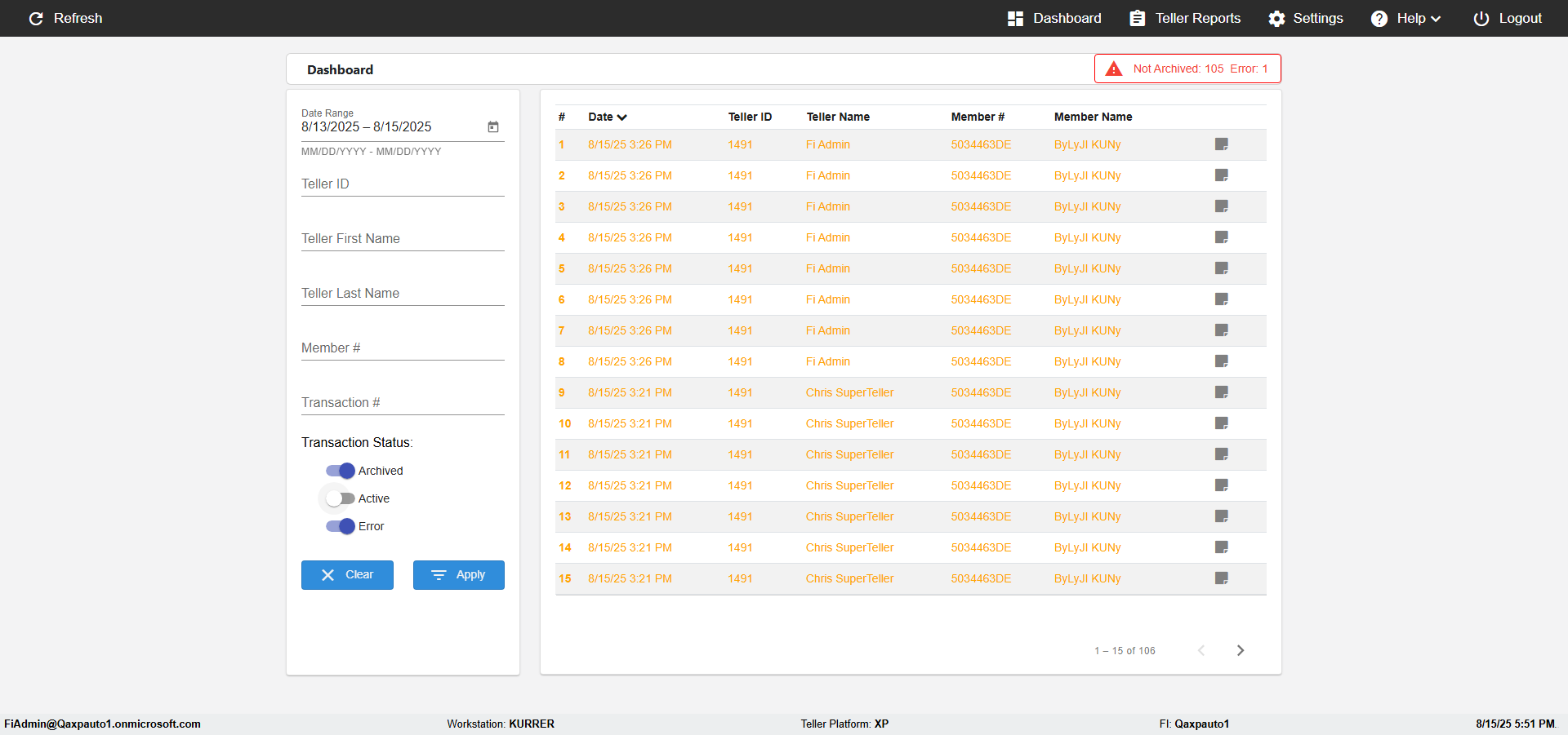 | {Description=verify Color Transcations In DashBoard with Archive, Email=Test@gmail.com, Teller LastName=, print signatur=, errorint=, TestID=verifyTransactionColorsInDashBoard, Color Transactions=Archived-#212529|Active-#ffa500|Error-#ff0000, Member=, UserPwd=iMM2022!, Transtatus=Archived-true;Active-false;Error-false, Receipt=, Report=, Teller=, Teller FirstName=, errorMessage=, Suppress=, Date=2, print Disburstments=, Print signature line=, Type=, Transaction=, Header=, Username=fiAdmin@Qaxpauto1.onmicrosoft.com, SMS=(555) 019-9123, Sign=, Scan=} |