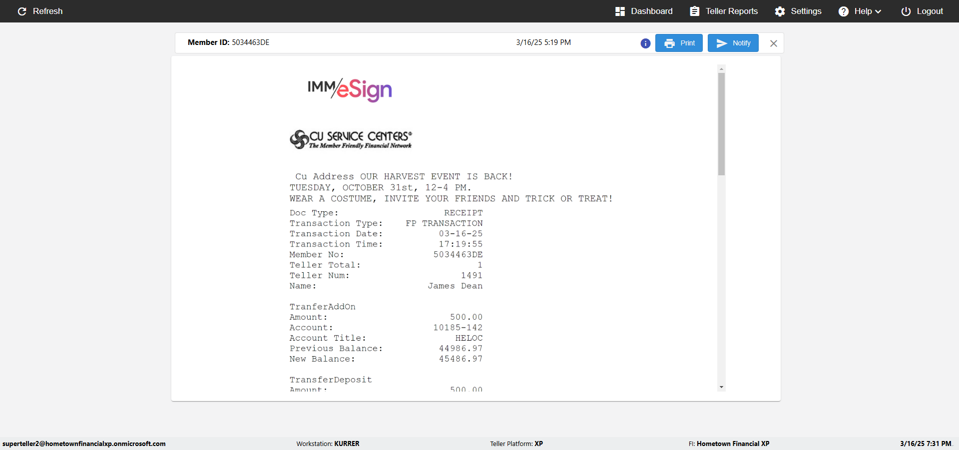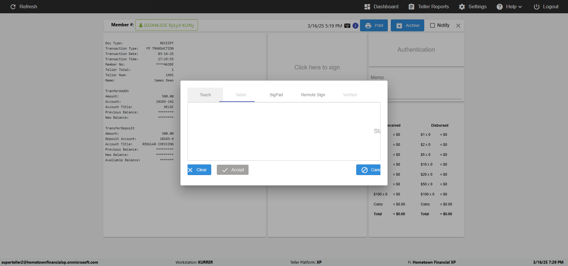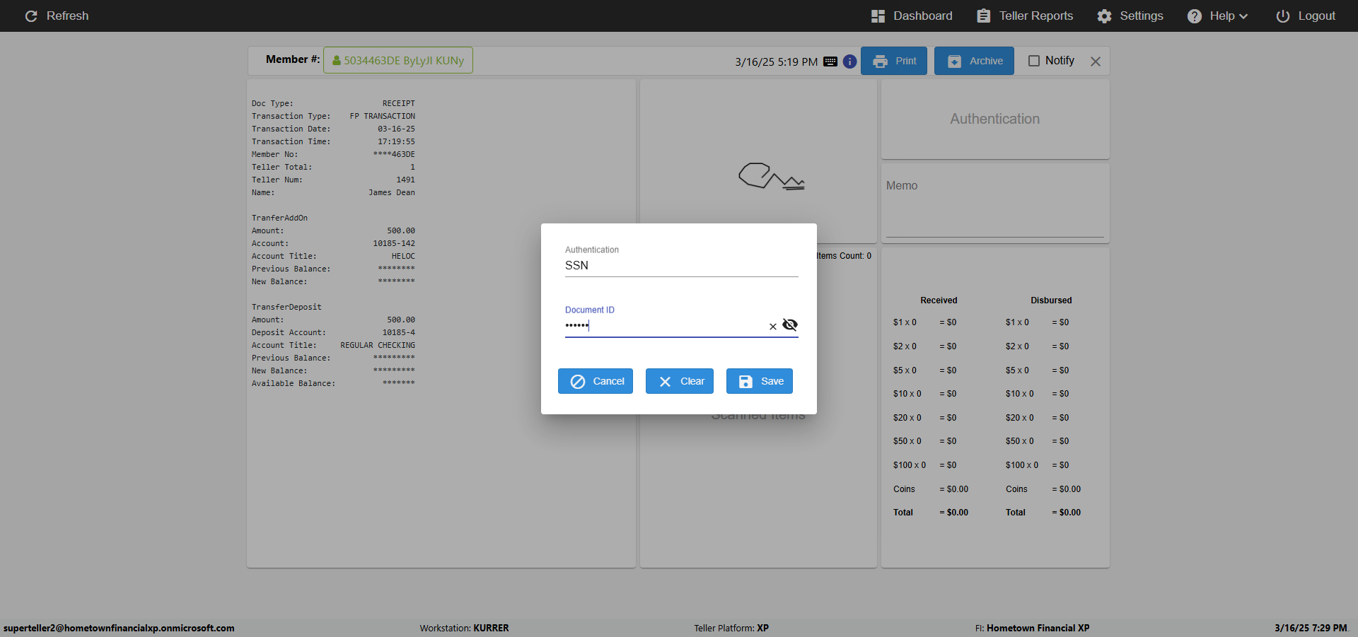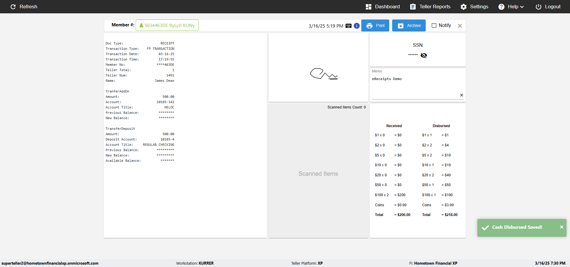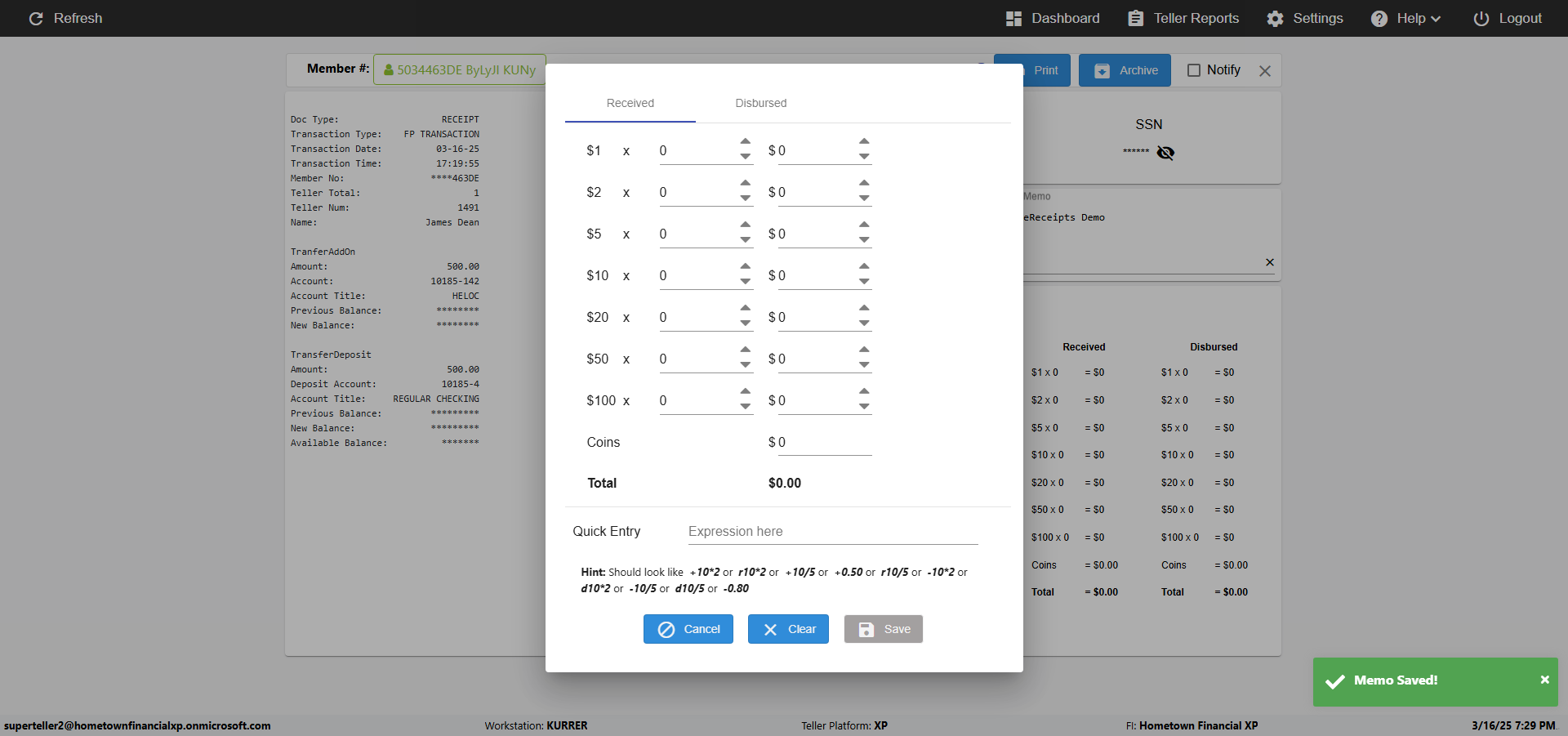 ({Toggel=, Archived Transactions=yes, Description=verify End TO End Test OF Normal Teller In Ereceipt Page, Email=FALSE, Archive=TRUE, Document Type=SSN, Notify=TRUE, SignatureTab=Touch,, DisbursedExpression=|-10*5, Operation=, Teller LastName=, Disbursed cash=1-1|2-2|5-2|10-1|20-2|50-1|100-1|Coins-3, errorint=, TestID=verifyEndTOEndTestOFNormalTellerInEreceipt, Print=FALSE, DisbursedExpressionValue=FALSE, Phone=(732) 890-6074, ReceivedCashValue=FALSE, Member=5034463, UserPwd=iMM2025!, Transtatus=Archived-false;Active-true;Error-false, Docment ID=216554, Teller=, Teller FirstName=, errorMessage=, ReceivedExpressionValue=TRUE, Date=, Platfrom=, Received cash=1-1|2-2|5-2|10-1|20-2|50-1|100-1|Coins-3, Transaction=, Header=, Expression=, Username=superteller2@hometownfinancialxp.onmicrosoft.com, DisbursedCashValue=TRUE, FullName=, ReceivedExpression=|+100*2, SMS=FALSE, Memo=eReceipts Demo})