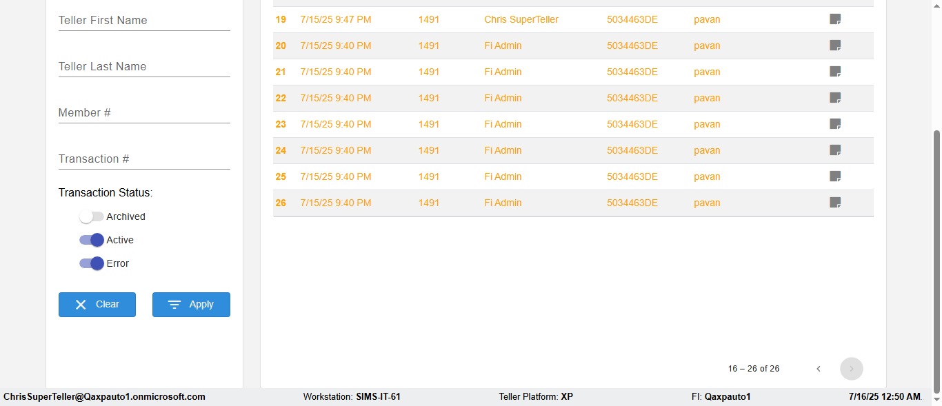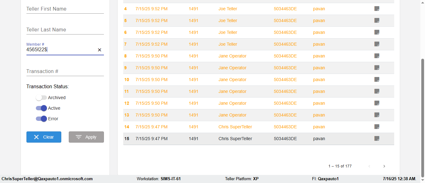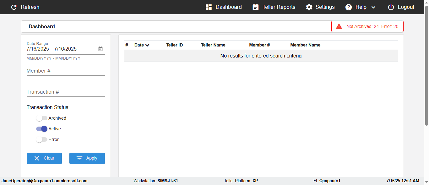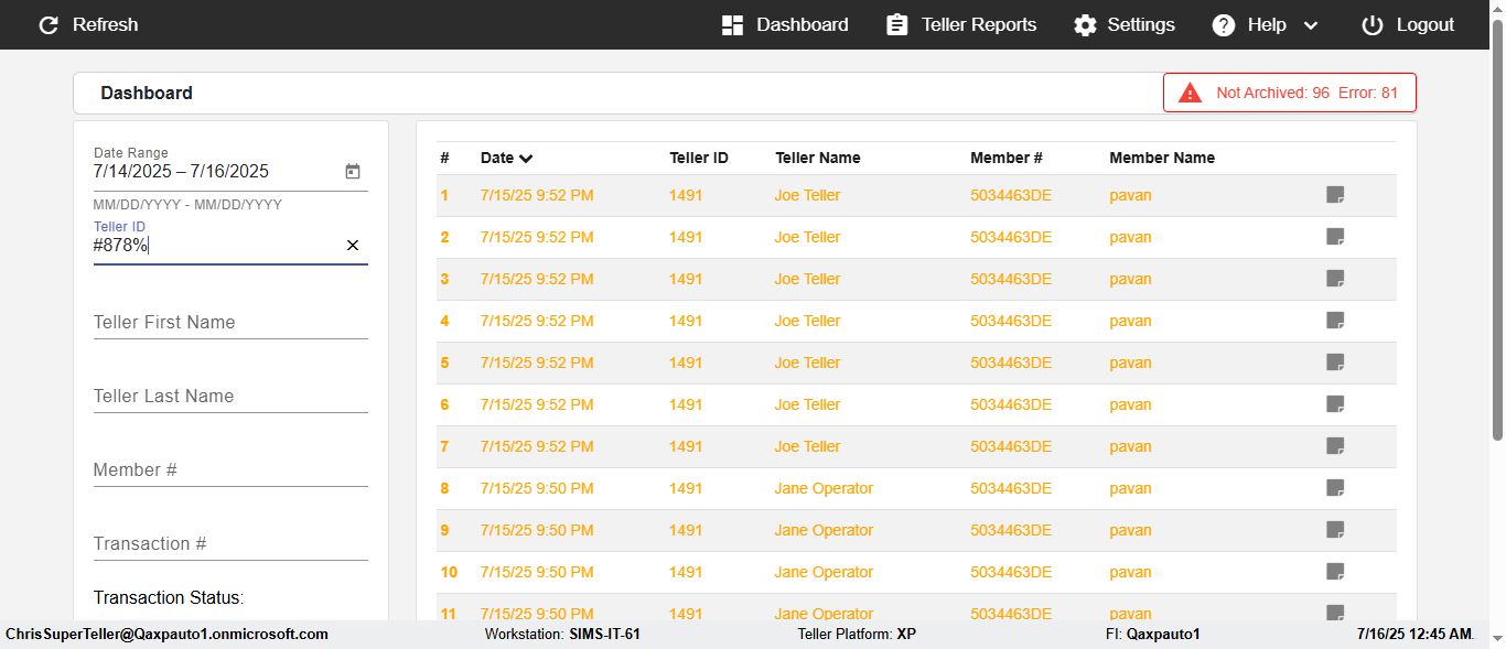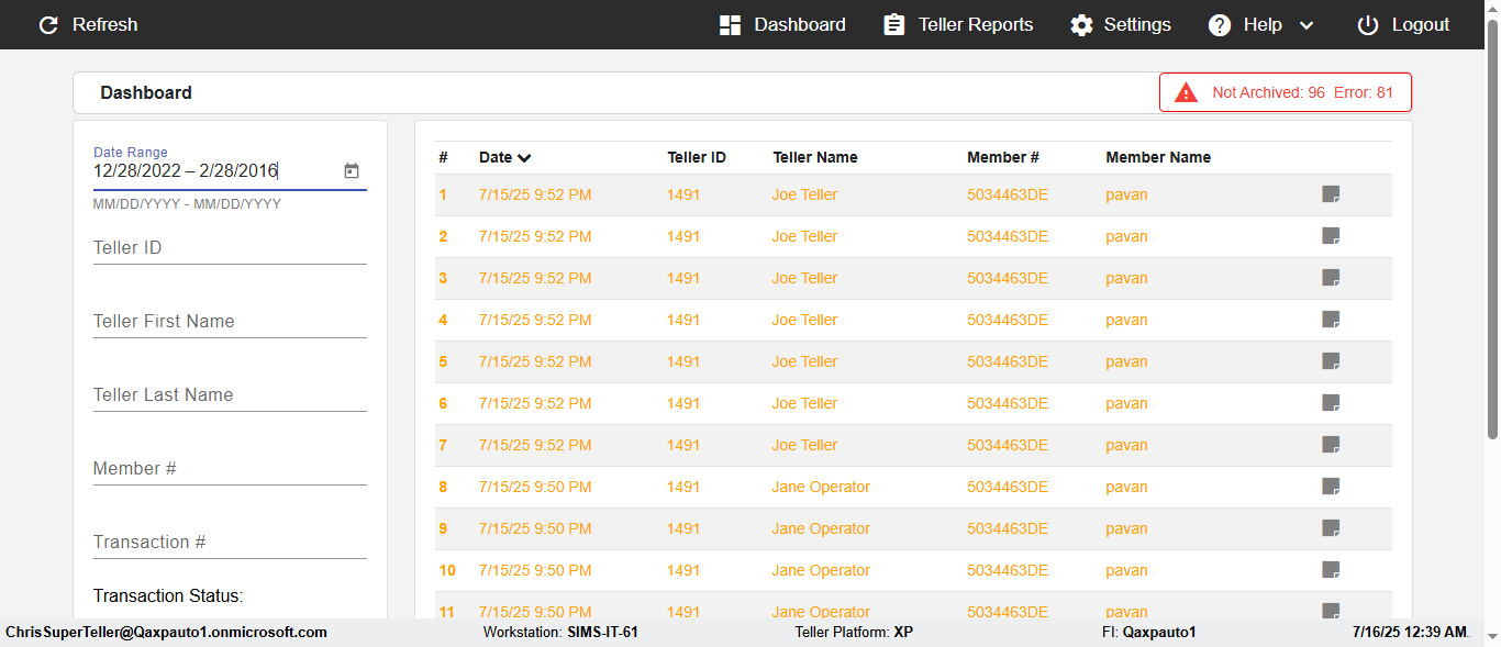 (Verify negative/invalid Search of the Date,Teller,Teller name,Member name in DashBoard page)