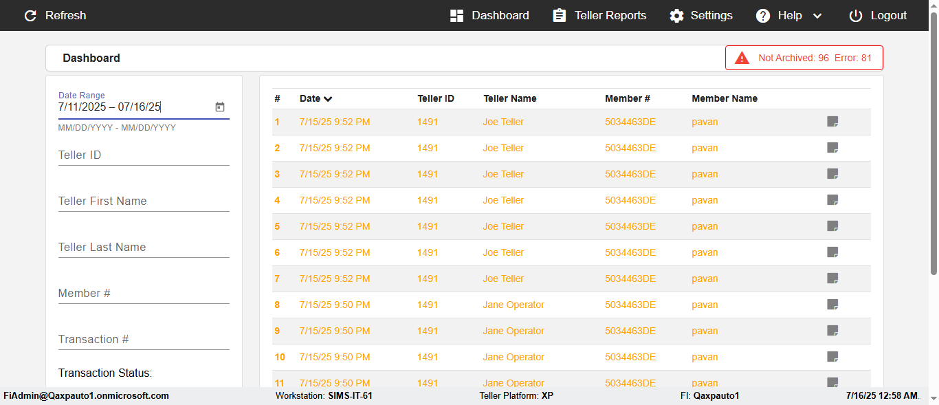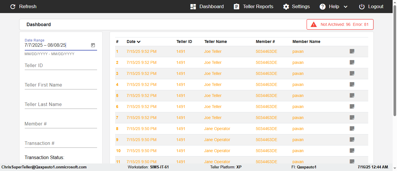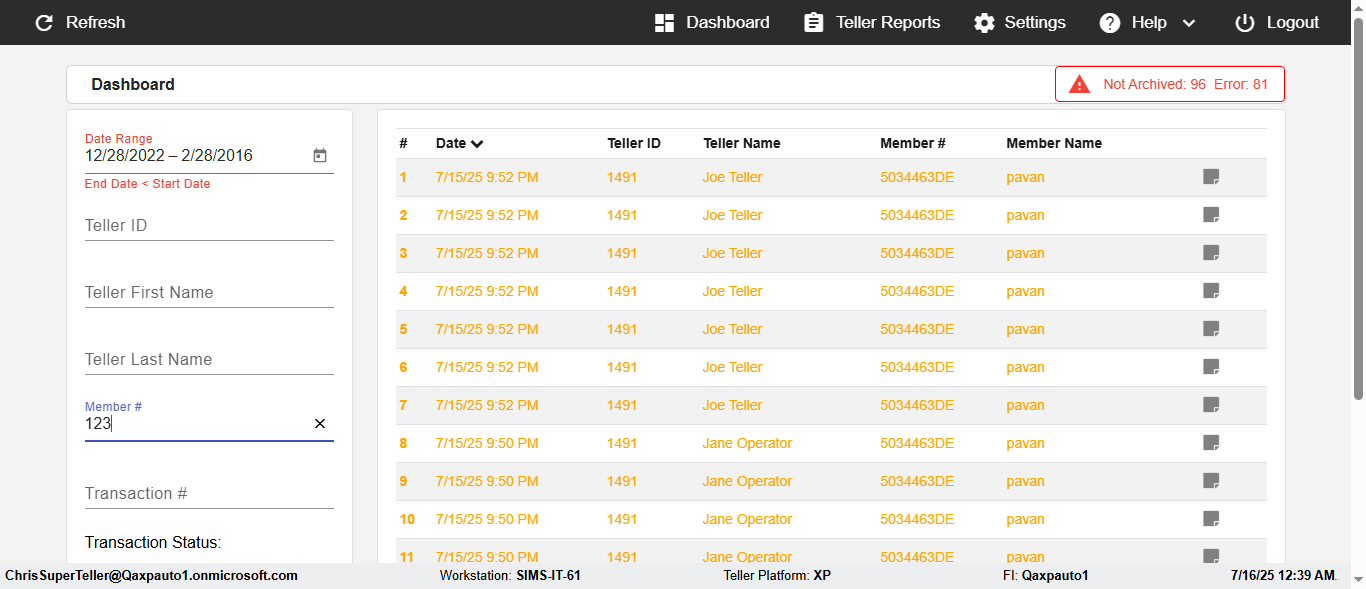 ({Description=verify Error Messages In DashBoard Page with Future From and To Date, Email=, Teller LastName=, print signatur=, errorint=2, TestID=verifyErrorMessagesInDashBoardPage, Color Transactions=, Member=5034474, UserPwd=iMM2022!, Transtatus=Archived-false;Active-true;Error-false, Receipt=, Report=, Teller=, Teller FirstName=, errorMessage=Date cannot exceed 7 days after today.;Date cannot exceed 7 days after today., Suppress=, Date=07/07/25 - 08/08/25, print Disburstments=, Print signature line=, Type=, Transaction=, Header=, Username=ChrisSuperTeller@Qaxpauto1.onmicrosoft.com, SMS=, Sign=, Scan=})