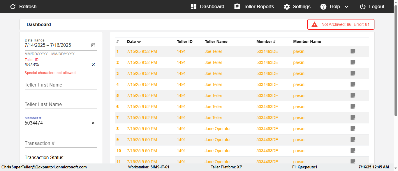 ({Description=verify Error Messages In DashBoard Page with Teller First and Last name, Email=, Teller LastName=#878%, print signatur=, errorint=2, TestID=verifyErrorMessagesInDashBoardPage, Color Transactions=, Member=5034474, UserPwd=iMM2022!, Transtatus=Archived-false;Active-true;Error-false, Receipt=, Report=, Teller=, Teller FirstName=9876*&(^, errorMessage=Special characters not allowed.;Special characters not allowed., Suppress=, Date=2, print Disburstments=, Print signature line=, Type=, Transaction=, Header=, Username=ChrisSuperTeller@Qaxpauto1.onmicrosoft.com, SMS=, Sign=, Scan=})