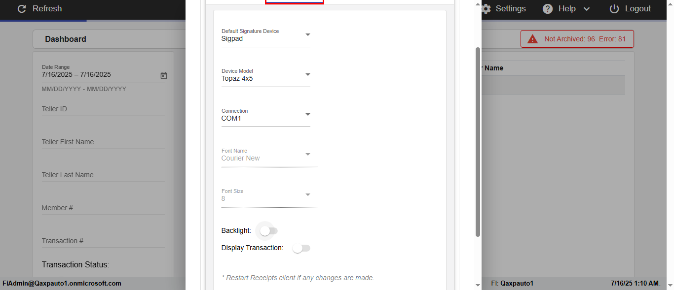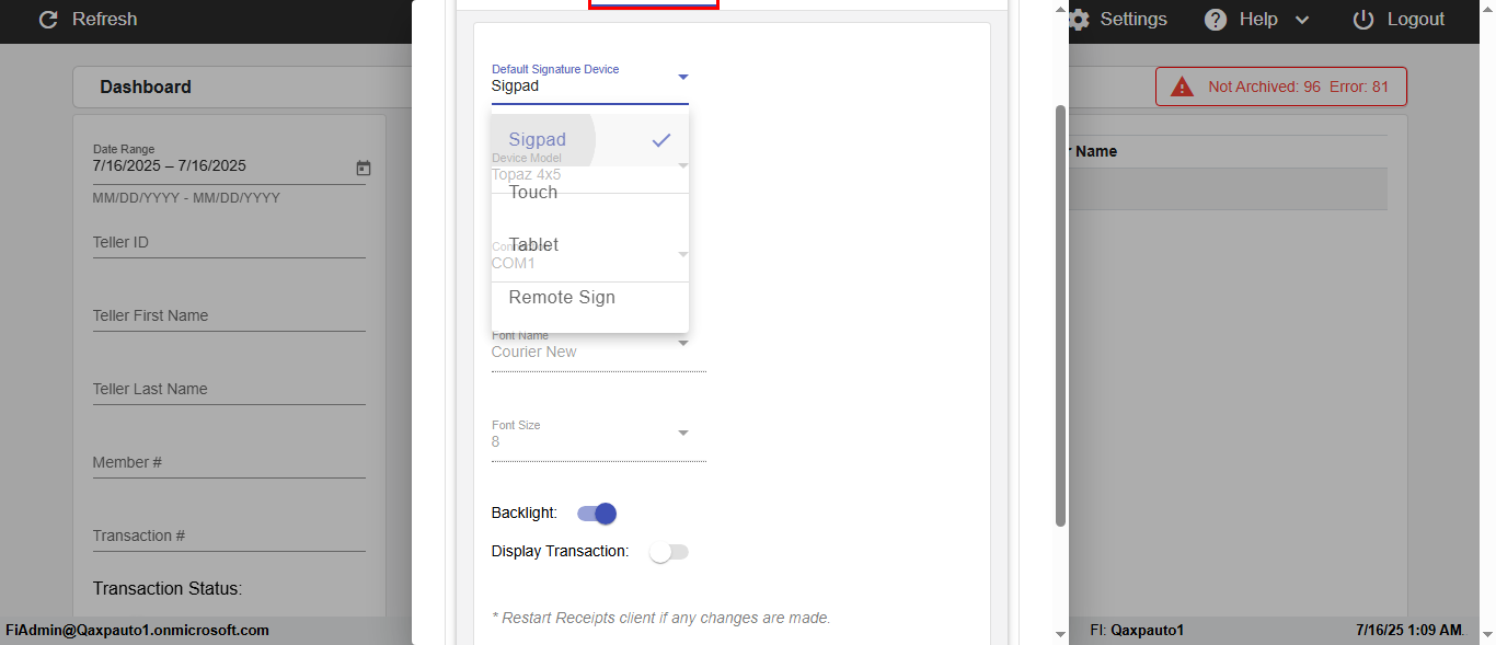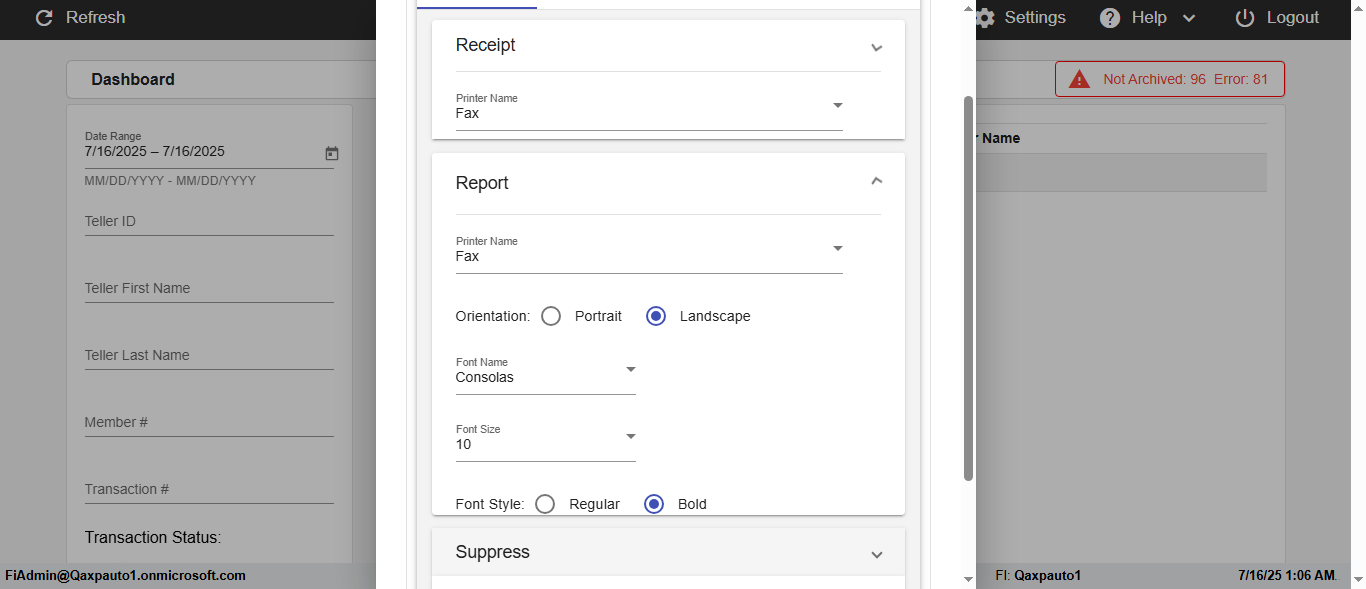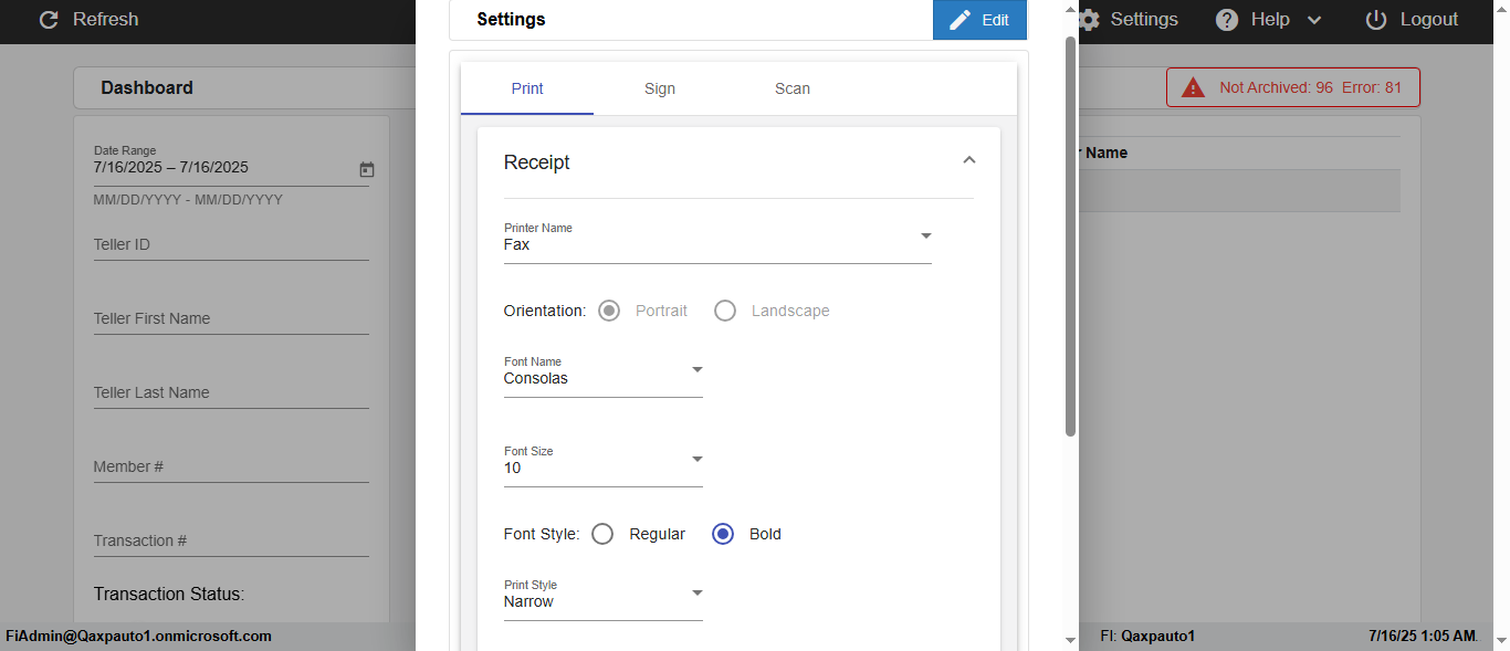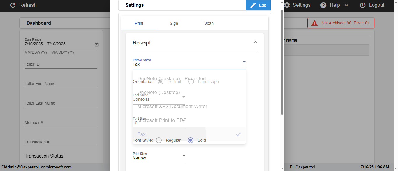 ({Description=verify Settings page In Teller Portal, Email=, Teller LastName=, print signatur=TRUE, errorint=, TestID=verifySettingsInTellerPage, Color Transactions=, Member=, UserPwd=iMM2022!, Transtatus=, Receipt=Printer Name-Fax;Name-Consolas;Size-10;Style-Bold,Narrow, Report=Printer Name-Fax;Orientation-Landscape;Name-Consolas;Size-10;Style-Bold, Teller=, Teller FirstName=, errorMessage=, Suppress=Log1-false;Log2-false;CuAddress-false;Member Address-false, Date=, print Disburstments=FALSE, Print signature line=print the sign, Type=, Transaction=, Header=, Username=fiAdmin@Qaxpauto1.onmicrosoft.com, SMS=, Sign=Default Signature Device-Sigpad;Device Model-Topaz 4x5;Connection-COM1;Backlight-true, Scan=Scanner Type-ScanShell 3000D;Image Mode-Singleside;USB Connection-false})