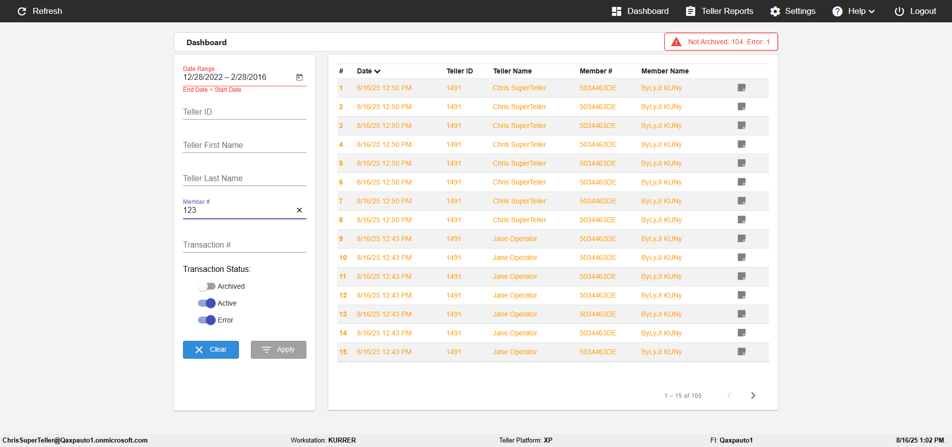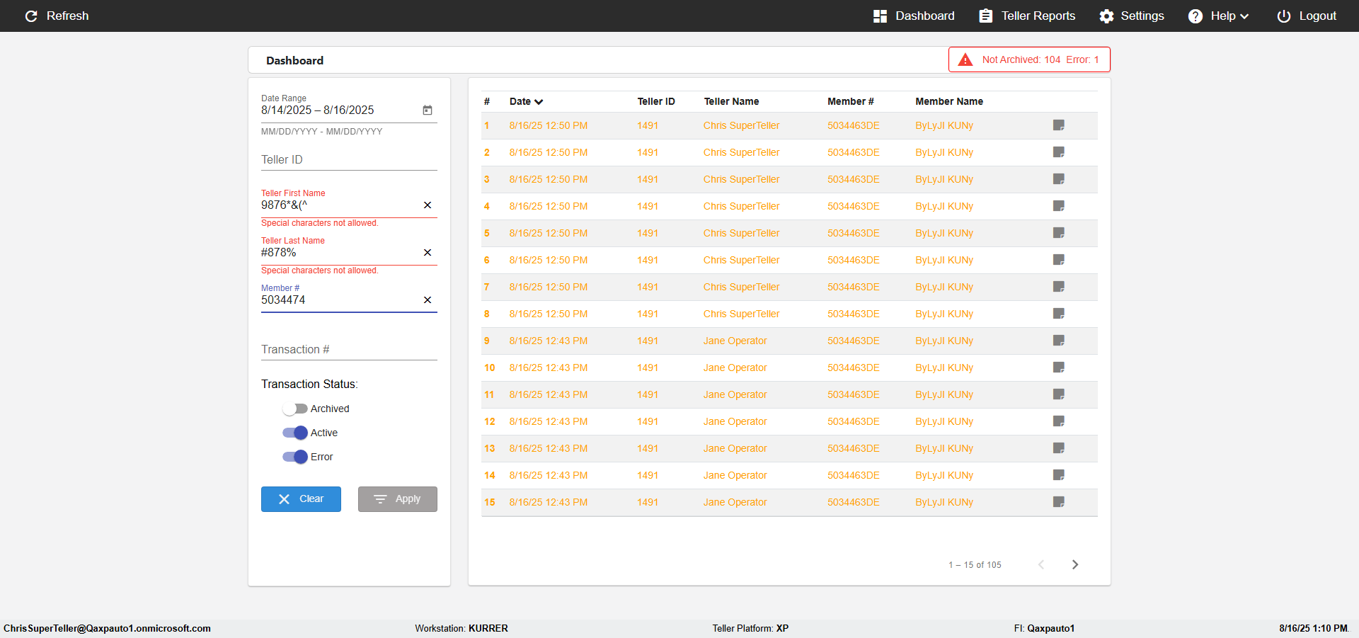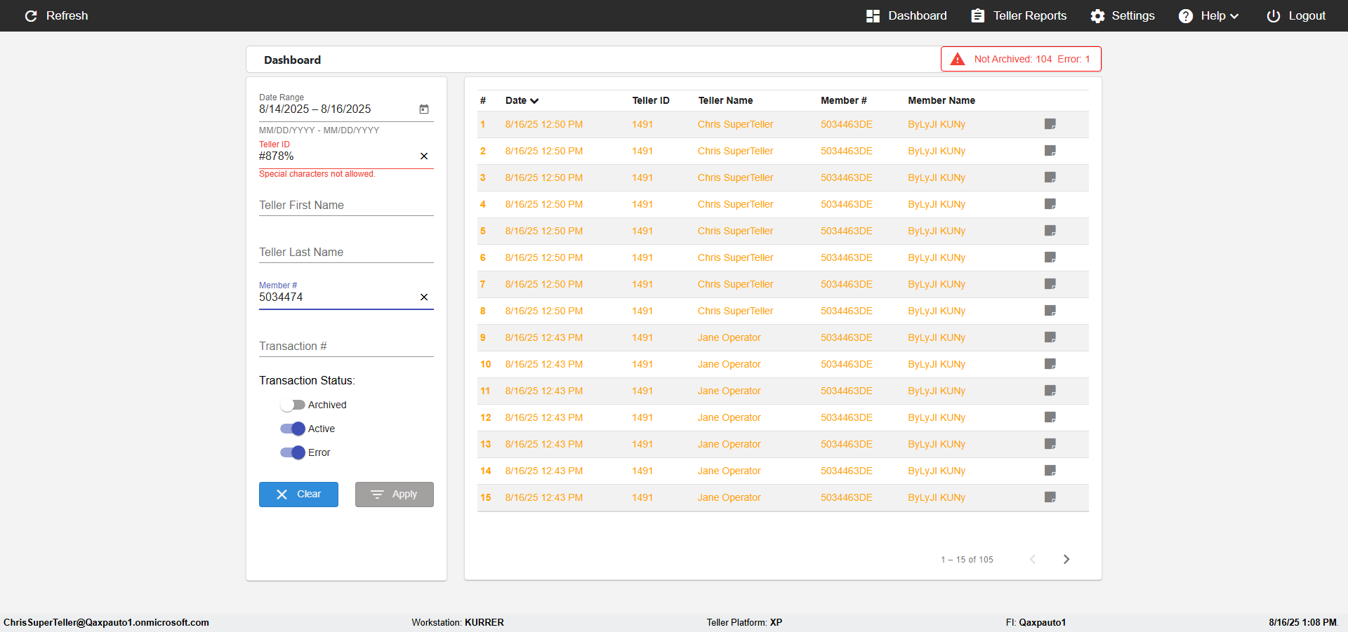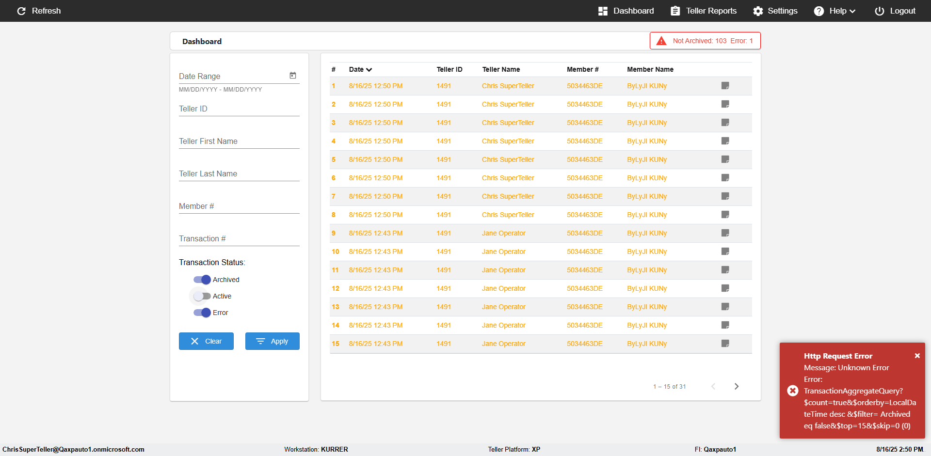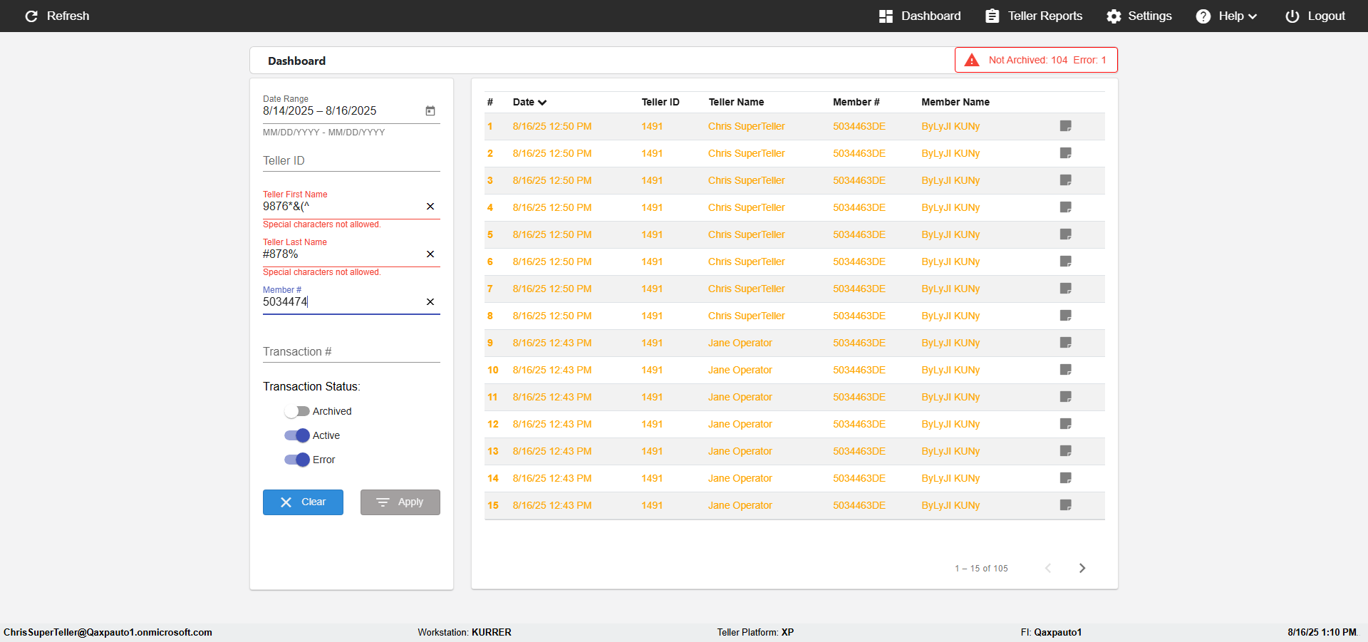 ({Description=verify Error Messages In DashBoard Page with Future From and To Date, Email=, Teller LastName=, print signatur=, errorint=2, TestID=verifyErrorMessagesInDashBoardPage, Color Transactions=, Member=5034474, UserPwd=iMM2022!, Transtatus=Archived-false;Active-true;Error-false, Receipt=, Report=, Teller=, Teller FirstName=, errorMessage=Date cannot exceed 7 days after today.;Date cannot exceed 7 days after today., Suppress=, Date=07/07/25 - 08/08/25, print Disburstments=, Print signature line=, Type=, Transaction=, Header=, Username=ChrisSuperTeller@Qaxpauto1.onmicrosoft.com, SMS=, Sign=, Scan=})