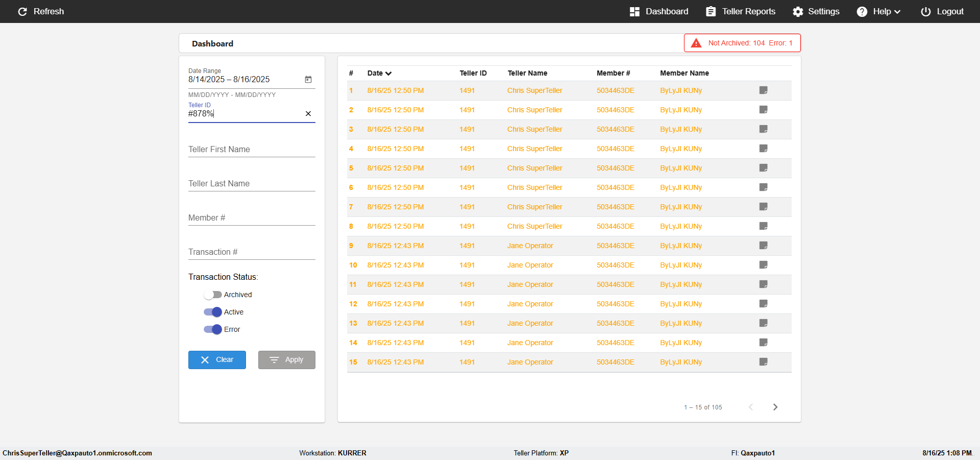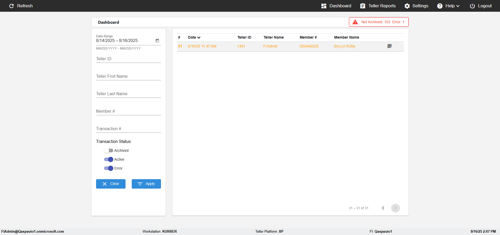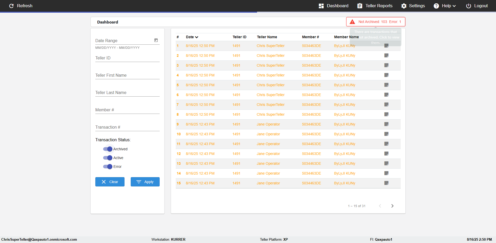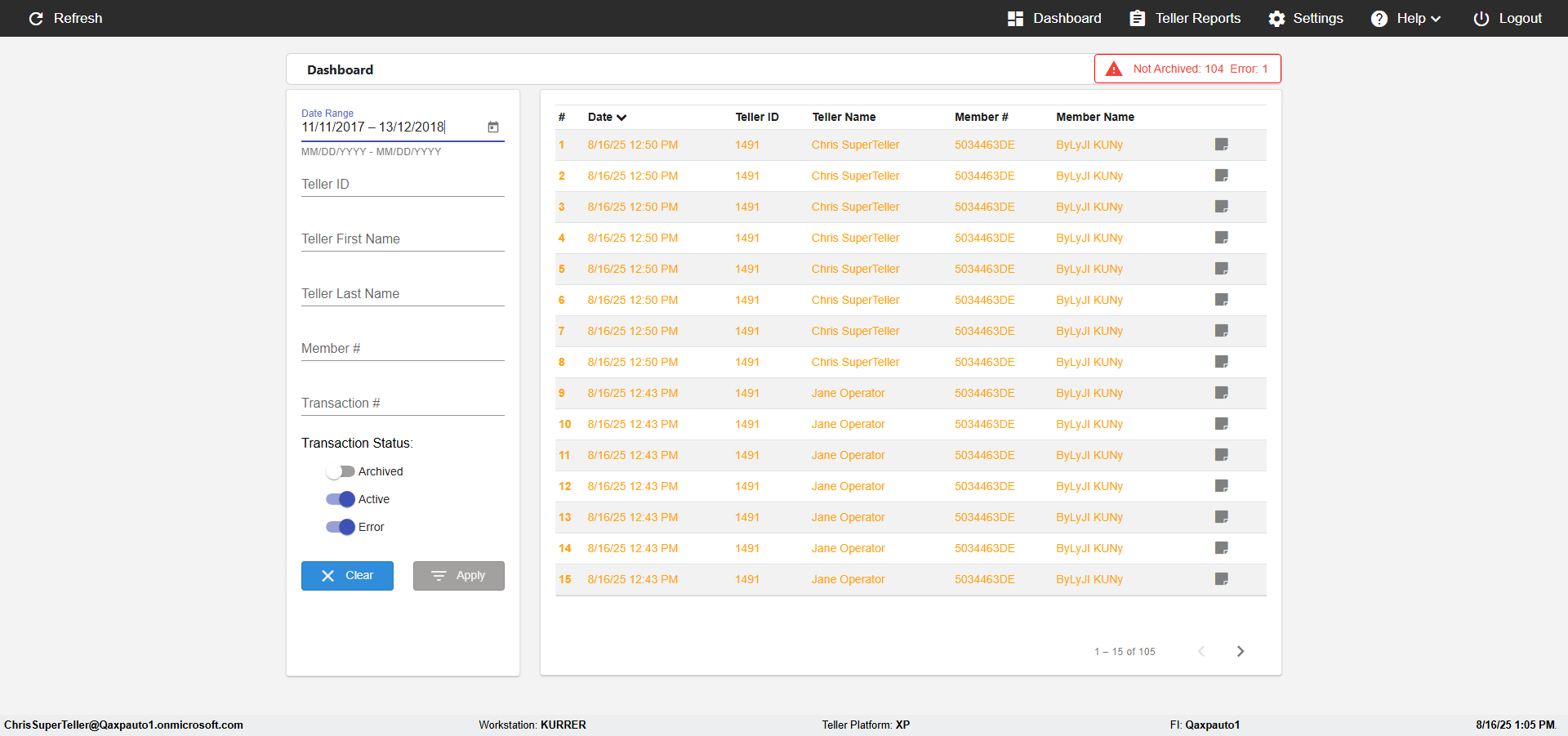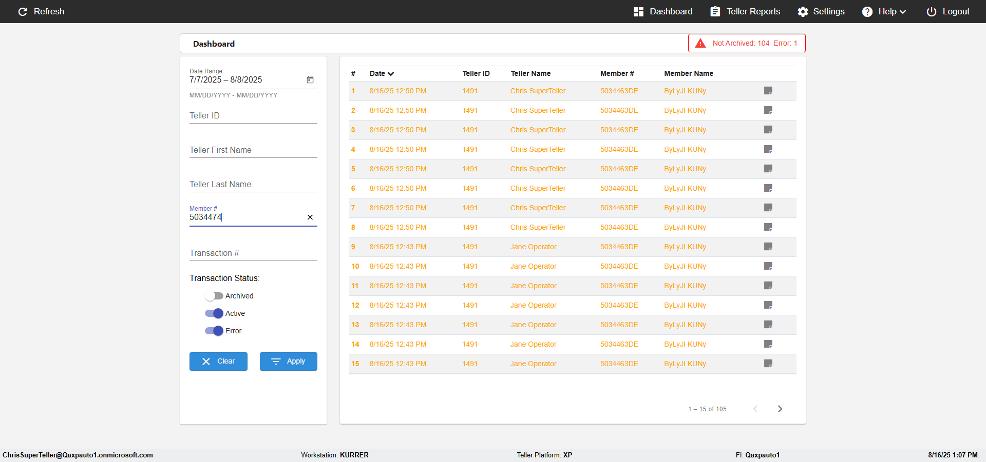 ({Description=verify Error Messages In DashBoard Page with Future From and To Date, Email=, Teller LastName=, print signatur=, errorint=2, TestID=verifyErrorMessagesInDashBoardPage, Color Transactions=, Member=5034474, UserPwd=iMM2022!, Transtatus=Archived-false;Active-true;Error-false, Receipt=, Report=, Teller=, Teller FirstName=, errorMessage=Date cannot exceed 7 days after today.;Date cannot exceed 7 days after today., Suppress=, Date=07/07/25 - 08/08/25, print Disburstments=, Print signature line=, Type=, Transaction=, Header=, Username=ChrisSuperTeller@Qaxpauto1.onmicrosoft.com, SMS=, Sign=, Scan=})