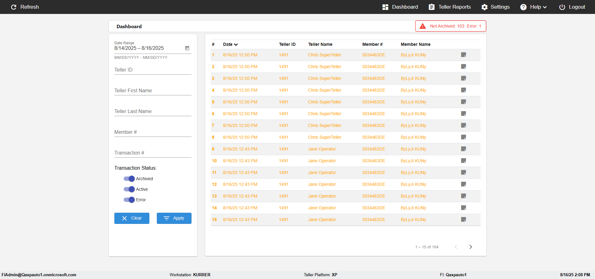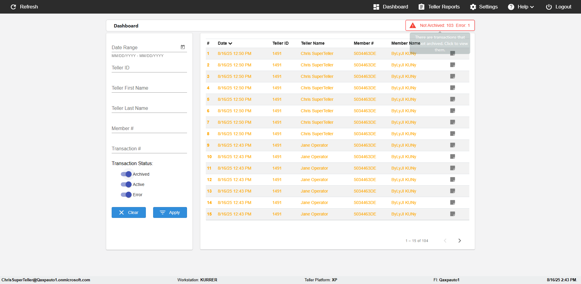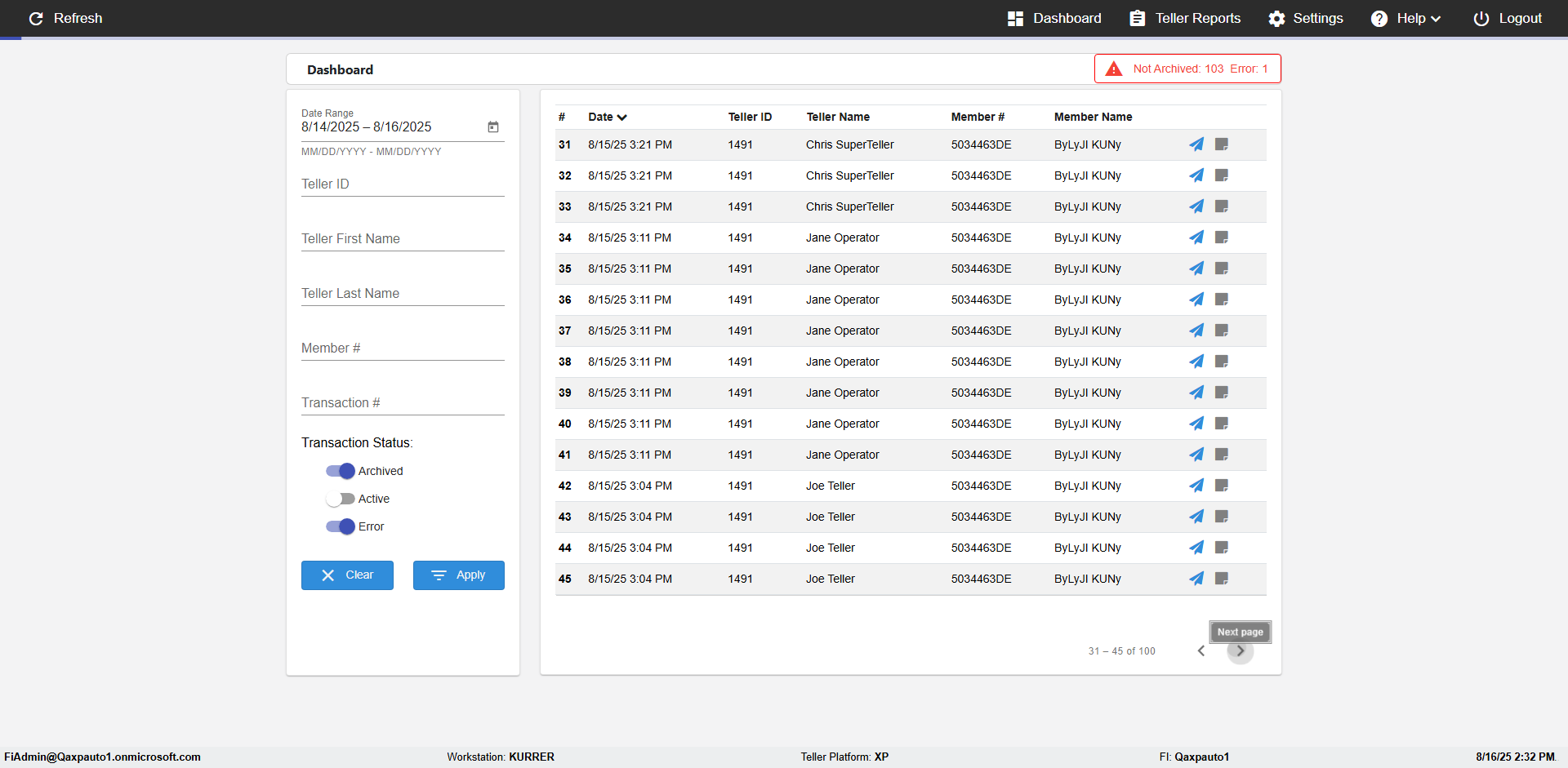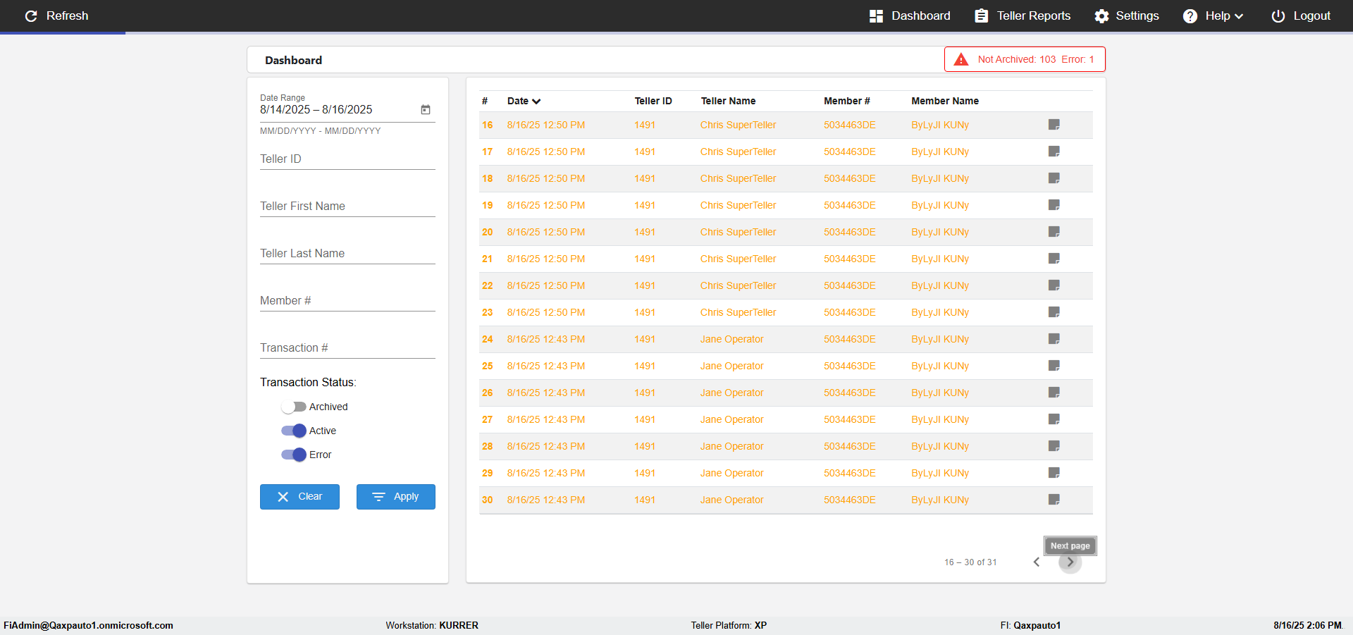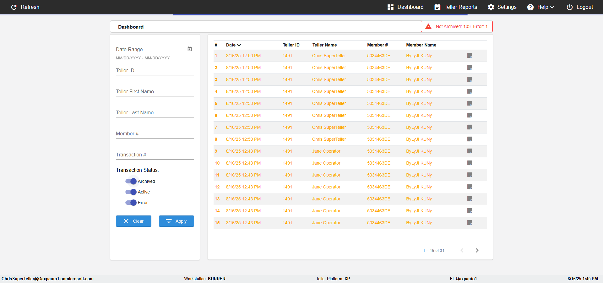 ({Description=verify Error Messages In DashBoard Page with Future From and To Date, Email=, Teller LastName=, print signatur=, errorint=2, TestID=verifyErrorMessagesInDashBoardPage, Color Transactions=, Member=5034474, UserPwd=iMM2022!, Transtatus=Archived-false;Active-true;Error-false, Receipt=, Report=, Teller=, Teller FirstName=, errorMessage=Date cannot exceed 7 days after today.;Date cannot exceed 7 days after today., Suppress=, Date=07/07/25 - 08/08/25, print Disburstments=, Print signature line=, Type=, Transaction=, Header=, Username=ChrisSuperTeller@Qaxpauto1.onmicrosoft.com, SMS=, Sign=, Scan=})