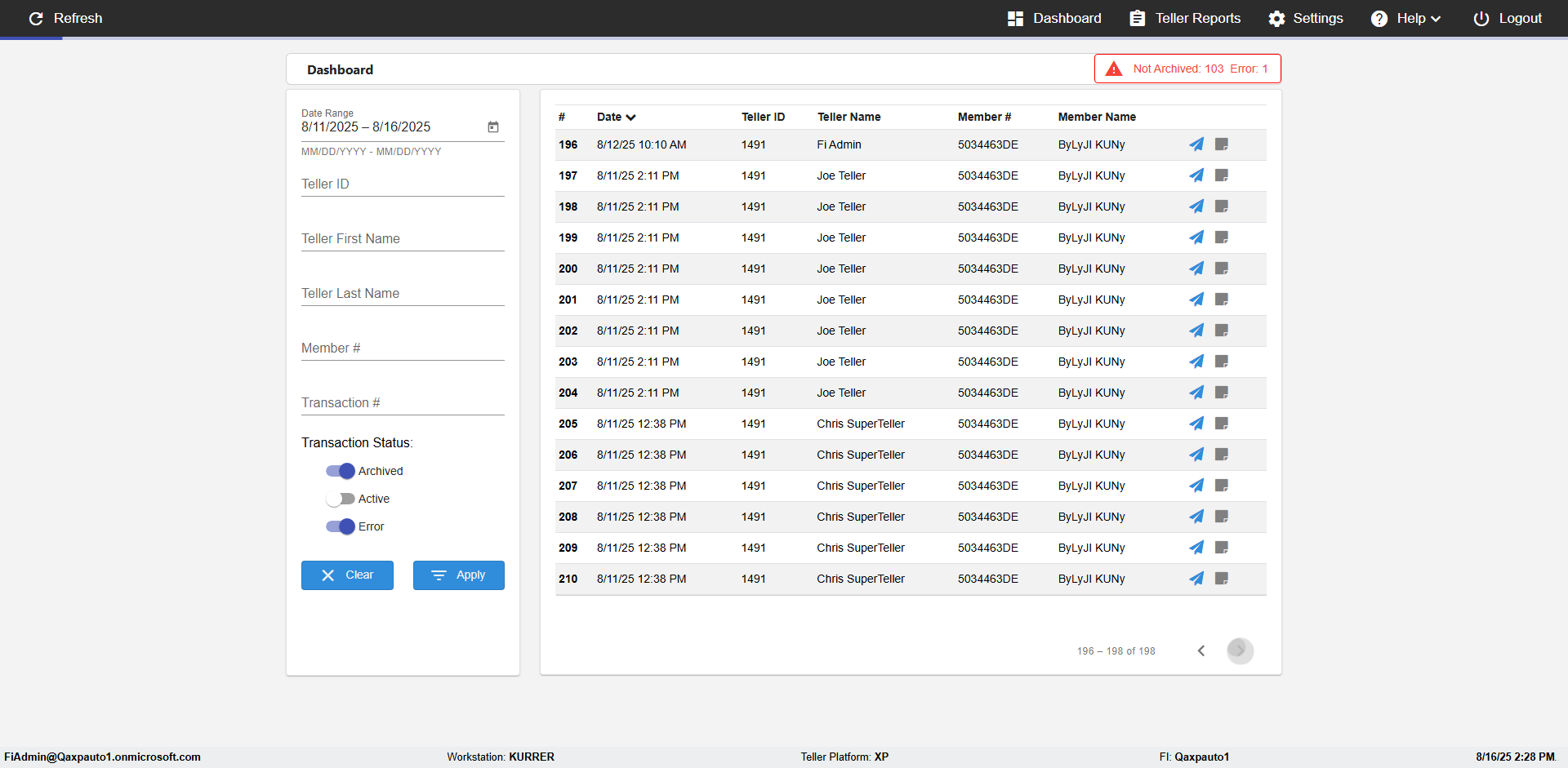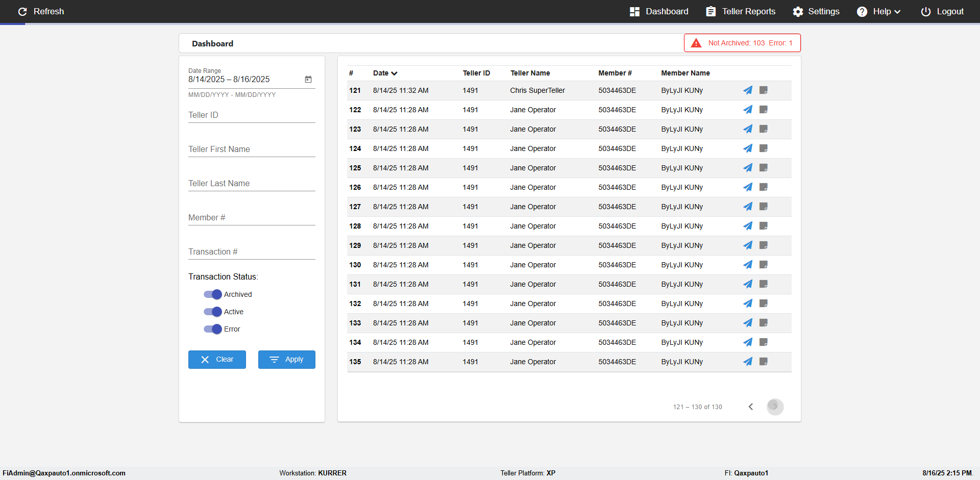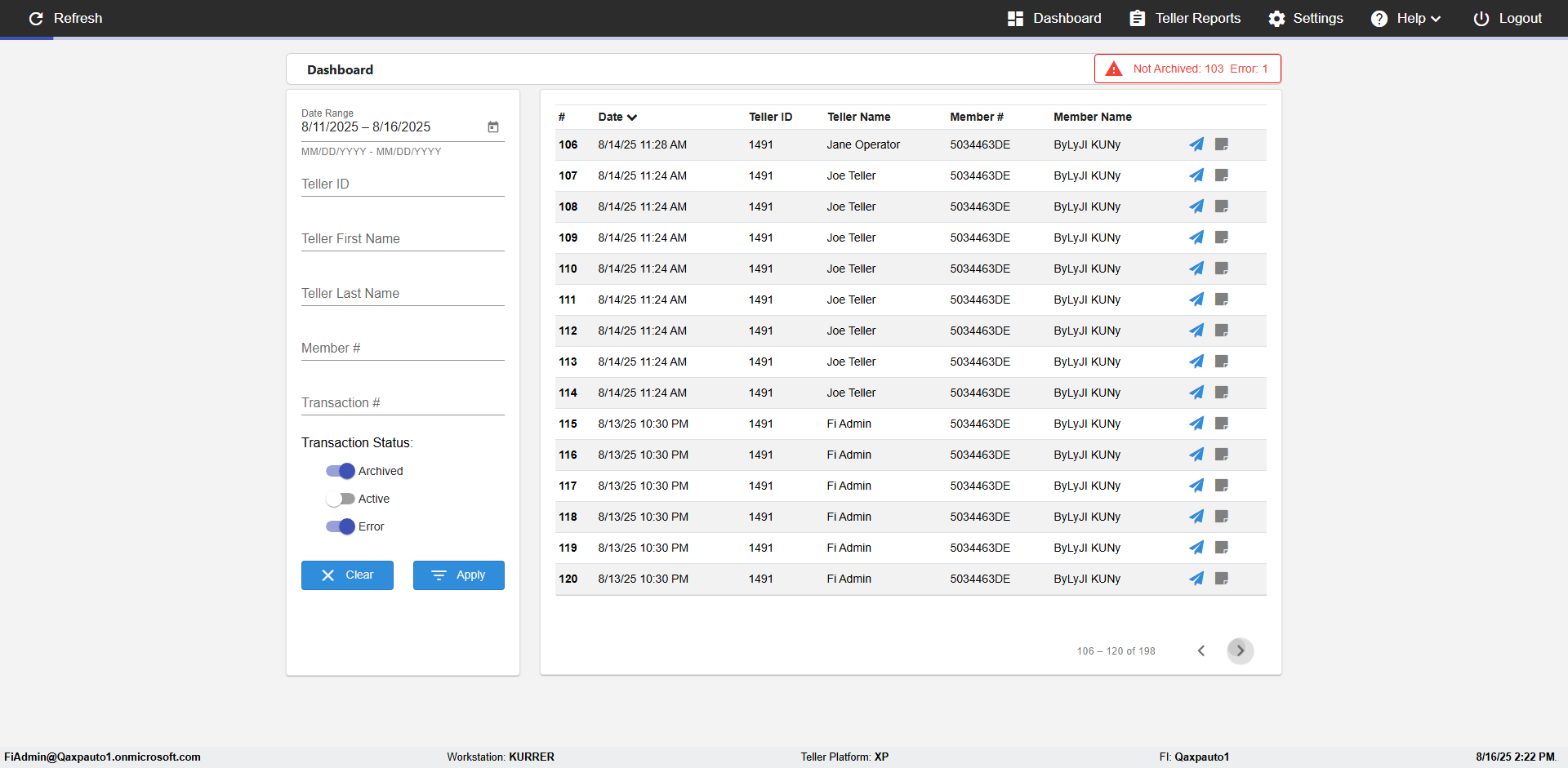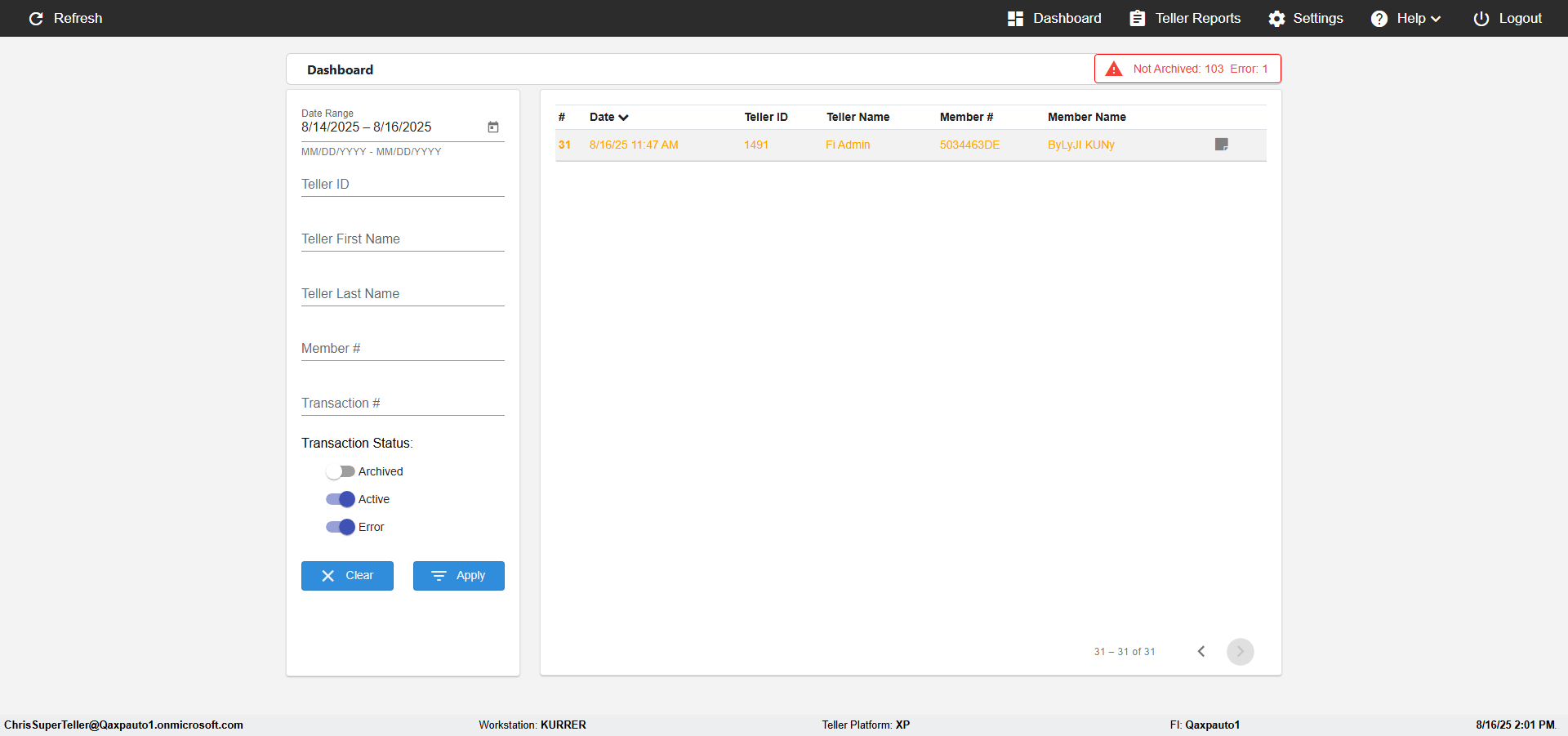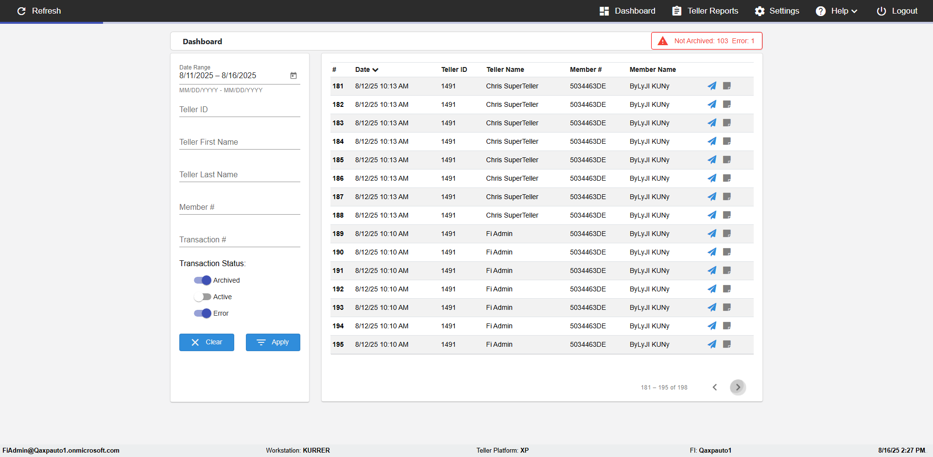 ({Description=verify Error Messages In DashBoard Page with Future From and To Date, Email=, Teller LastName=, print signatur=, errorint=2, TestID=verifyErrorMessagesInDashBoardPage, Color Transactions=, Member=5034474, UserPwd=iMM2022!, Transtatus=Archived-false;Active-true;Error-false, Receipt=, Report=, Teller=, Teller FirstName=, errorMessage=Date cannot exceed 7 days after today.;Date cannot exceed 7 days after today., Suppress=, Date=07/07/25 - 08/08/25, print Disburstments=, Print signature line=, Type=, Transaction=, Header=, Username=ChrisSuperTeller@Qaxpauto1.onmicrosoft.com, SMS=, Sign=, Scan=})