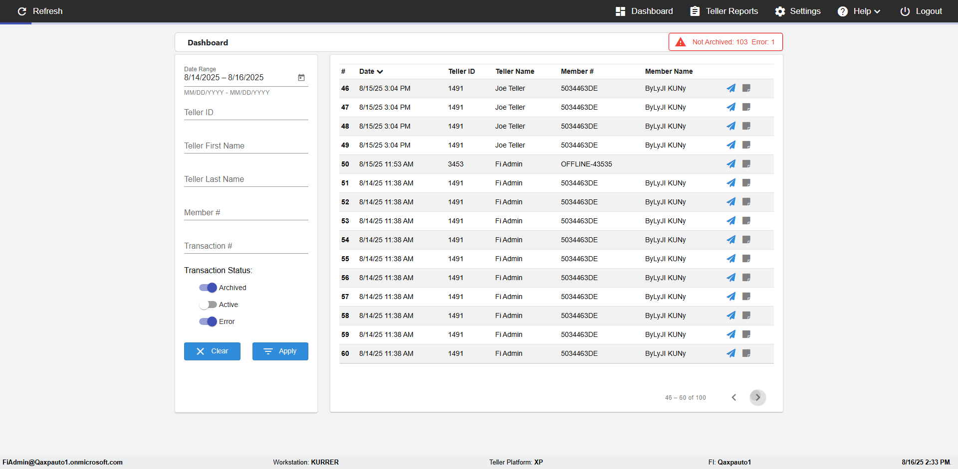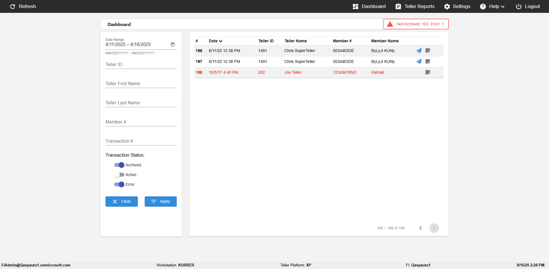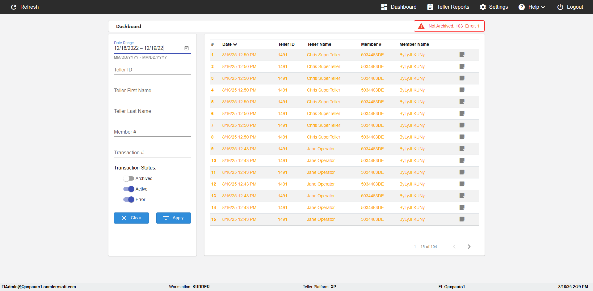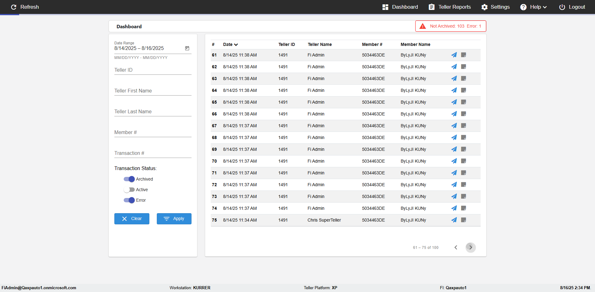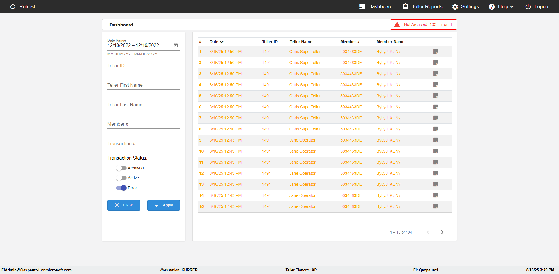 ({Description=verify Error Messages In DashBoard Page with Future From and To Date, Email=, Teller LastName=, print signatur=, errorint=2, TestID=verifyErrorMessagesInDashBoardPage, Color Transactions=, Member=5034474, UserPwd=iMM2022!, Transtatus=Archived-false;Active-true;Error-false, Receipt=, Report=, Teller=, Teller FirstName=, errorMessage=Date cannot exceed 7 days after today.;Date cannot exceed 7 days after today., Suppress=, Date=07/07/25 - 08/08/25, print Disburstments=, Print signature line=, Type=, Transaction=, Header=, Username=ChrisSuperTeller@Qaxpauto1.onmicrosoft.com, SMS=, Sign=, Scan=})