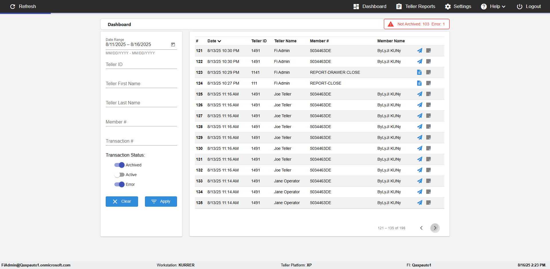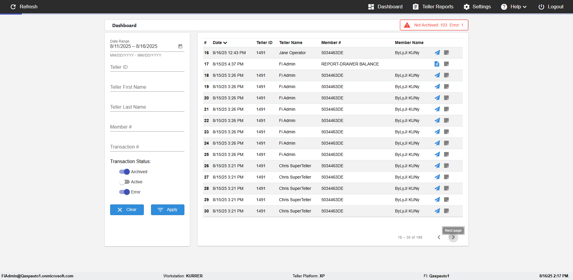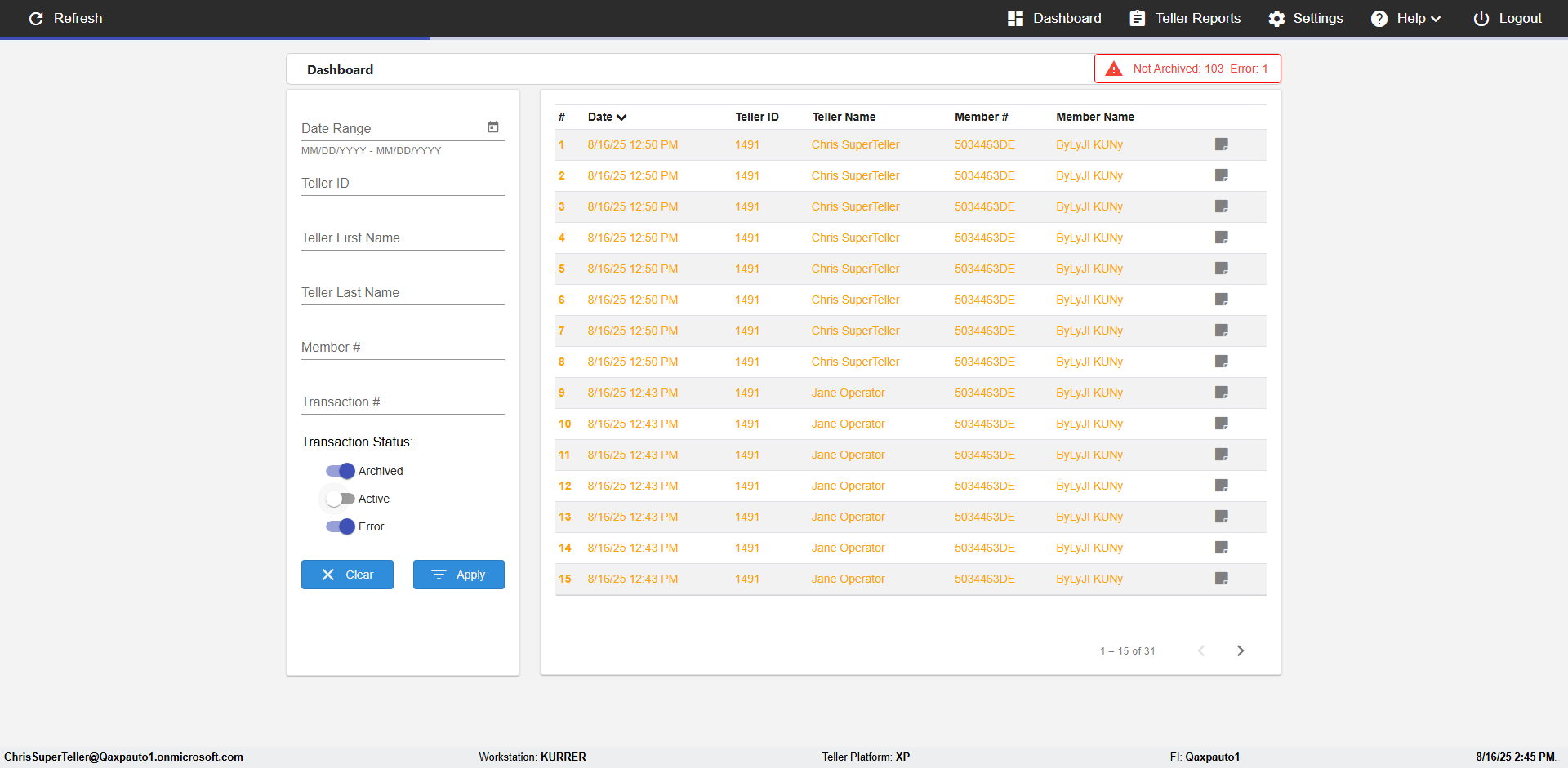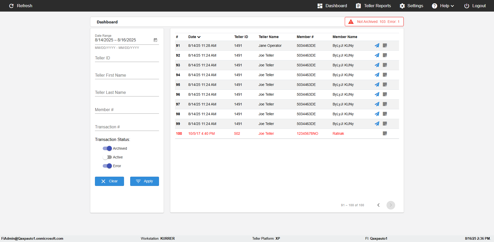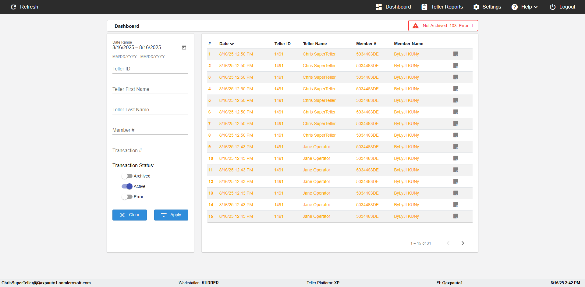 ({Description=verify Error Messages In DashBoard Page with Future From and To Date, Email=, Teller LastName=, print signatur=, errorint=2, TestID=verifyErrorMessagesInDashBoardPage, Color Transactions=, Member=5034474, UserPwd=iMM2022!, Transtatus=Archived-false;Active-true;Error-false, Receipt=, Report=, Teller=, Teller FirstName=, errorMessage=Date cannot exceed 7 days after today.;Date cannot exceed 7 days after today., Suppress=, Date=07/07/25 - 08/08/25, print Disburstments=, Print signature line=, Type=, Transaction=, Header=, Username=ChrisSuperTeller@Qaxpauto1.onmicrosoft.com, SMS=, Sign=, Scan=})