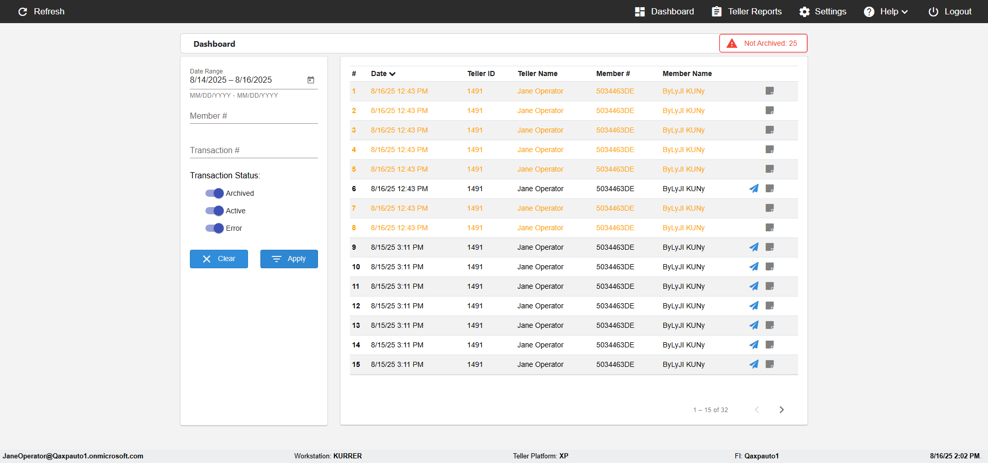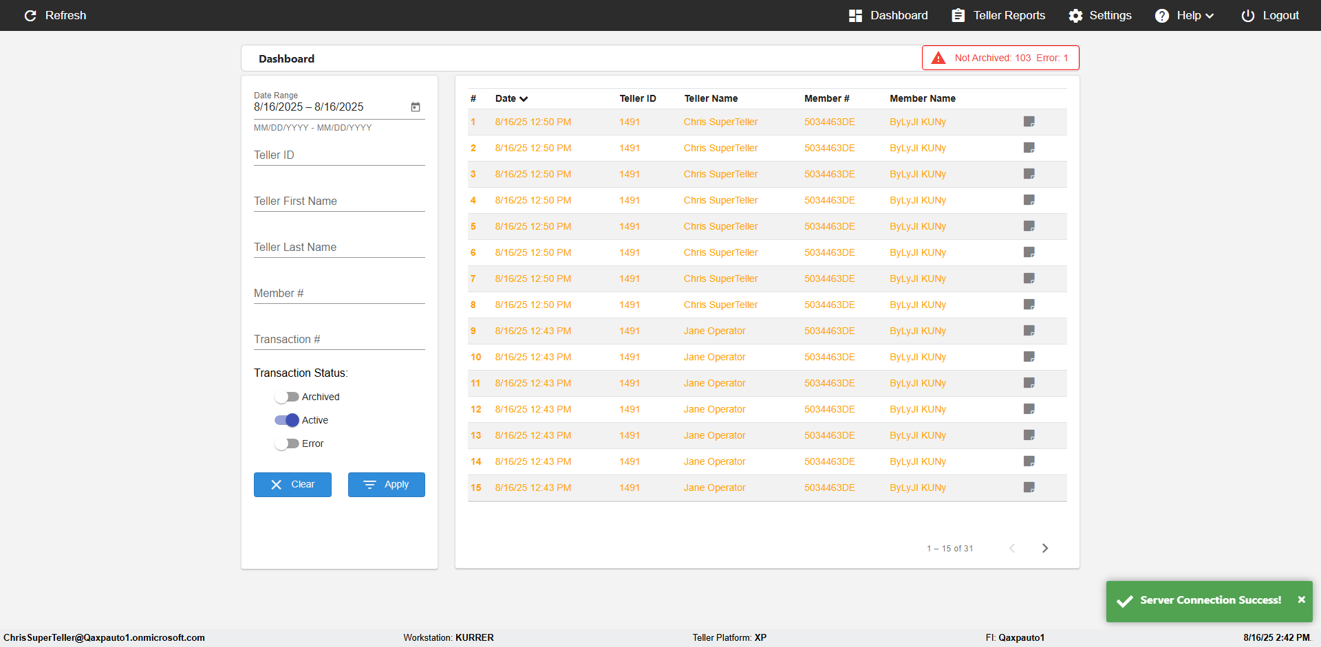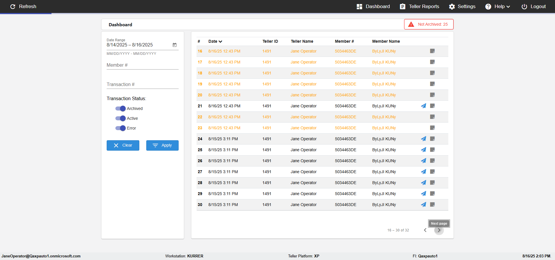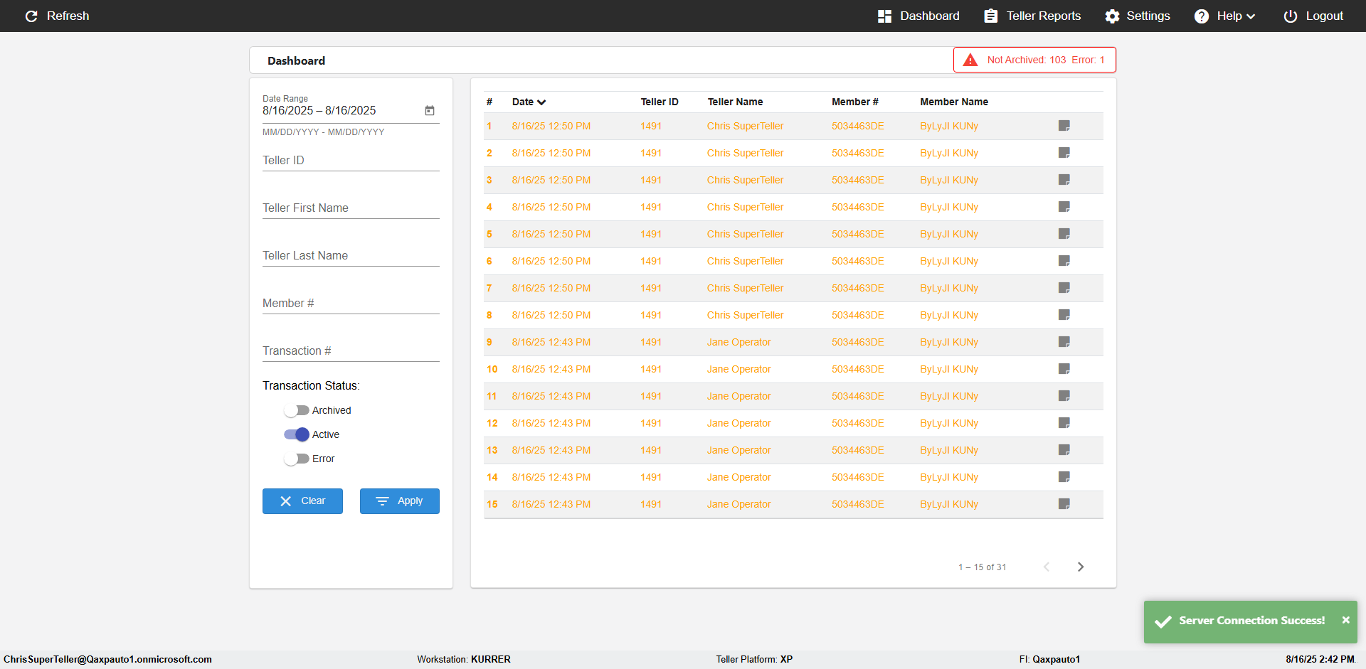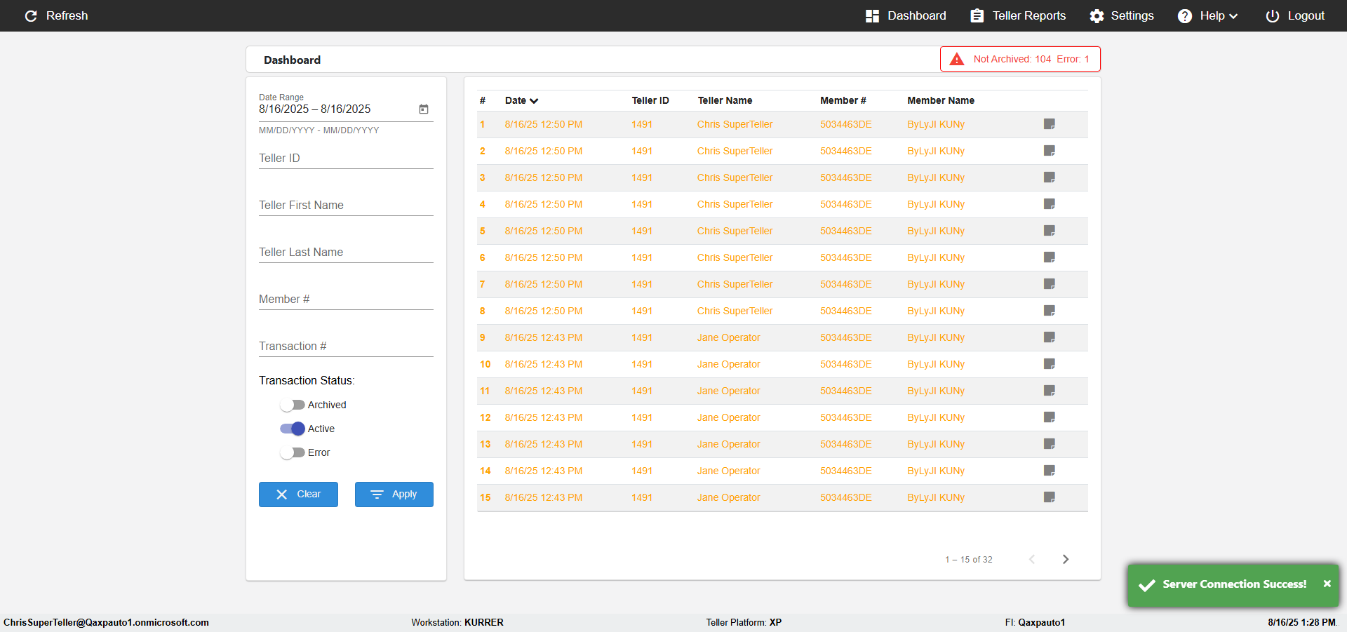 ({Description=verify Error Messages In DashBoard Page with Future From and To Date, Email=, Teller LastName=, print signatur=, errorint=2, TestID=verifyErrorMessagesInDashBoardPage, Color Transactions=, Member=5034474, UserPwd=iMM2022!, Transtatus=Archived-false;Active-true;Error-false, Receipt=, Report=, Teller=, Teller FirstName=, errorMessage=Date cannot exceed 7 days after today.;Date cannot exceed 7 days after today., Suppress=, Date=07/07/25 - 08/08/25, print Disburstments=, Print signature line=, Type=, Transaction=, Header=, Username=ChrisSuperTeller@Qaxpauto1.onmicrosoft.com, SMS=, Sign=, Scan=})