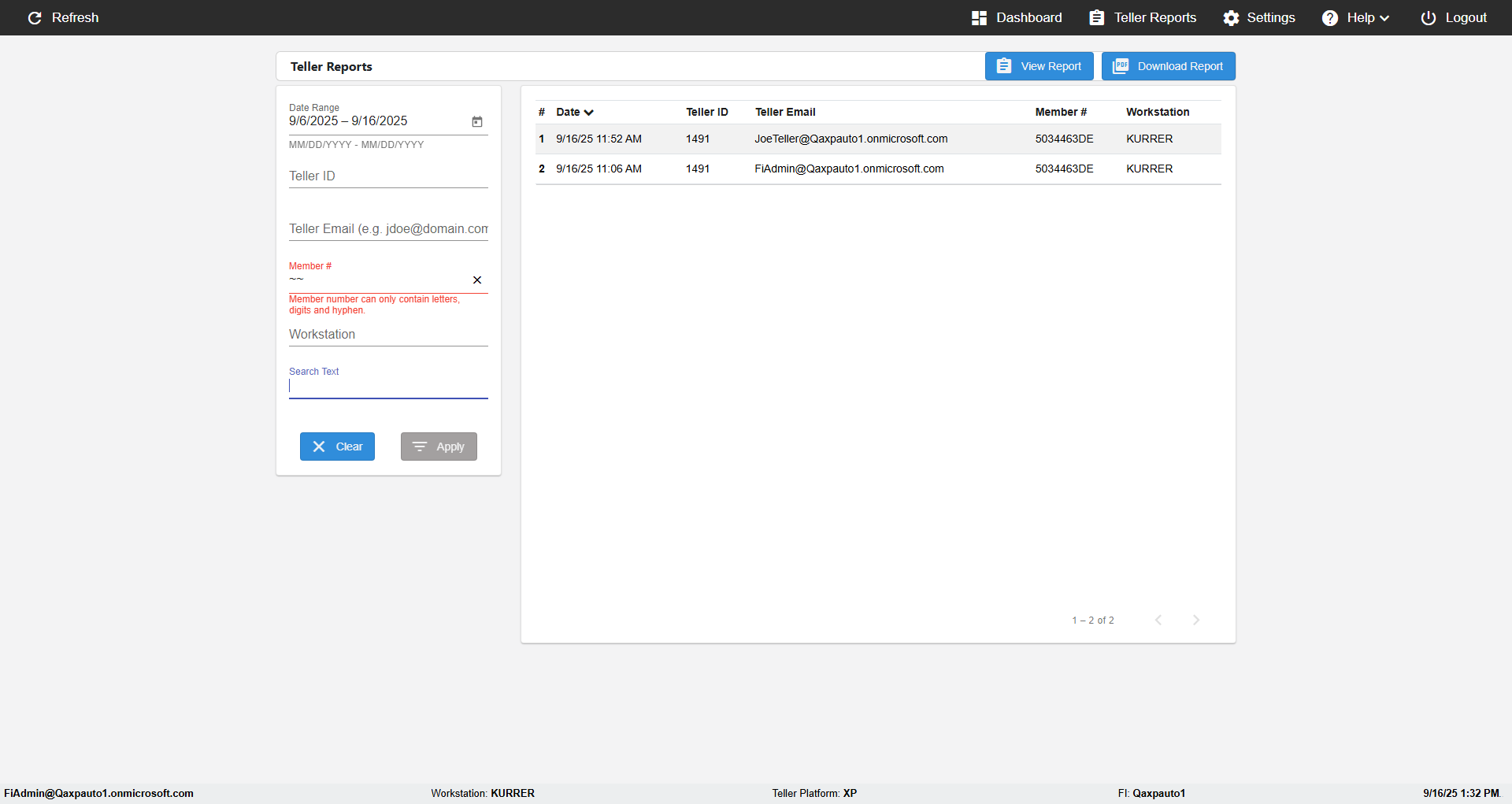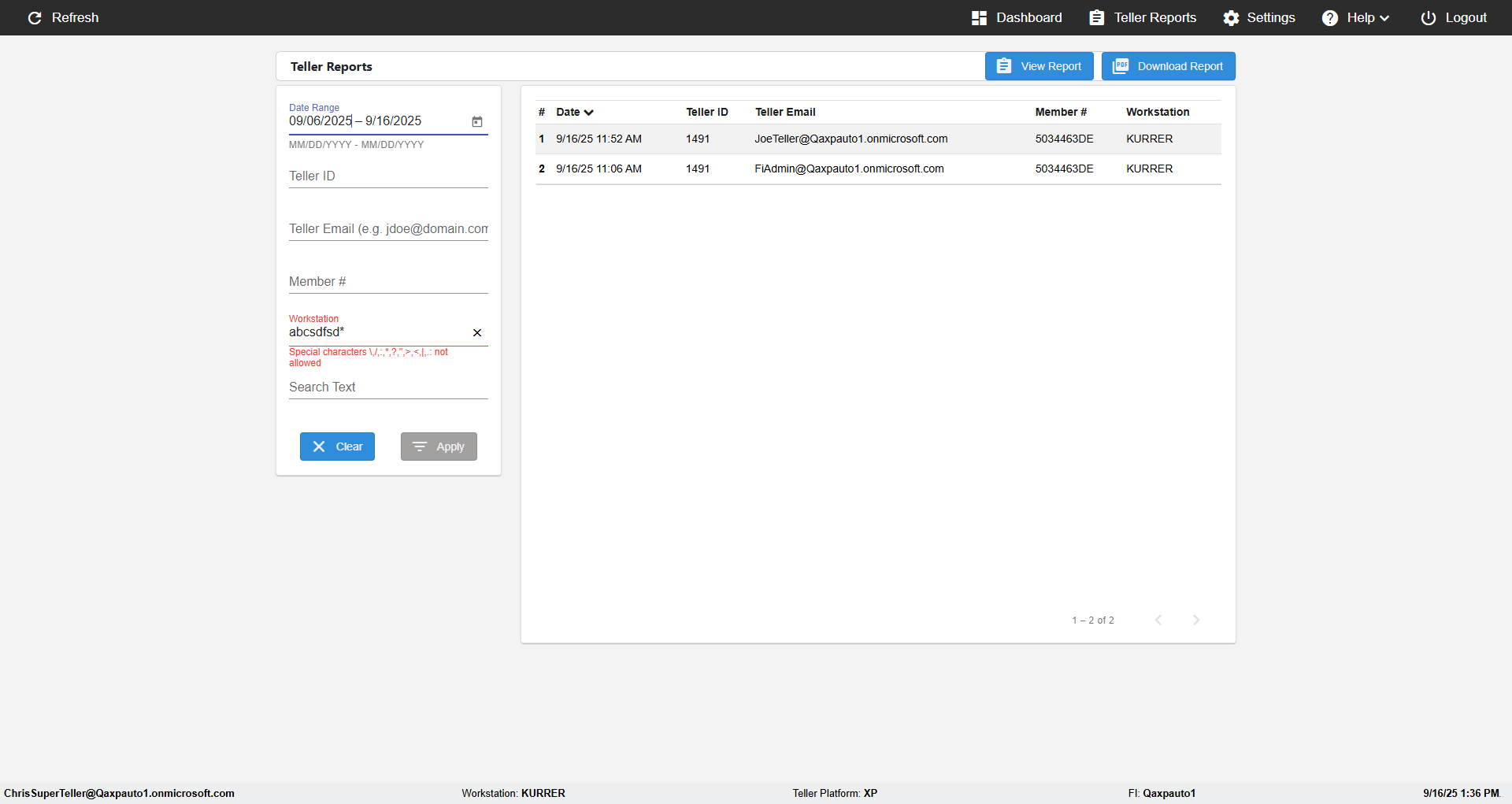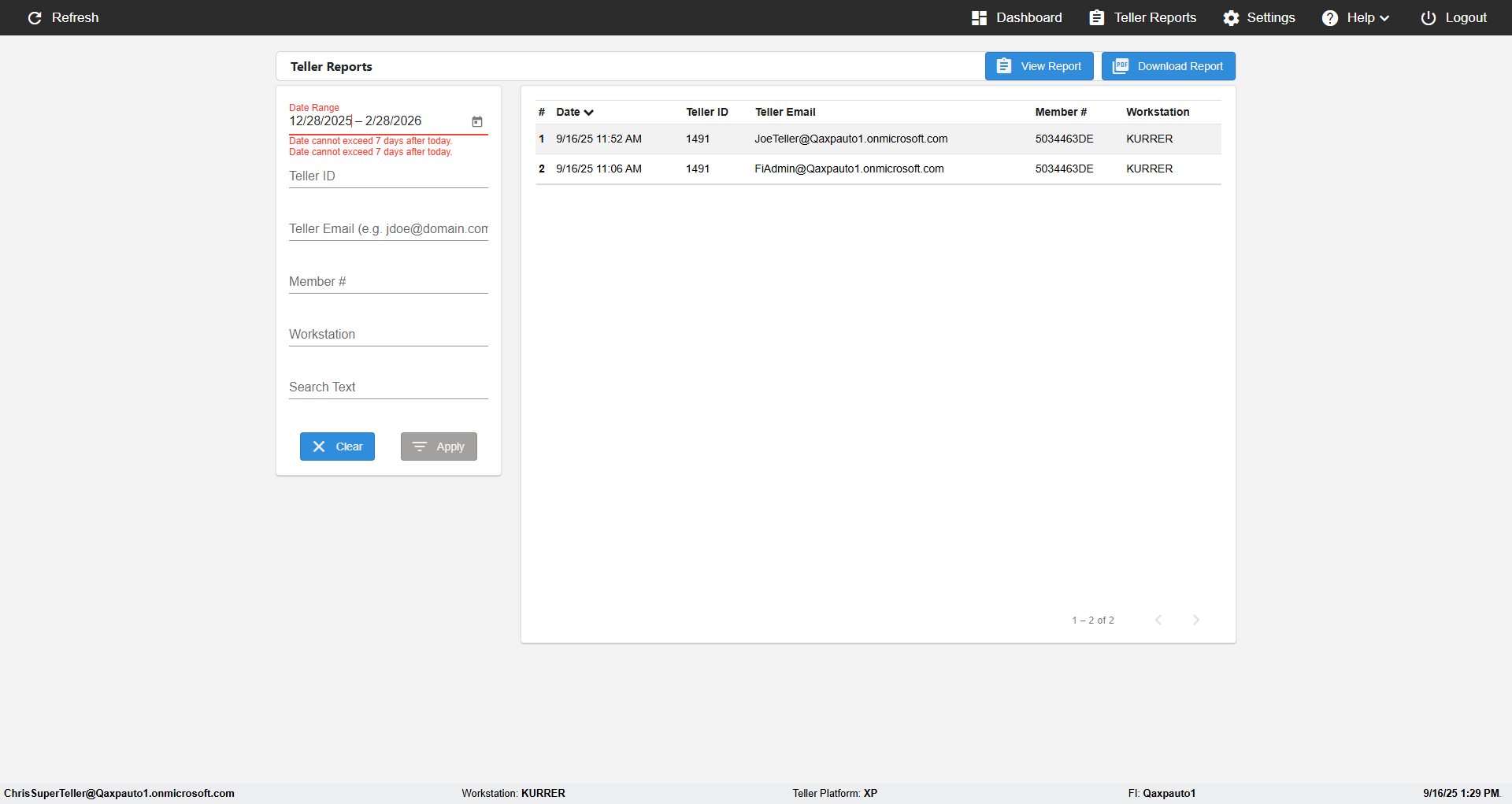 ({UserPwd=iMM2022!, Description=verify Error Messages in Report Page for Date, Teller ID=, errorMessage=Date cannot exceed 7 days after today.;Date cannot exceed 7 days after today., Teller Email=, View=, Date=12/28/2025 - 2/28/2026, Clear=, Workstation=, errorint=2, TestID=verifyErrorMessagesInReports, Transaction=, Header=, Username=ChrisSuperTeller@Qaxpauto1.onmicrosoft.com, Export=, Member #=, Search Text=, Level=})