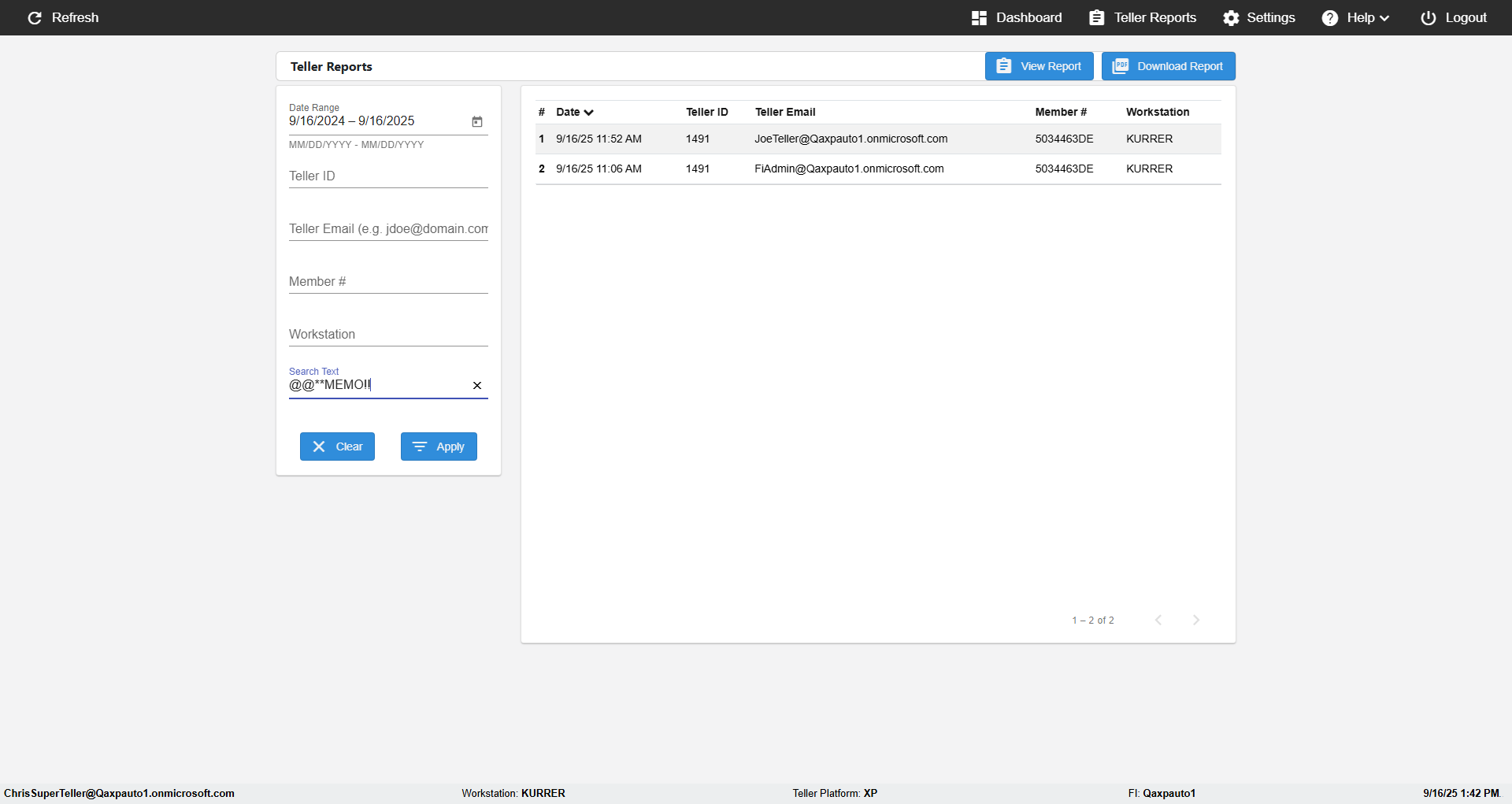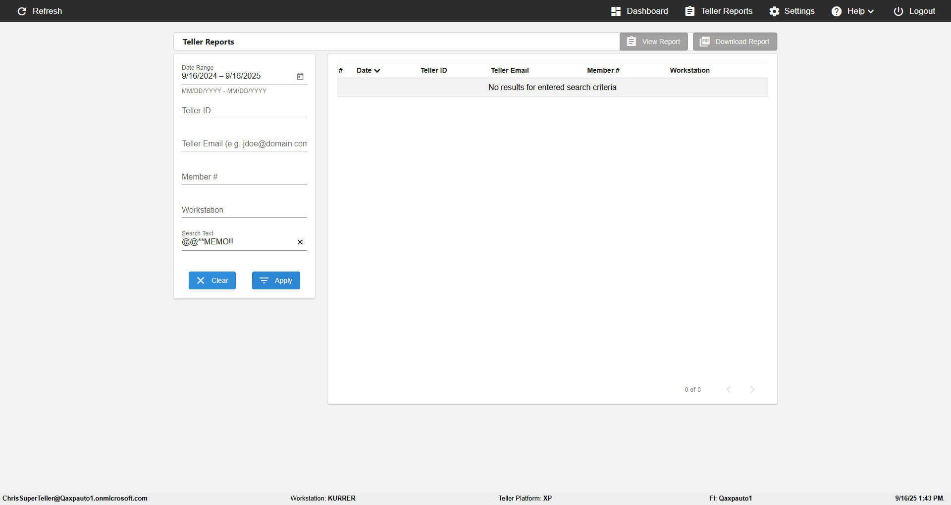 ({UserPwd=iMM2022!, Description=verify Search Elements In Report Page with Date and Email, Teller ID=, errorMessage=, Teller Email=ChrisSuperTeller@Qaxpauto.onmicrosoft.com, View=, Date=2, Clear=, Workstation=, errorint=, TestID=verifySearchInReports, Transaction=, Header=, Username=ChrisSuperTeller@Qaxpauto1.onmicrosoft.com, Export=, Member #=, Search Text=, Level=})
