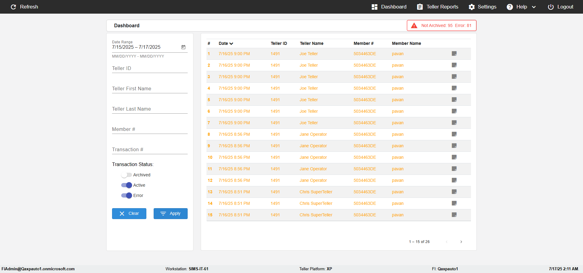 ({Description=verify Error Messages In DashBoard Page with Future From and To Date, Email=, Teller LastName=, print signatur=, errorint=2, TestID=verifyErrorMessagesInDashBoardPage, Color Transactions=, Member=5034474, UserPwd=iMM2022!, Transtatus=Archived-false;Active-true;Error-false, Receipt=, Report=, Teller=, Teller FirstName=, errorMessage=Date cannot exceed 7 days after today.;Date cannot exceed 7 days after today., Suppress=, Date=07/07/25 - 08/08/25, print Disburstments=, Print signature line=, Type=, Transaction=, Header=, Username=ChrisSuperTeller@Qaxpauto1.onmicrosoft.com, SMS=, Sign=, Scan=})