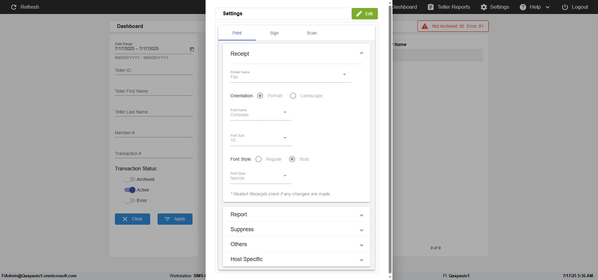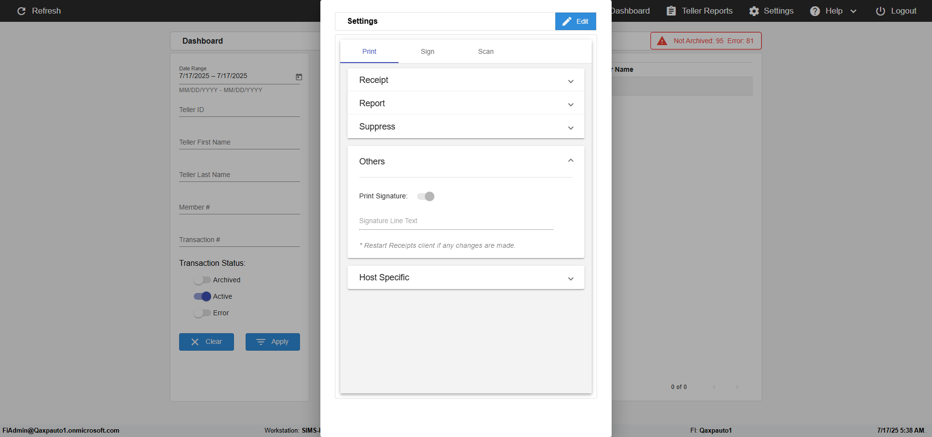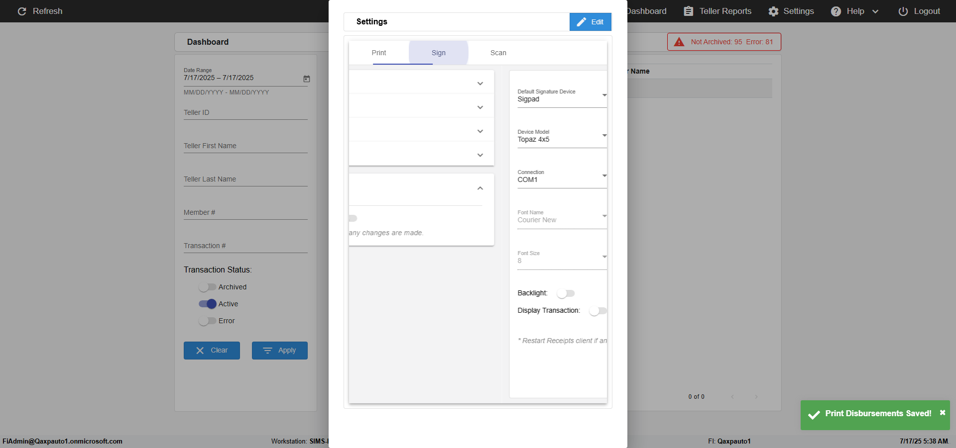 ({Description=verify Settings page In Teller Portal, Email=, Teller LastName=, print signatur=TRUE, errorint=, TestID=verifySettingsInTellerPage, Color Transactions=, Member=, UserPwd=iMM2022!, Transtatus=, Receipt=Printer Name-Fax;Name-Consolas;Size-10;Style-Bold,Narrow, Report=Printer Name-Fax;Orientation-Landscape;Name-Consolas;Size-10;Style-Bold, Teller=, Teller FirstName=, errorMessage=, Suppress=Log1-false;Log2-false;CuAddress-false;Member Address-false, Date=, print Disburstments=FALSE, Print signature line=print the sign, Type=, Transaction=, Header=, Username=fiAdmin@Qaxpauto1.onmicrosoft.com, SMS=, Sign=Default Signature Device-Sigpad;Device Model-Topaz 4x5;Connection-COM1;Backlight-true, Scan=Scanner Type-ScanShell 3000D;Image Mode-Singleside;USB Connection-false})