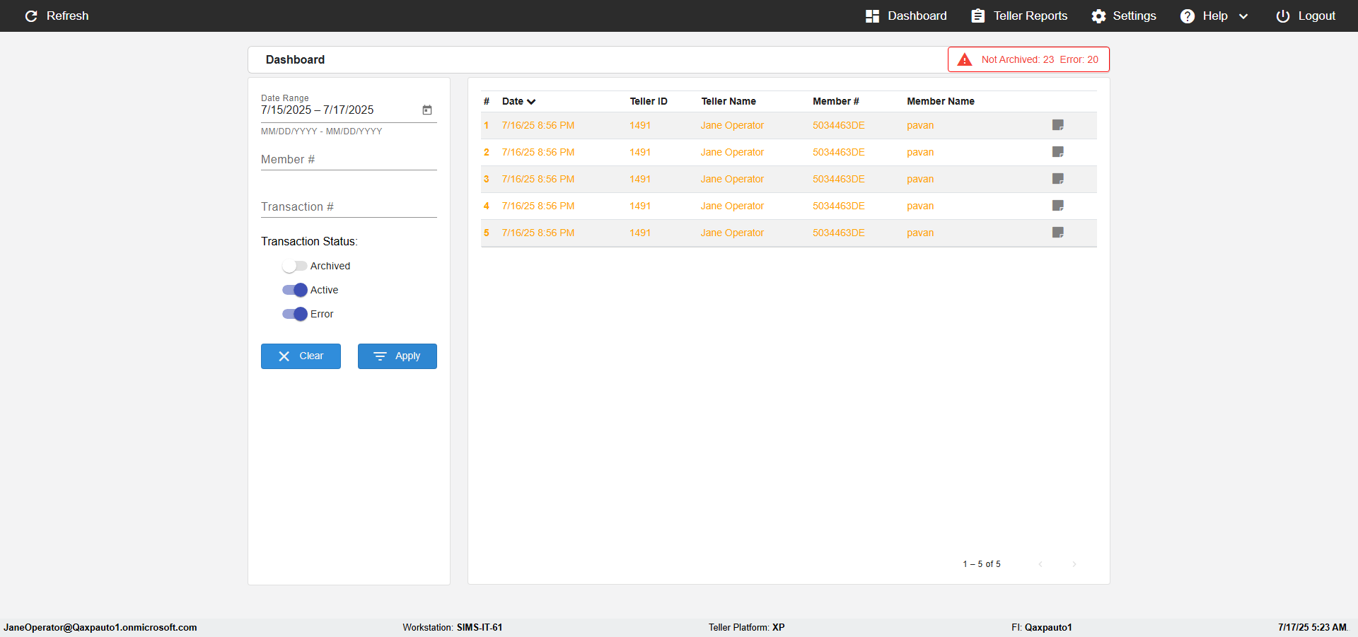 (Verify negative/invalid Search of the Date,Teller,Teller name,Member name in DashBoard page)