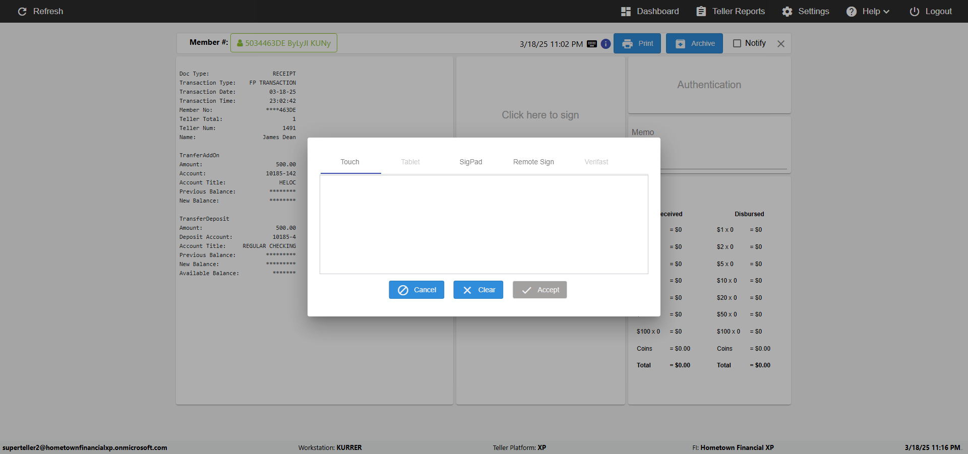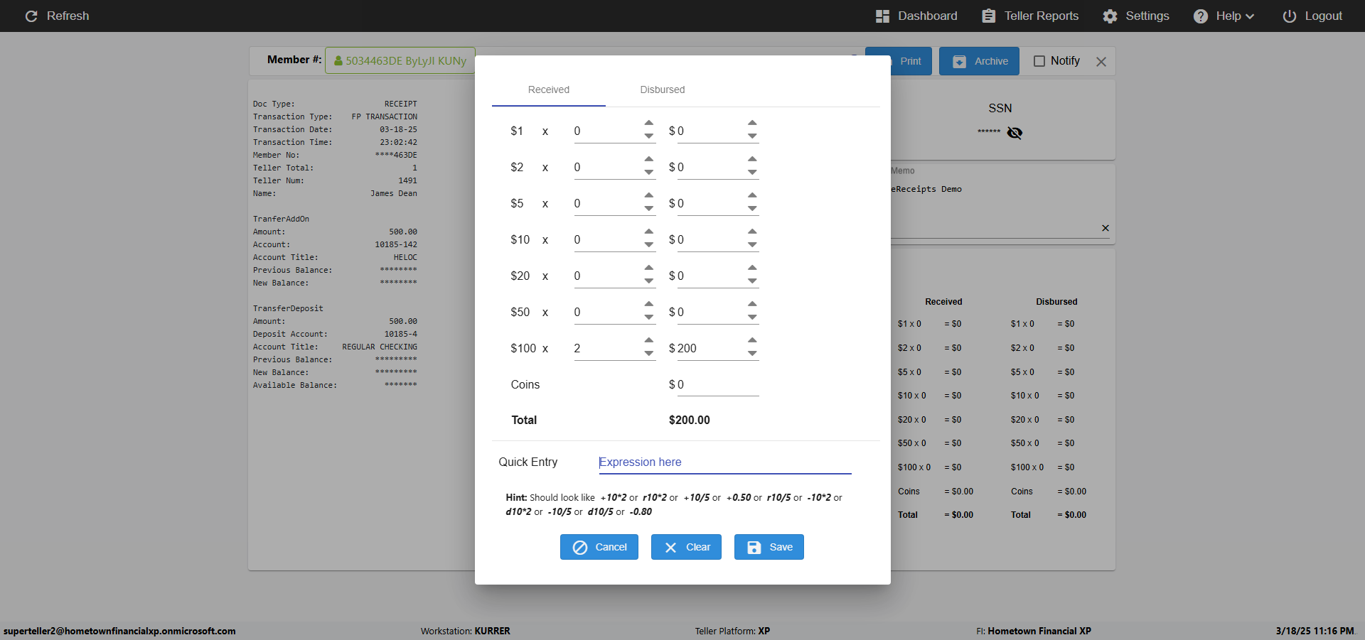 ({Toggel=, Archived Transactions=yes, Description=verify End TO End Test OF Normal Teller In Ereceipt Page, Email=FALSE, Archive=TRUE, Document Type=SSN, Notify=TRUE, SignatureTab=Touch,, DisbursedExpression=|-10*5, Operation=, Teller LastName=, Disbursed cash=1-1|2-2|5-2|10-1|20-2|50-1|100-1|Coins-3, errorint=, TestID=verifyEndTOEndTestOFNormalTellerInEreceipt, Print=FALSE, DisbursedExpressionValue=FALSE, Phone=(732) 890-6074, ReceivedCashValue=FALSE, Member=5034463, UserPwd=iMM2025!, Transtatus=Archived-false;Active-true;Error-false, Docment ID=216554, Teller=, Teller FirstName=, errorMessage=, ReceivedExpressionValue=TRUE, Date=, Platfrom=, Received cash=1-1|2-2|5-2|10-1|20-2|50-1|100-1|Coins-3, Transaction=, Header=, Expression=, Username=superteller2@hometownfinancialxp.onmicrosoft.com, DisbursedCashValue=TRUE, FullName=, ReceivedExpression=|+100*2, SMS=FALSE, Memo=eReceipts Demo})