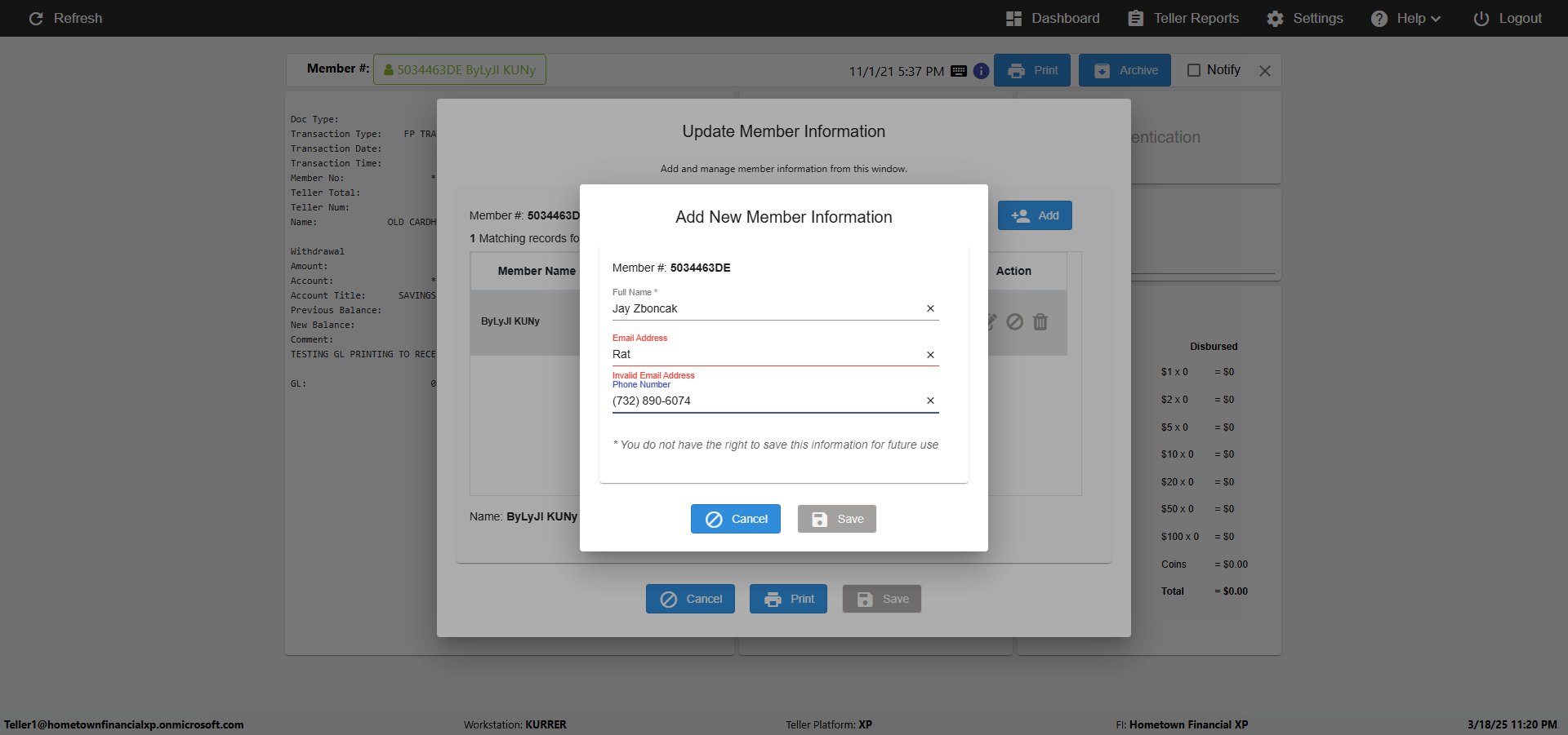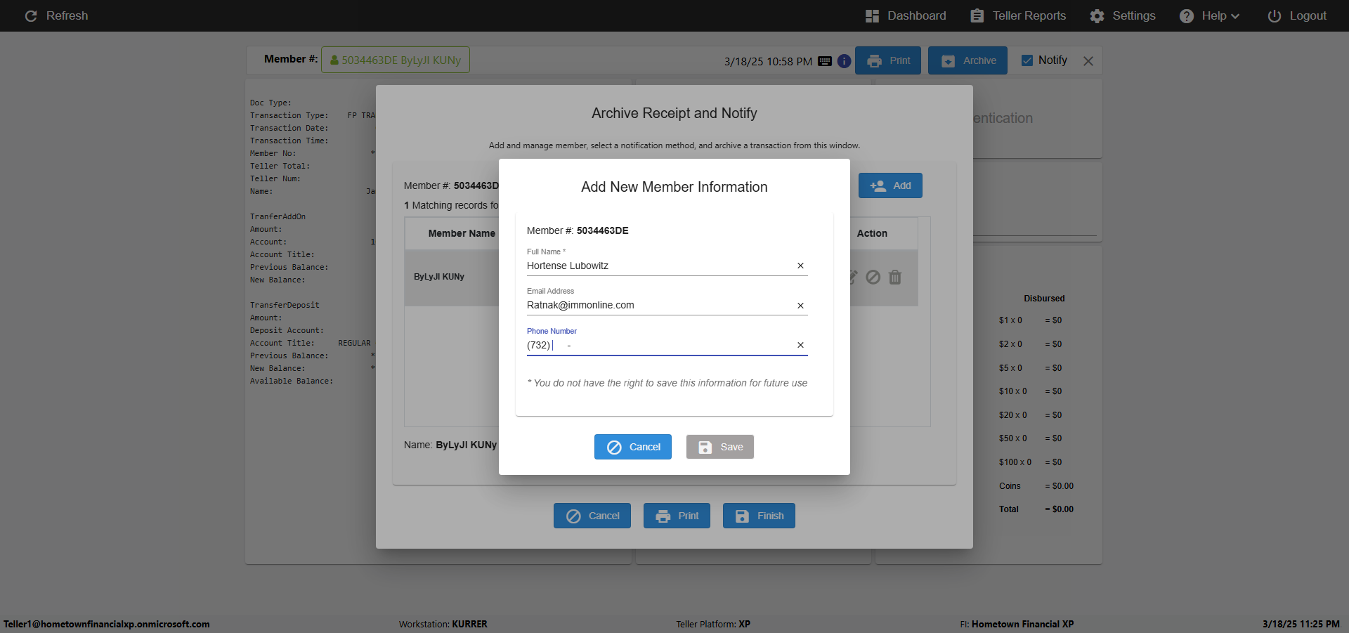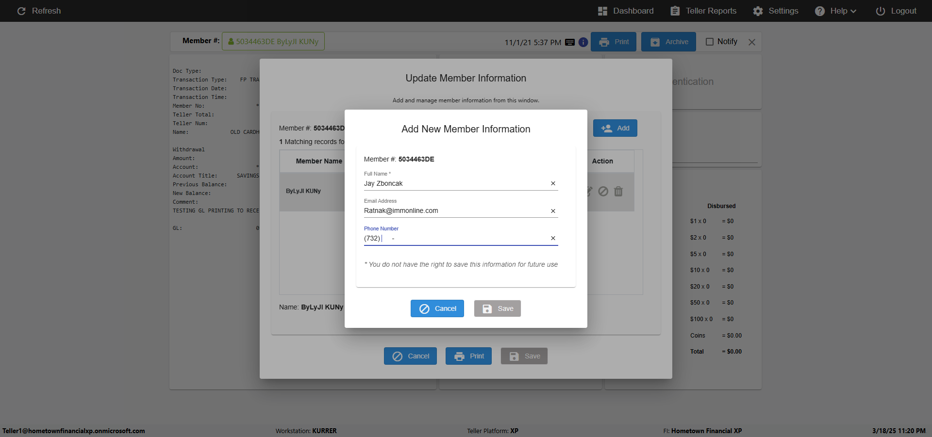 ({Toggel=TRUE, Archived Transactions=no, Description=verify Normal MemberID And Archive Information Update (Use Normal only), Email=Ratnak@immonline.com, Archive=, Document Type=, Notify=, SignatureTab=, DisbursedExpression=, Operation=, Teller LastName=, Disbursed cash=, errorint=, TestID=verifyNormalMemberAddUpdateContactInfo, Print=, DisbursedExpressionValue=, Phone=(732) 890-6074, ReceivedCashValue=, Member=5034463, UserPwd=iMM2025!, Transtatus=Archived-false;Active-true;Error-false, Docment ID=, Teller=, Teller FirstName=, errorMessage=, ReceivedExpressionValue=, Date=11/01/2021 - 11/20/2021, Platfrom=, Received cash=, Transaction=, Header=, Expression=, Username=Teller1@hometownfinancialxp.onmicrosoft.com, DisbursedCashValue=, FullName=Johna, ReceivedExpression=, SMS=, Memo=})