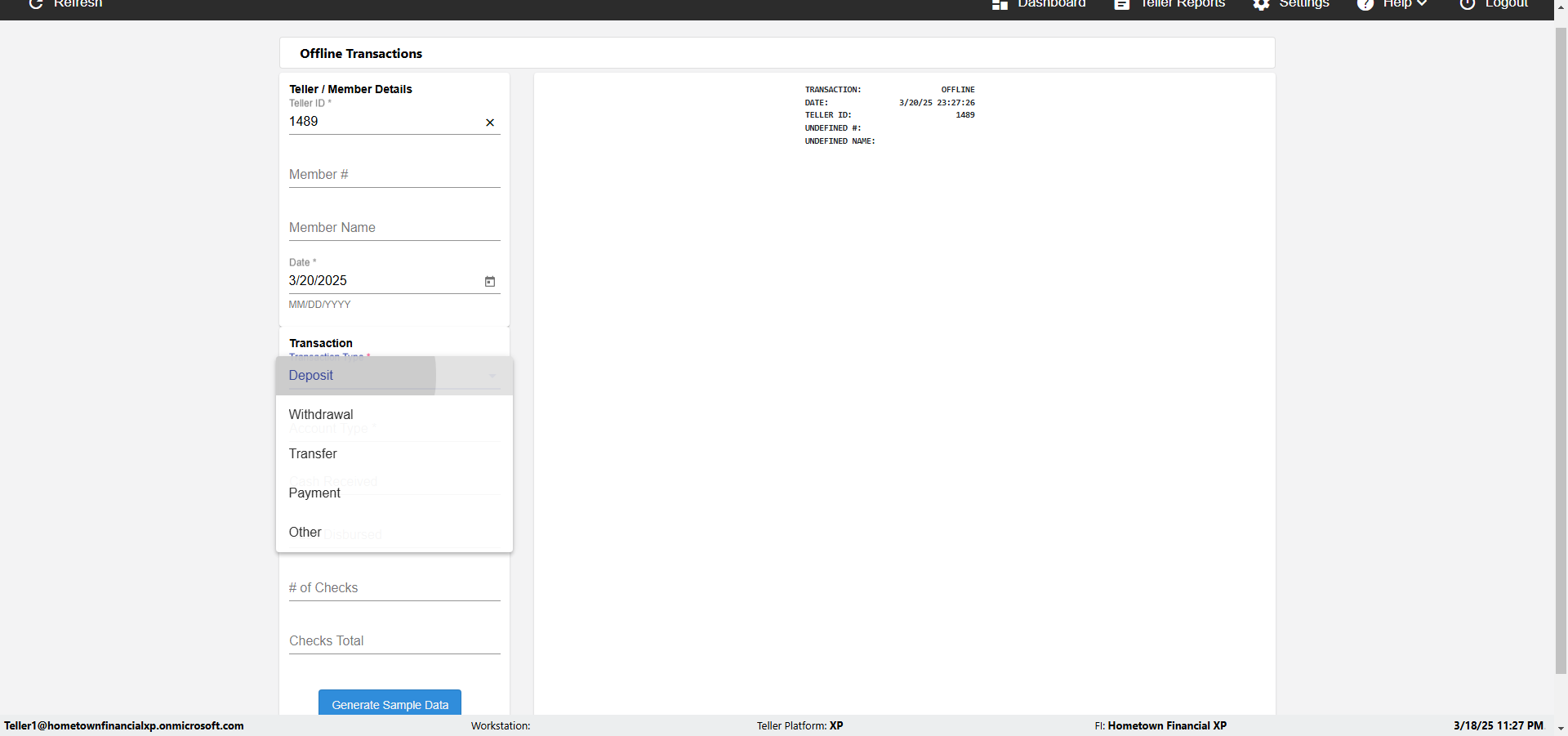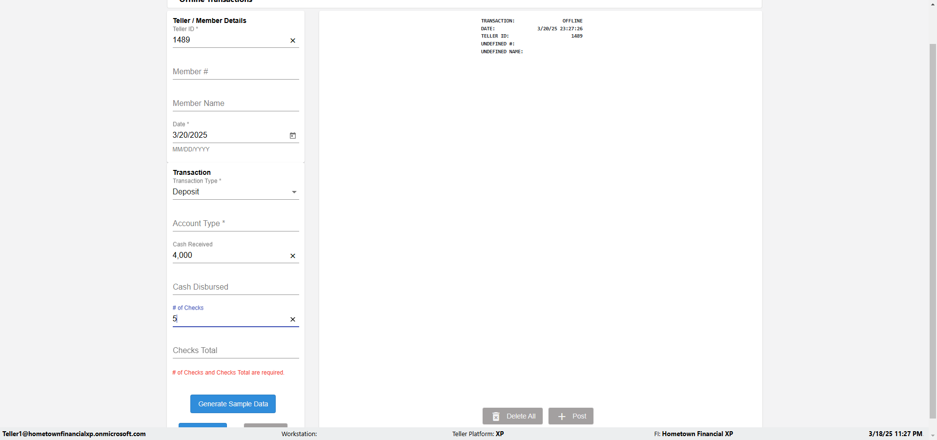 ({Description=Verify deposit in Offline Transaction demo, From Account #=1212, Teller ID=456346, To Account #=1414, Amount=222, errorMessage=, Transaction Type=Deposit, userpwd=iMM2025!, # of Checks=5, Member#=6767, Member Name=Bonita, Cash Received=4000, From Account Type=checking, Date=2, To Account Type=savings, errorint=, TestID=verifyOfflineDepositTransaction, offlineurl=/offlinereceipt/demo, Cash Disbursed=2000, Account Type=Saving, Checks Total=600, username=Teller1@hometownfinancialxp.onmicrosoft.com})