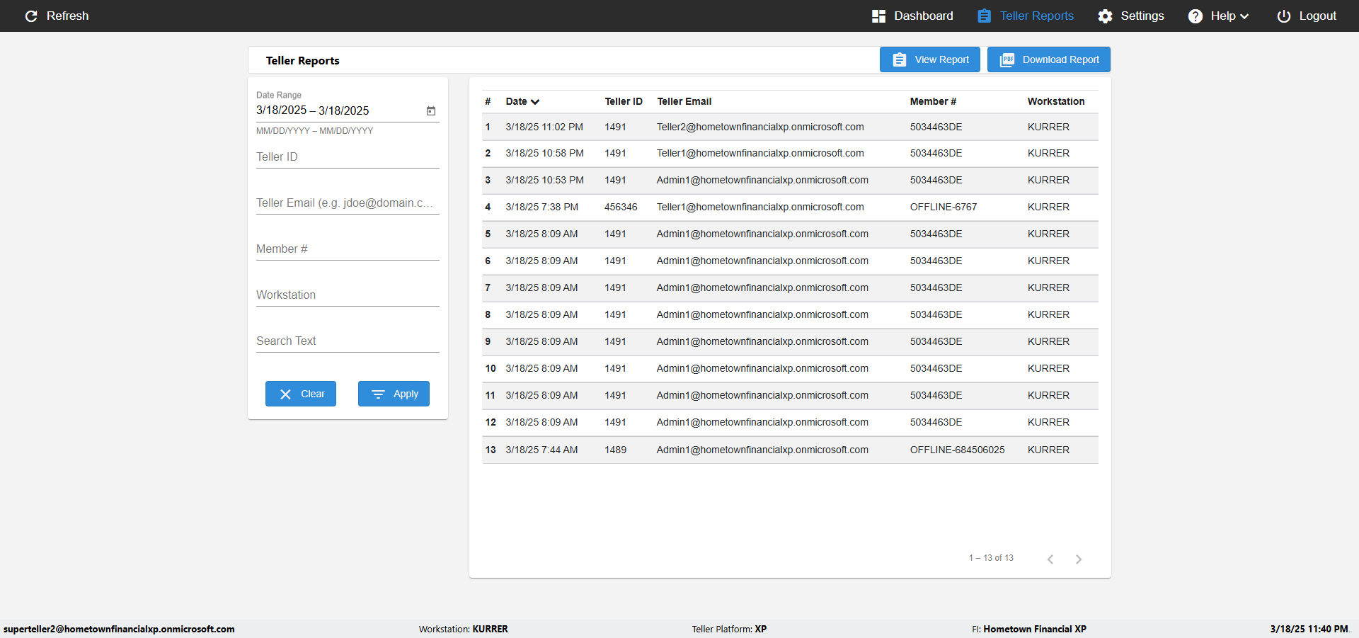 ({UserPwd=iMM2025!, Description=verify UI Elements In Report Page, Teller ID=, errorMessage=, Teller Email=, View=, Date=25, Clear=, Workstation=, errorint=, TestID=verifyUIElementsInReports, Transaction=, Header=, Username=superteller2@hometownfinancialxp.onmicrosoft.com, Export=, Member #=, Search Text=, Level=})
