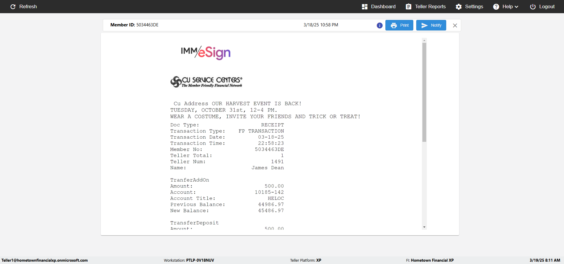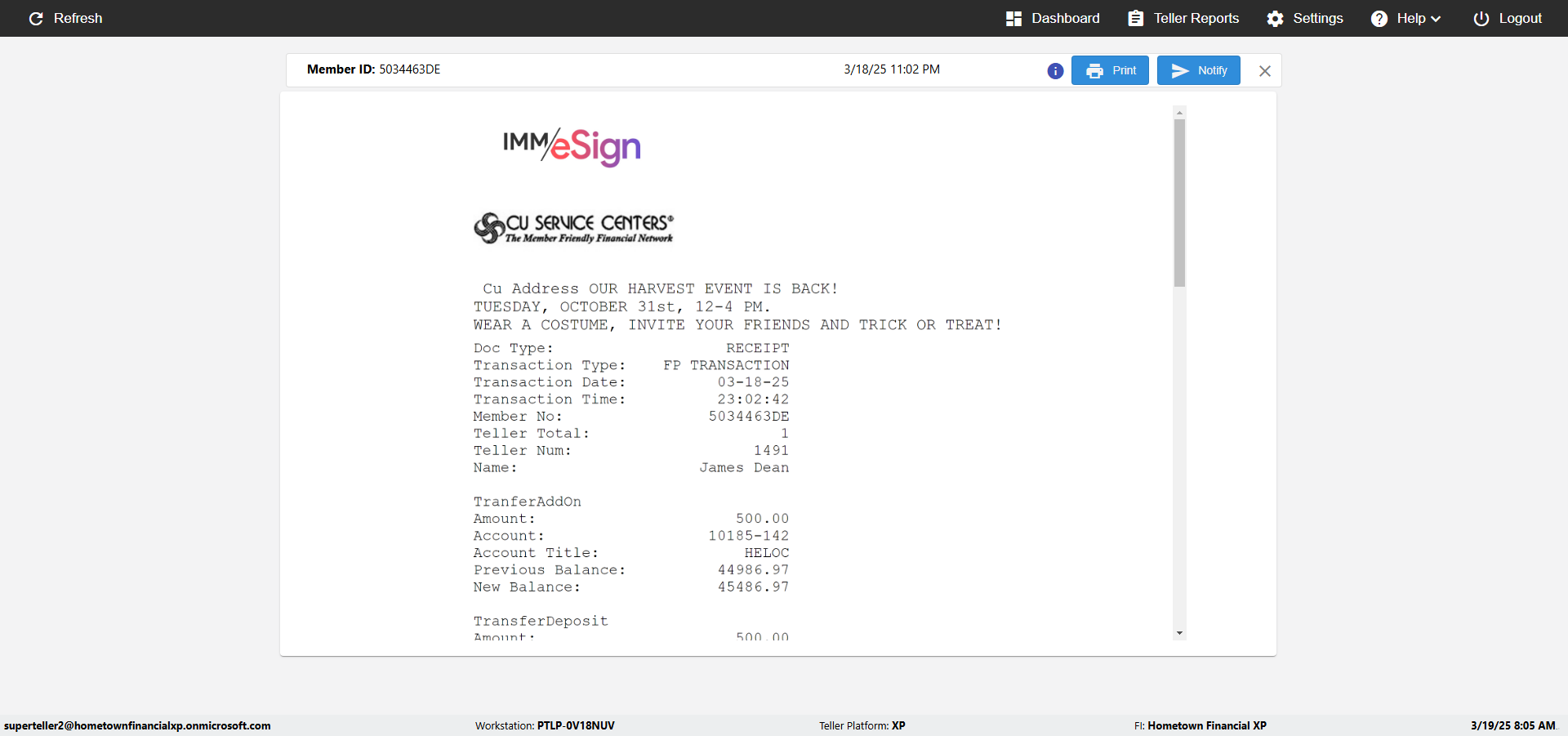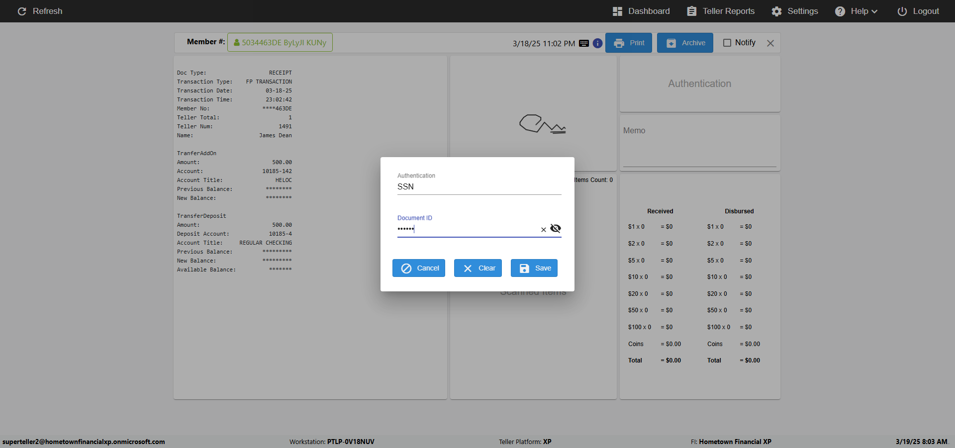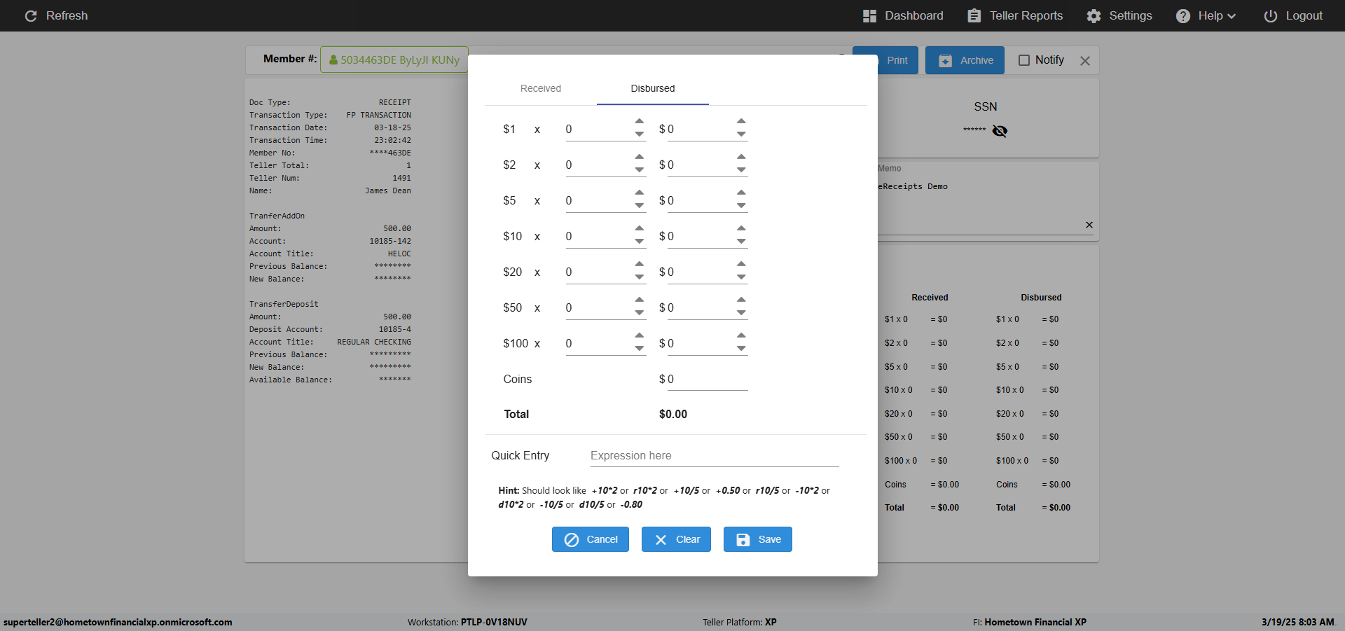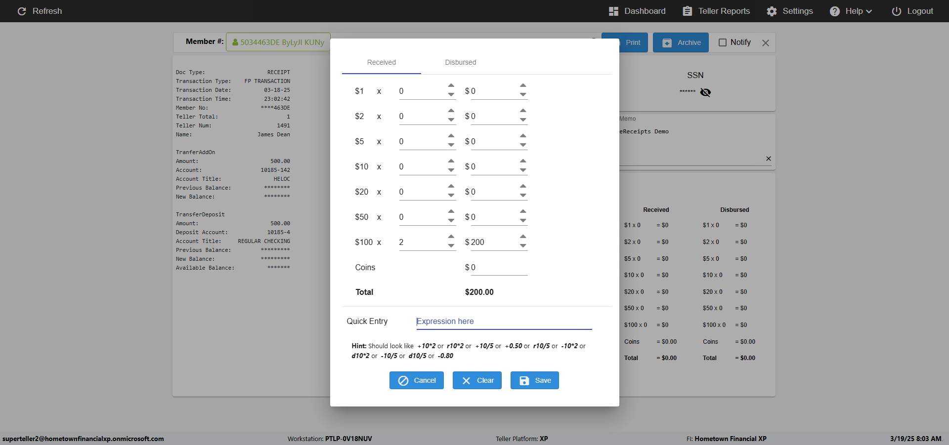 ({Toggel=, Archived Transactions=yes, Description=verify End TO End Test OF Normal Teller In Ereceipt Page, Email=FALSE, Archive=TRUE, Document Type=SSN, Notify=TRUE, SignatureTab=Touch,, DisbursedExpression=|-10*5, Operation=, Teller LastName=, Disbursed cash=1-1|2-2|5-2|10-1|20-2|50-1|100-1|Coins-3, errorint=, TestID=verifyEndTOEndTestOFNormalTellerInEreceipt, Print=FALSE, DisbursedExpressionValue=FALSE, Phone=(732) 890-6074, ReceivedCashValue=FALSE, Member=5034463, UserPwd=iMM2025!, Transtatus=Archived-false;Active-true;Error-false, Docment ID=216554, Teller=, Teller FirstName=, errorMessage=, ReceivedExpressionValue=TRUE, Date=, Platfrom=, Received cash=1-1|2-2|5-2|10-1|20-2|50-1|100-1|Coins-3, Transaction=, Header=, Expression=, Username=superteller2@hometownfinancialxp.onmicrosoft.com, DisbursedCashValue=TRUE, FullName=, ReceivedExpression=|+100*2, SMS=FALSE, Memo=eReceipts Demo})