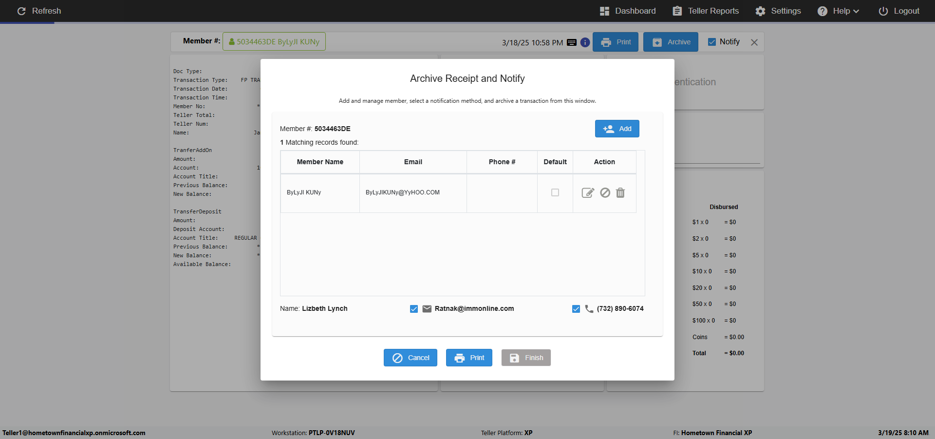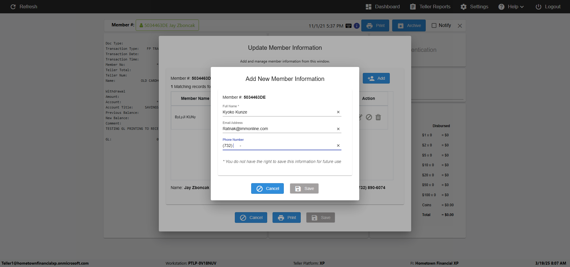 ({Toggel=TRUE, Archived Transactions=no, Description=verify Normal MemberID And Archive Information Update (Use Normal only), Email=Ratnak@immonline.com, Archive=, Document Type=, Notify=, SignatureTab=, DisbursedExpression=, Operation=, Teller LastName=, Disbursed cash=, errorint=, TestID=verifyNormalMemberAddUpdateContactInfo, Print=, DisbursedExpressionValue=, Phone=(732) 890-6074, ReceivedCashValue=, Member=5034463, UserPwd=iMM2025!, Transtatus=Archived-false;Active-true;Error-false, Docment ID=, Teller=, Teller FirstName=, errorMessage=, ReceivedExpressionValue=, Date=11/01/2021 - 11/20/2021, Platfrom=, Received cash=, Transaction=, Header=, Expression=, Username=Teller1@hometownfinancialxp.onmicrosoft.com, DisbursedCashValue=, FullName=Johna, ReceivedExpression=, SMS=, Memo=})