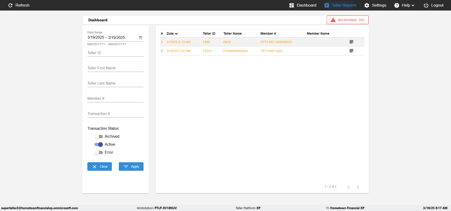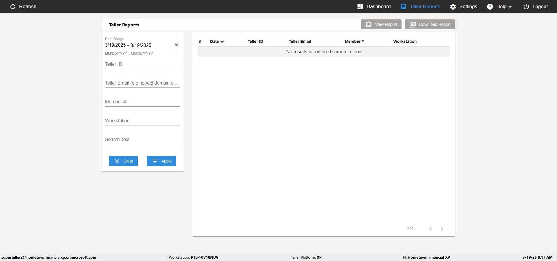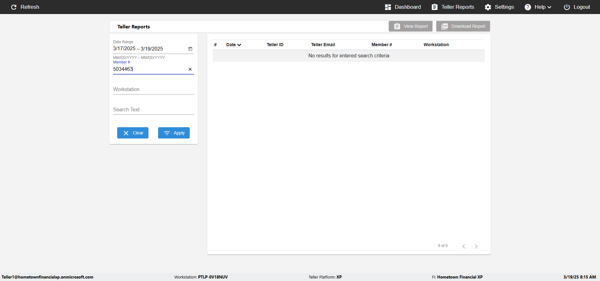 ({UserPwd=iMM2025!, Description=verify Search Elements In Report Page Teller ID, Teller ID=, errorMessage=, Teller Email=, View=, Date=2, Clear=, Workstation=, errorint=, TestID=verifySearchInReports, Transaction=, Header=, Username=Teller1@hometownfinancialxp.onmicrosoft.com, Export=, Member #=5034463, Search Text=, Level=})