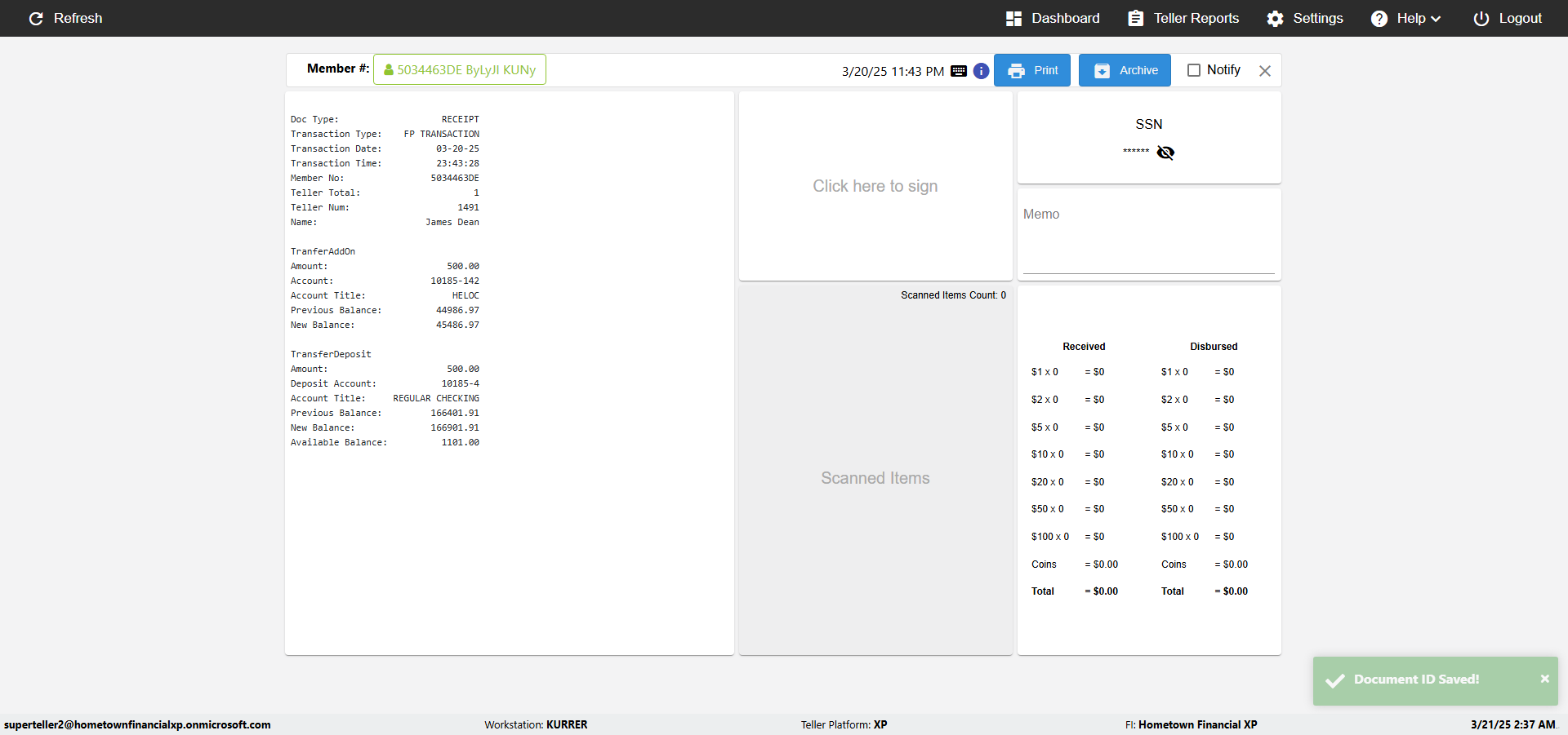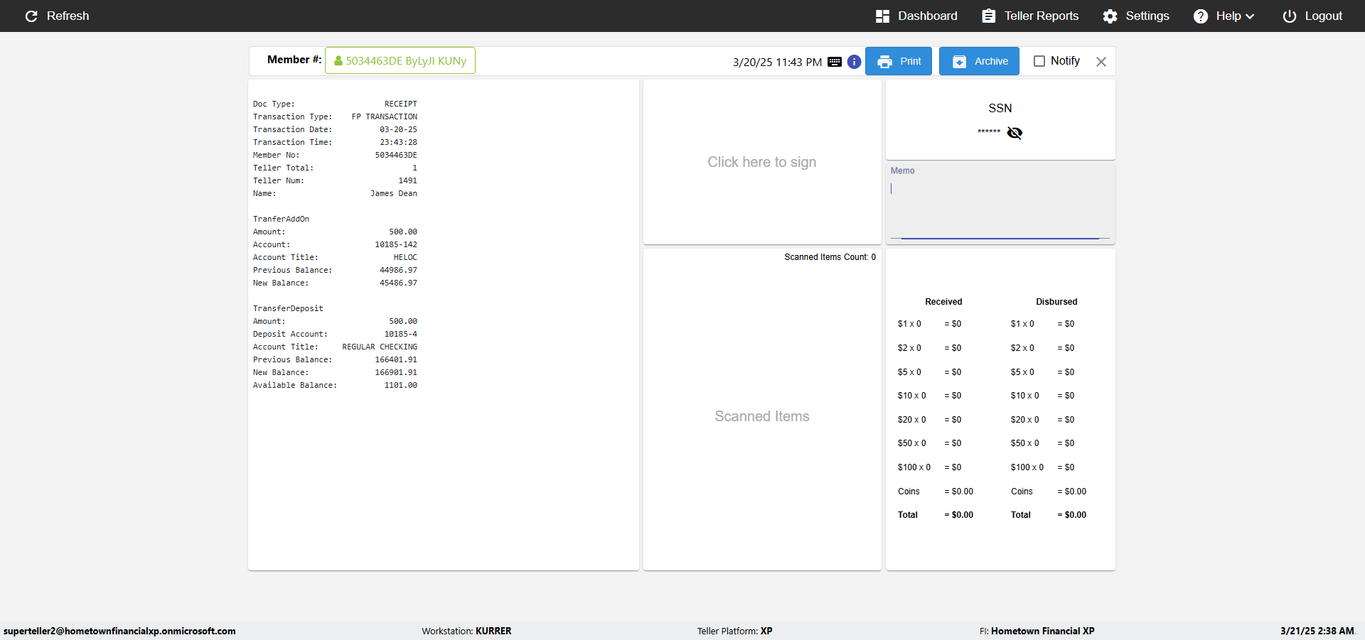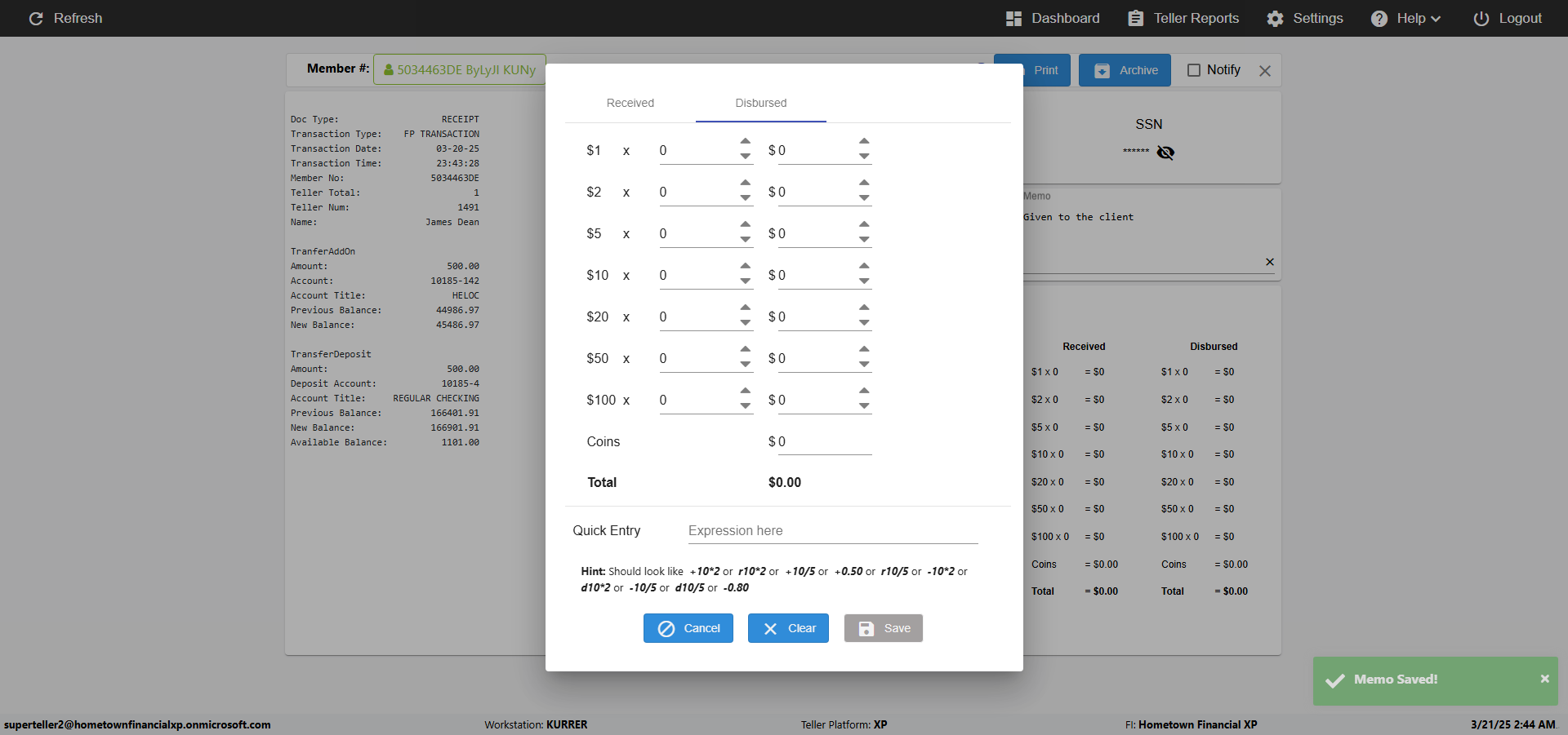 | {Toggel=, Archived Transactions=yes, Description=verify End TO End Test OF Normal Teller In Ereceipt Page, Email=FALSE, Archive=TRUE, Document Type=SSN, Notify=TRUE, SignatureTab=Touch,, DisbursedExpression=|-10*5, Operation=, Teller LastName=, Disbursed cash=1-1|2-2|5-2|10-1|20-2|50-1|100-1|Coins-3, errorint=, TestID=verifyEndTOEndTestOFNormalTellerInEreceipt, Print=FALSE, DisbursedExpressionValue=FALSE, Phone=(555) 021-3315, ReceivedCashValue=FALSE, Member=, UserPwd=iMM2025!, Transtatus=Archived-false;Active-true;Error-false, Docment ID=216554, Teller=, Teller FirstName=, errorMessage=, ReceivedExpressionValue=TRUE, Date=, Platfrom=, Received cash=1-1|2-2|5-2|10-1|20-2|50-1|100-1|Coins-3, Transaction=, Header=, Expression=, Username=superteller2@hometownfinancialxp.onmicrosoft.com, DisbursedCashValue=TRUE, FullName=, ReceivedExpression=|+100*2, SMS=FALSE, Memo=eReceipts Demo} |