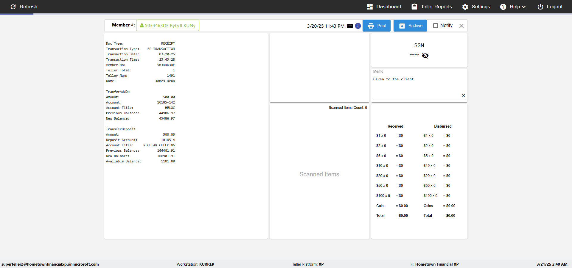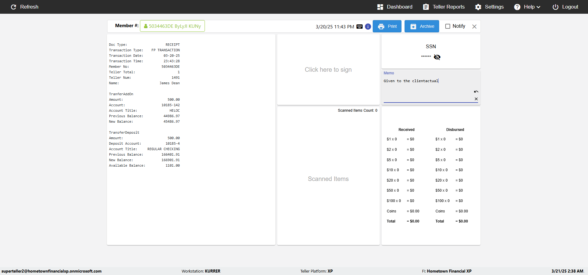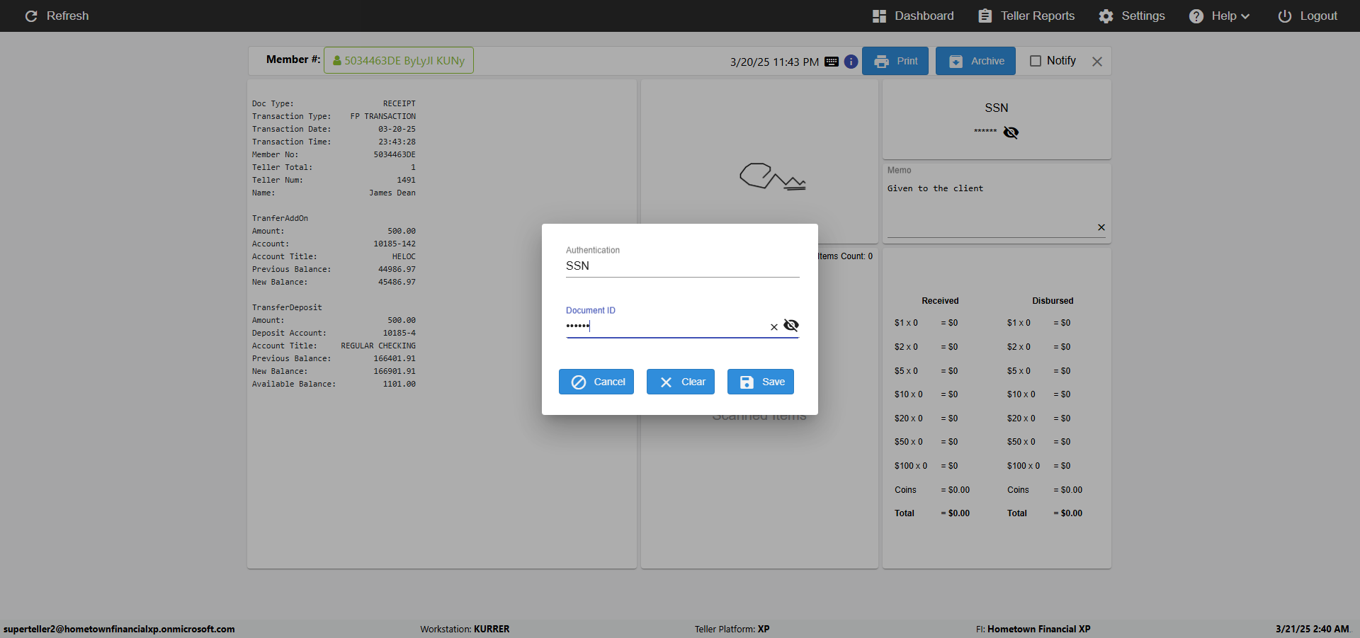 | {Toggel=, Archived Transactions=no, Description=, Email=, Archive=, Document Type=SSN, Notify=, SignatureTab=, DisbursedExpression=, Operation=, Teller LastName=, Disbursed cash=, errorint=, TestID=verifyAuthenticationMemoAndScannedItemscardInReceiptPage, Print=, DisbursedExpressionValue=, Phone=, ReceivedCashValue=, Member=, UserPwd=iMM2025!, Transtatus=Archived-false;Active-true;Error-false, Docment ID=216554, Teller=, Teller FirstName=, errorMessage=, ReceivedExpressionValue=, Date=, Platfrom=, Received cash=, Transaction=, Header=, Expression=, Username=superteller2@hometownfinancialxp.onmicrosoft.com, DisbursedCashValue=, FullName=, ReceivedExpression=, SMS=, Memo=Given to the client} |