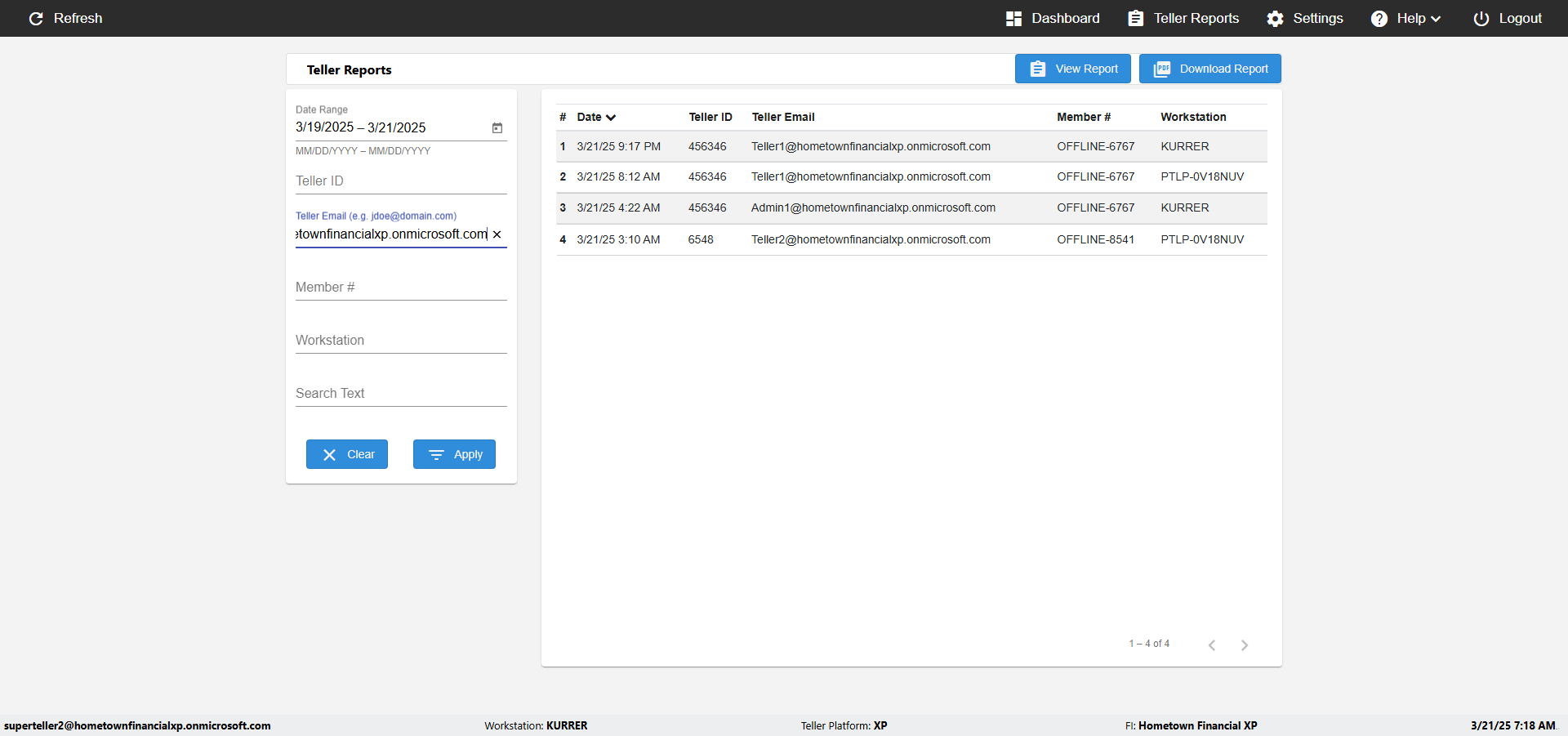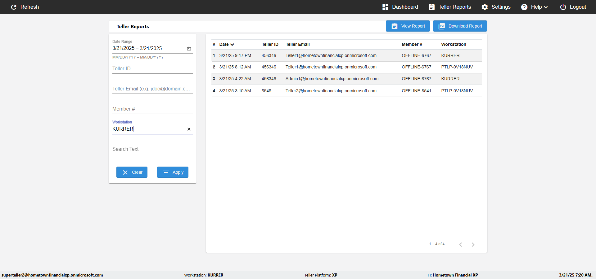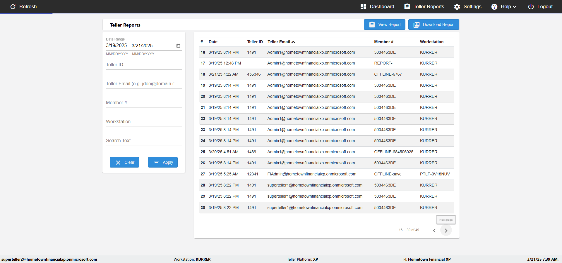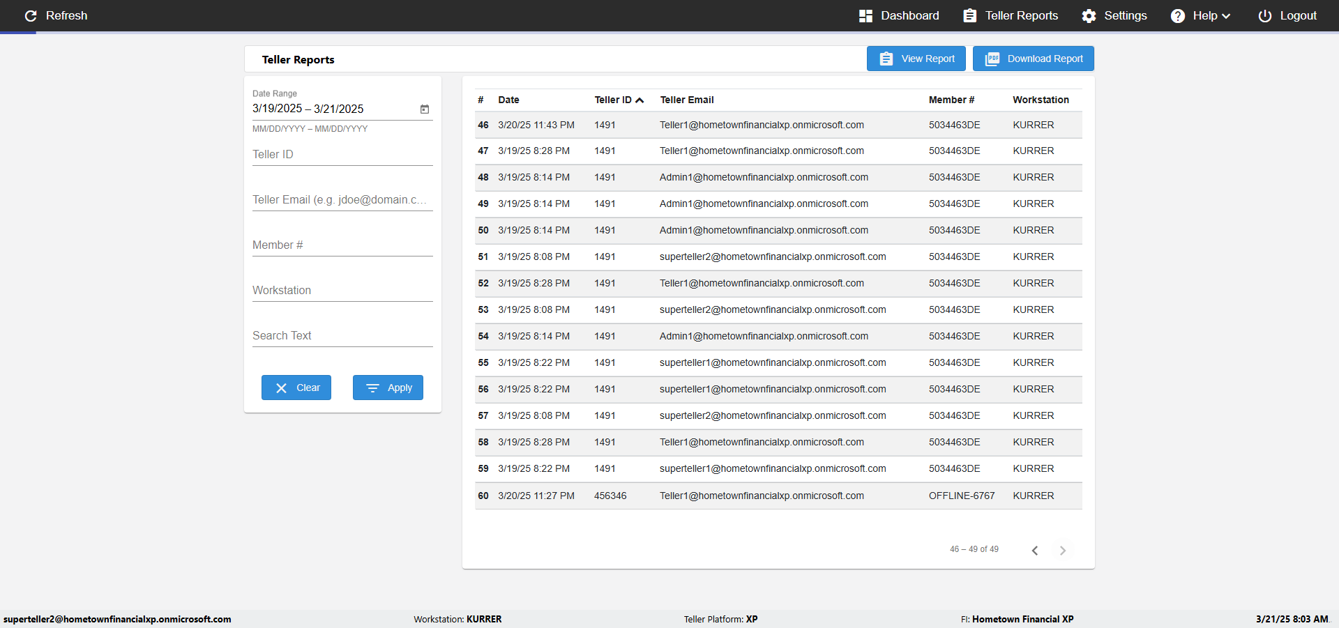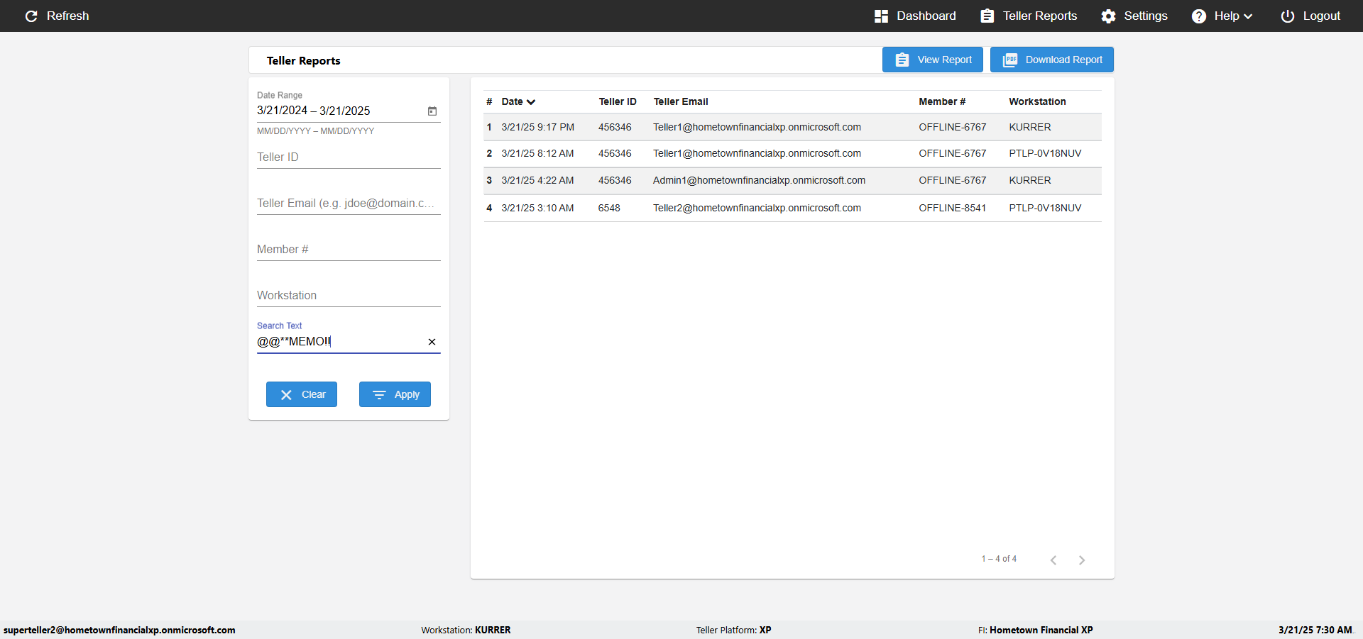| {UserPwd=iMM2025!, Description=verify Search Elements In Report Page with Date and Teller Email, Teller ID=, errorMessage=, Teller Email=, View=, Date=2, Clear=, Workstation=, errorint=, TestID=verifySortingInReports, Transaction=, Header=Teller Email,, Username=superteller2@hometownfinancialxp.onmicrosoft.com, Export=, Member #=, Search Text=, Level=} |