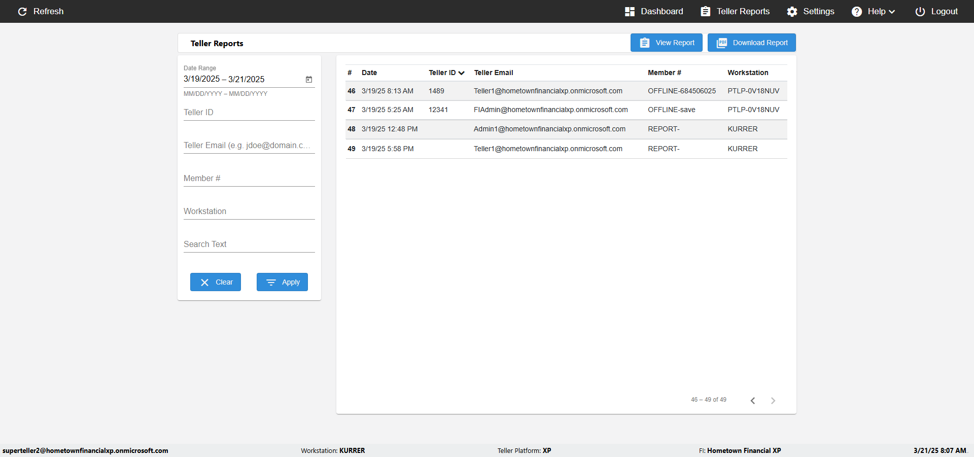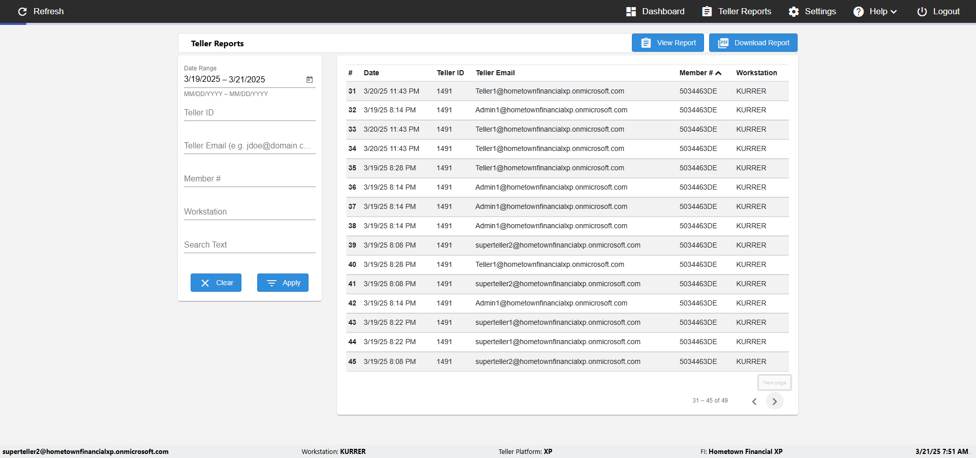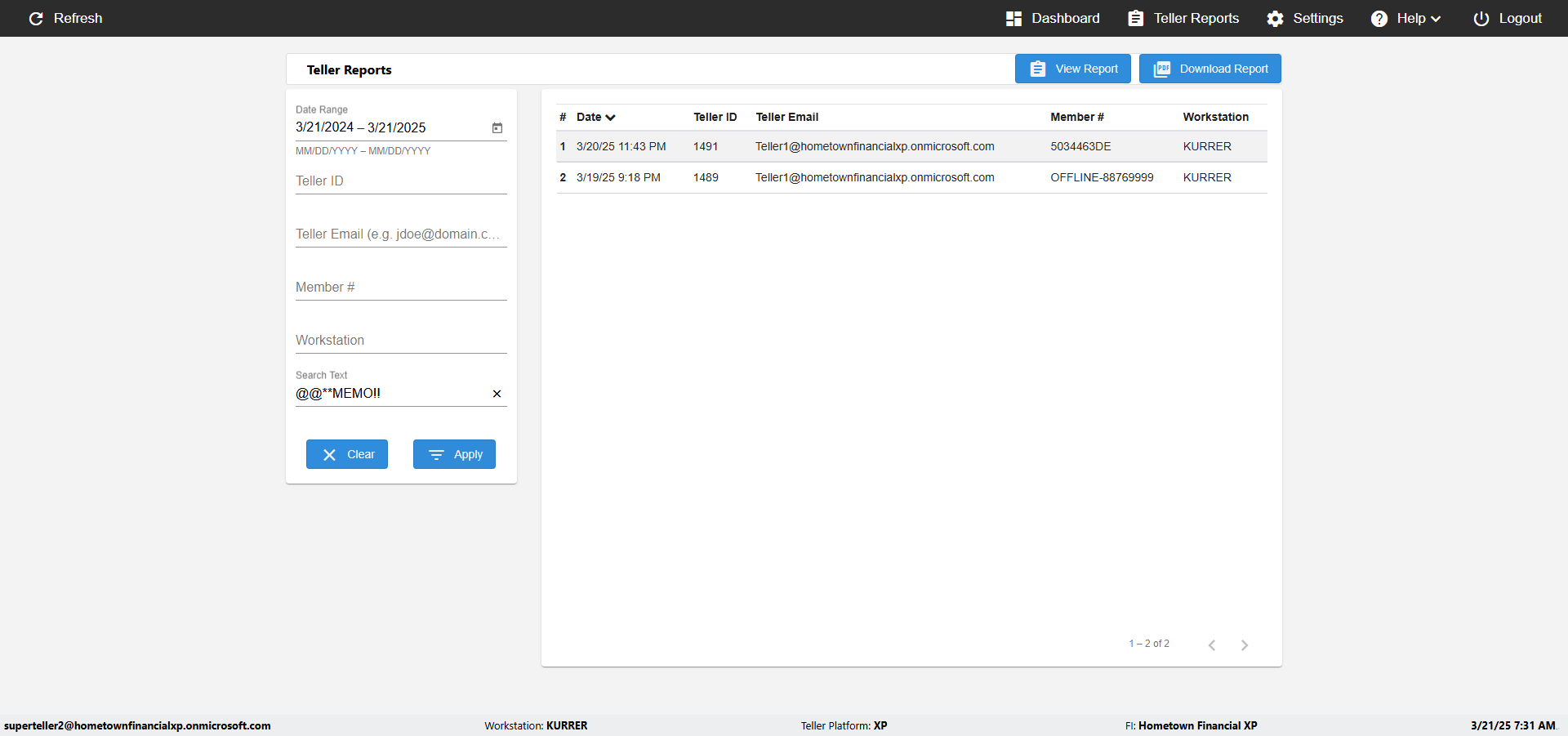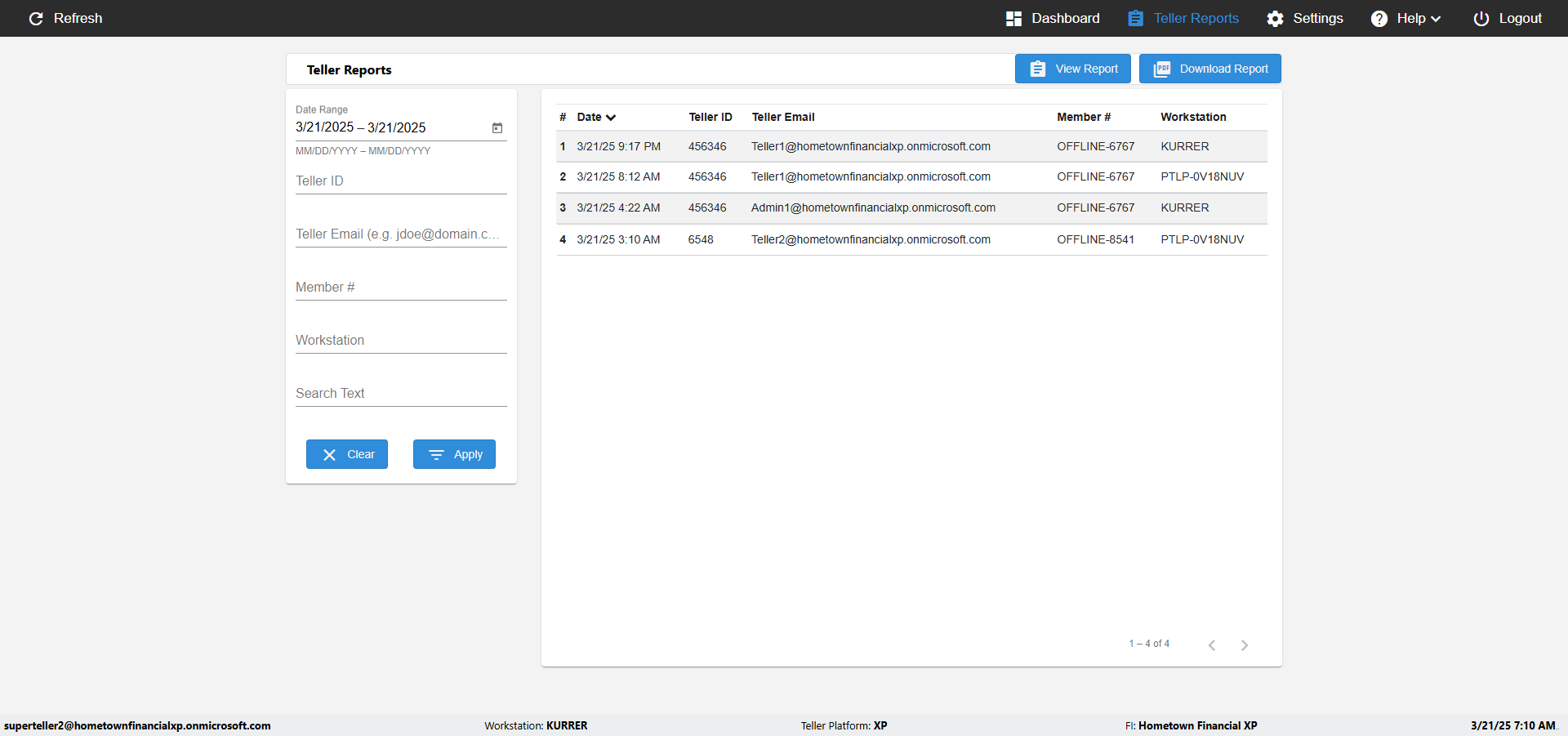 | {UserPwd=iMM2025!, Description=verify Search Elements In Report Page with Date and Teller Email, Teller ID=, errorMessage=, Teller Email=, View=, Date=2, Clear=, Workstation=, errorint=, TestID=verifySortingInReports, Transaction=, Header=Teller Email,, Username=superteller2@hometownfinancialxp.onmicrosoft.com, Export=, Member #=, Search Text=, Level=} |
