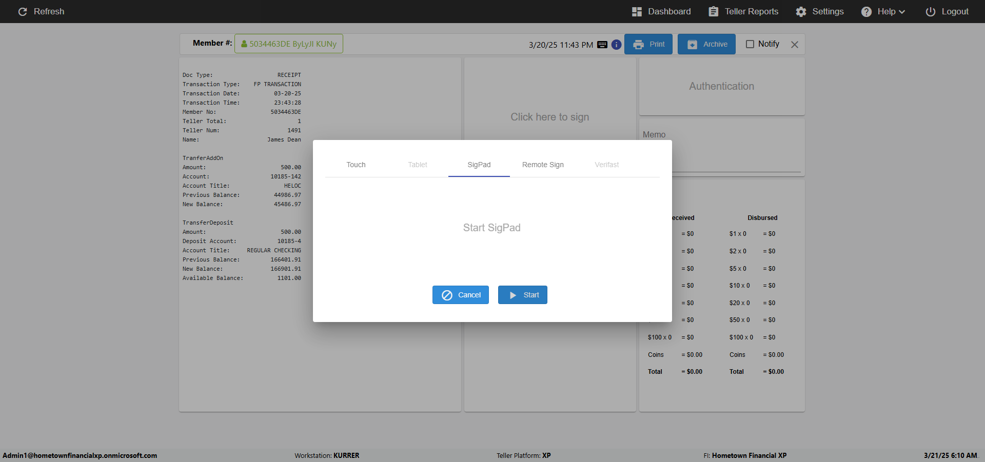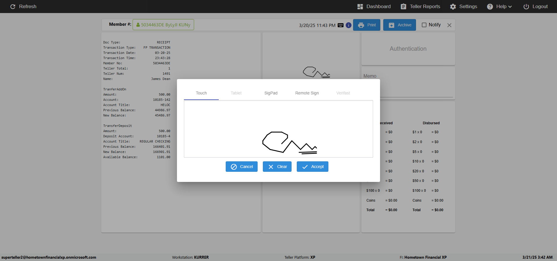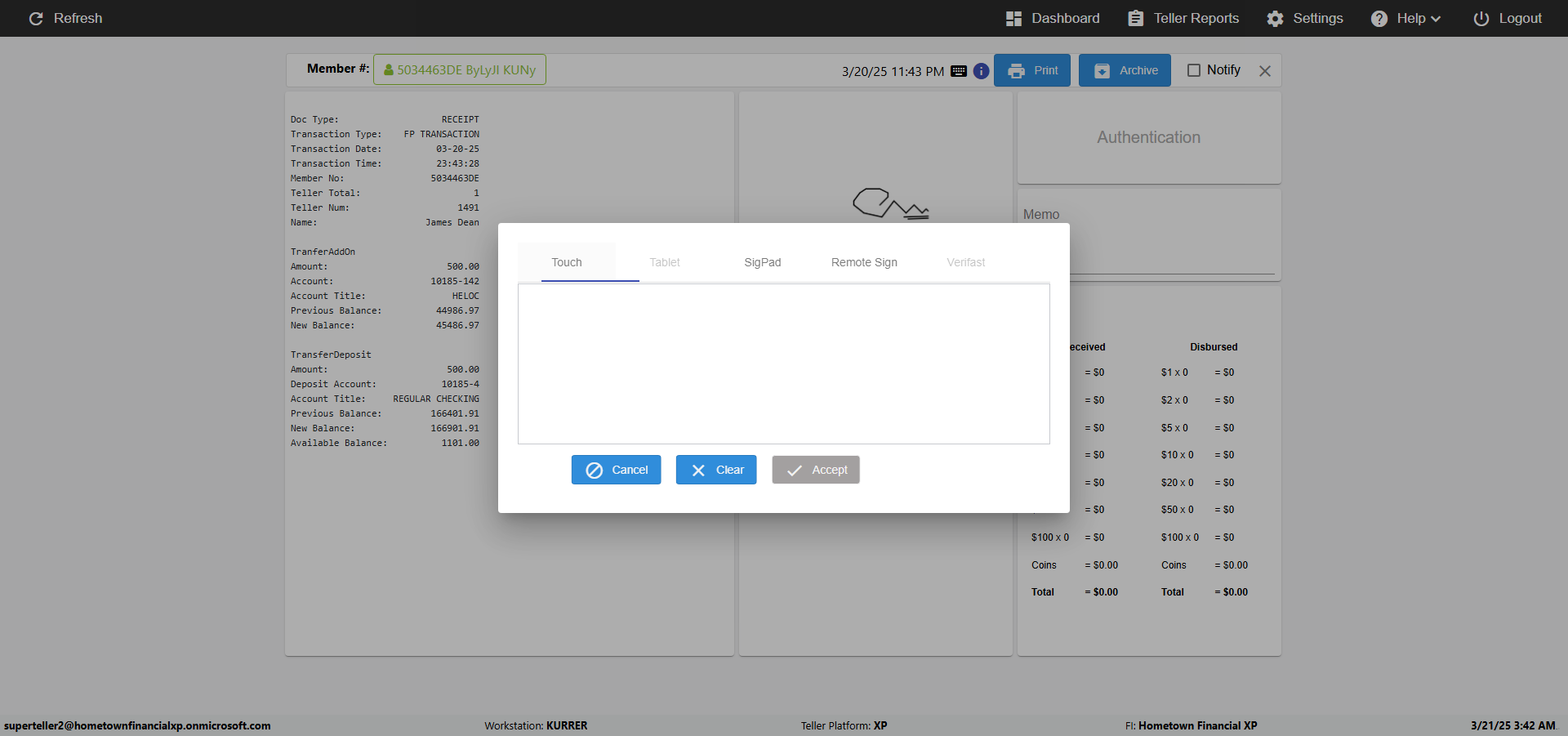 | {Toggel=, Archived Transactions=no, Description=verify touch signature in Receipt Page, Email=FALSE, Archive=FALSE, Document Type=, Notify=TRUE, SignatureTab=Touch,, DisbursedExpression=|-10*5, Operation=, Teller LastName=, Disbursed cash=, errorint=, TestID=verifyTouchSignatureEreceipt, Print=FALSE, DisbursedExpressionValue=TRUE, Phone=, ReceivedCashValue=FALSE, Member=, UserPwd=iMM2025!, Transtatus=Archived-false;Active-true;Error-false, Docment ID=, Teller=, Teller FirstName=Joe, errorMessage=, ReceivedExpressionValue=TRUE, Date=, Platfrom=, Received cash=, Transaction=, Header=, Expression=, Username=superteller2@hometownfinancialxp.onmicrosoft.com, DisbursedCashValue=FALSE, FullName=, ReceivedExpression=|+100*2, SMS=FALSE, Memo=} |