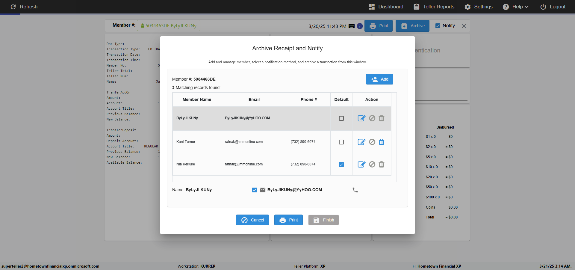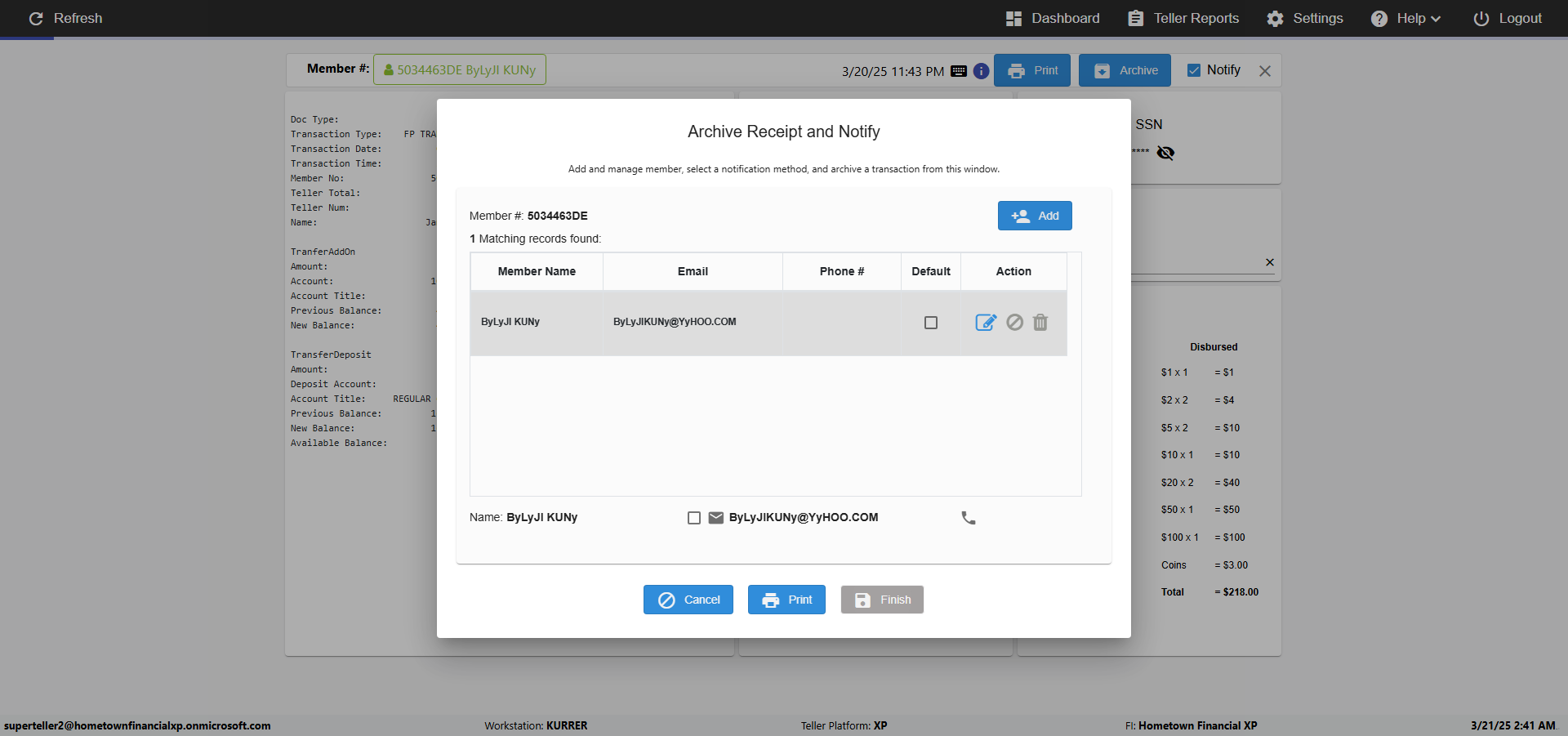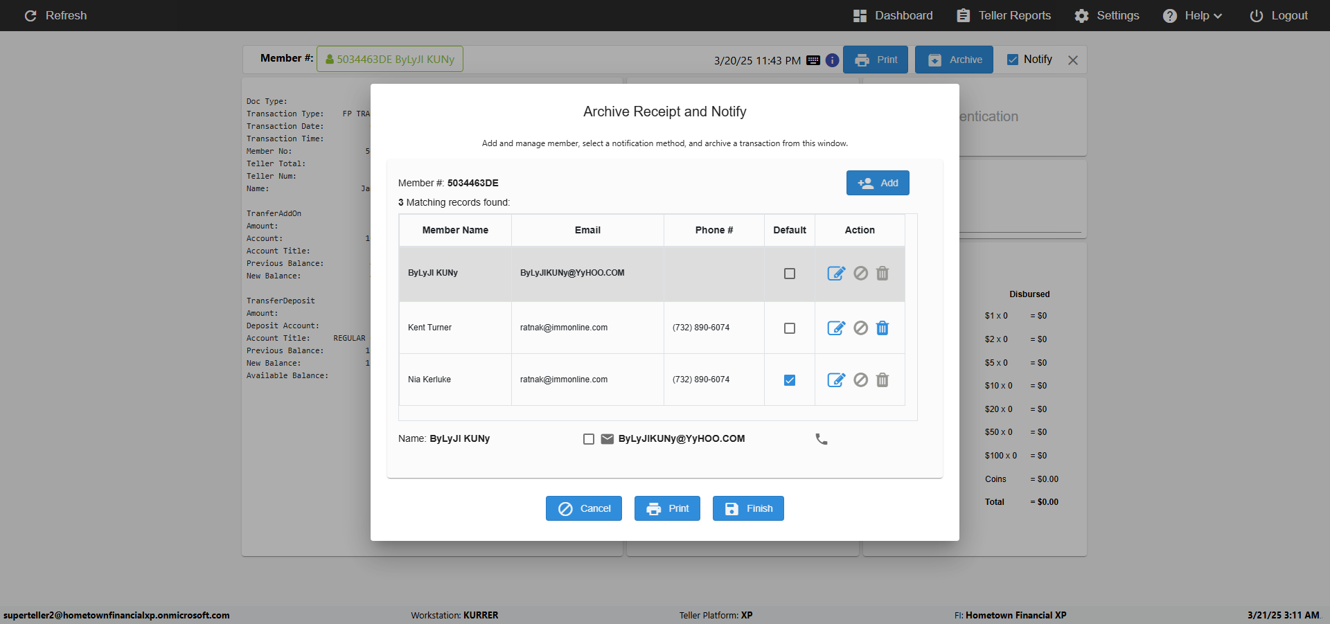 | {Toggel=, Archived Transactions=no, Description=verify touch signature in Receipt Page, Email=FALSE, Archive=FALSE, Document Type=, Notify=TRUE, SignatureTab=Touch,, DisbursedExpression=|-10*5, Operation=, Teller LastName=, Disbursed cash=, errorint=, TestID=verifyTouchSignatureEreceipt, Print=FALSE, DisbursedExpressionValue=TRUE, Phone=, ReceivedCashValue=FALSE, Member=, UserPwd=iMM2025!, Transtatus=Archived-false;Active-true;Error-false, Docment ID=, Teller=, Teller FirstName=Joe, errorMessage=, ReceivedExpressionValue=TRUE, Date=, Platfrom=, Received cash=, Transaction=, Header=, Expression=, Username=superteller2@hometownfinancialxp.onmicrosoft.com, DisbursedCashValue=FALSE, FullName=, ReceivedExpression=|+100*2, SMS=FALSE, Memo=} |