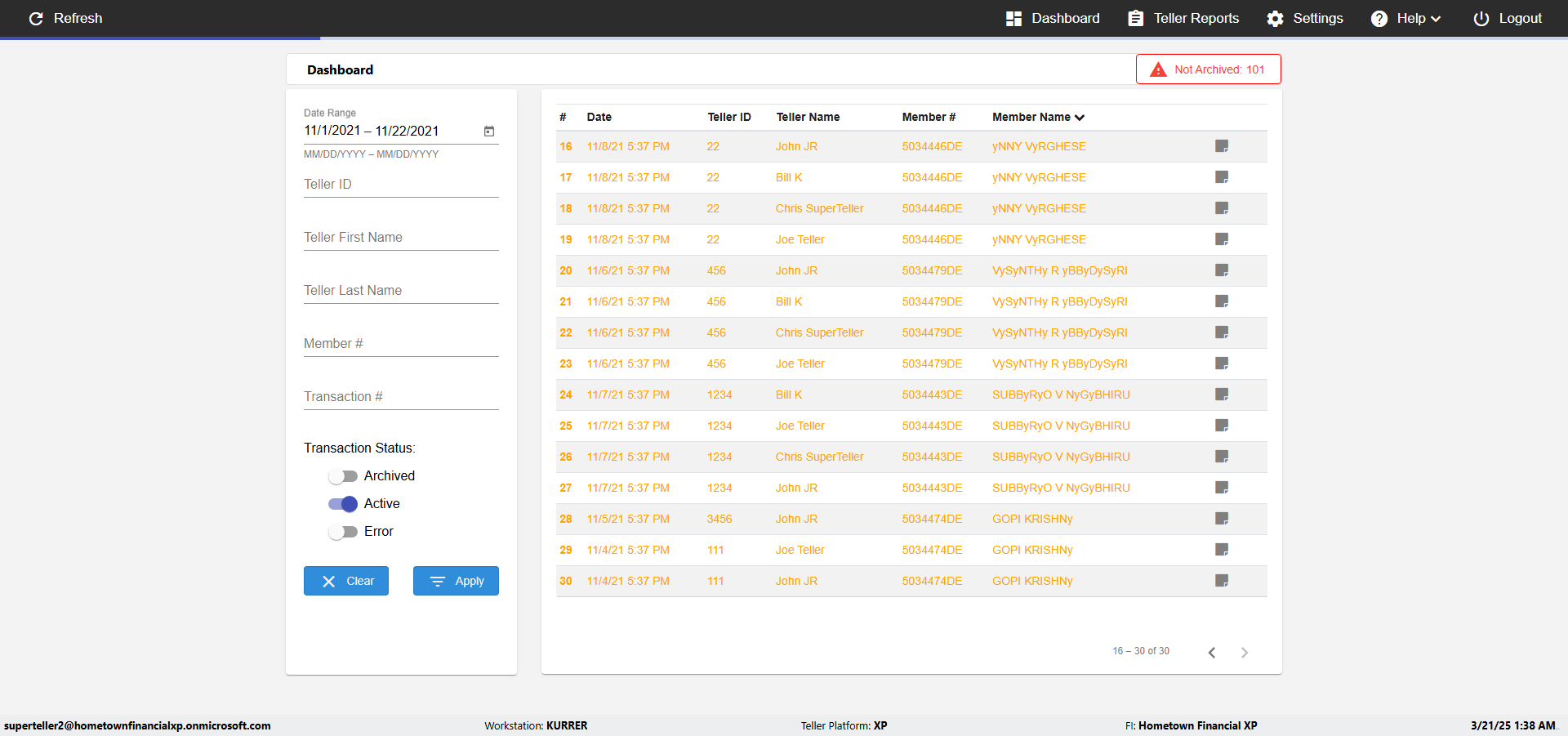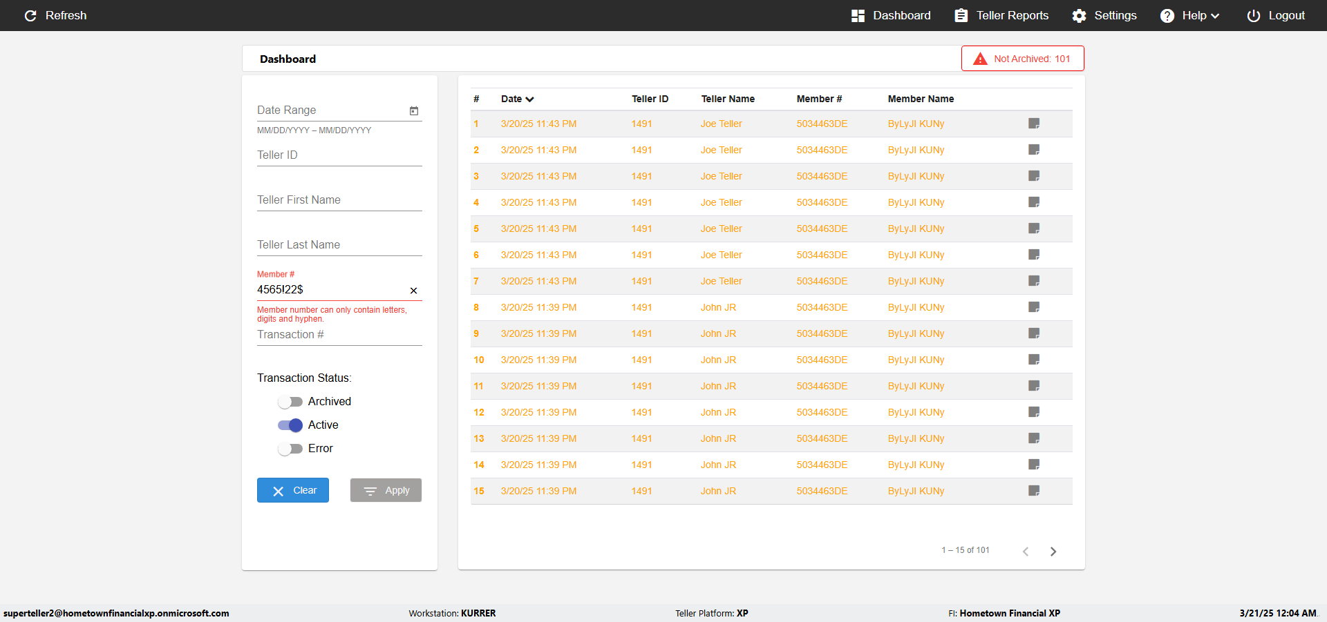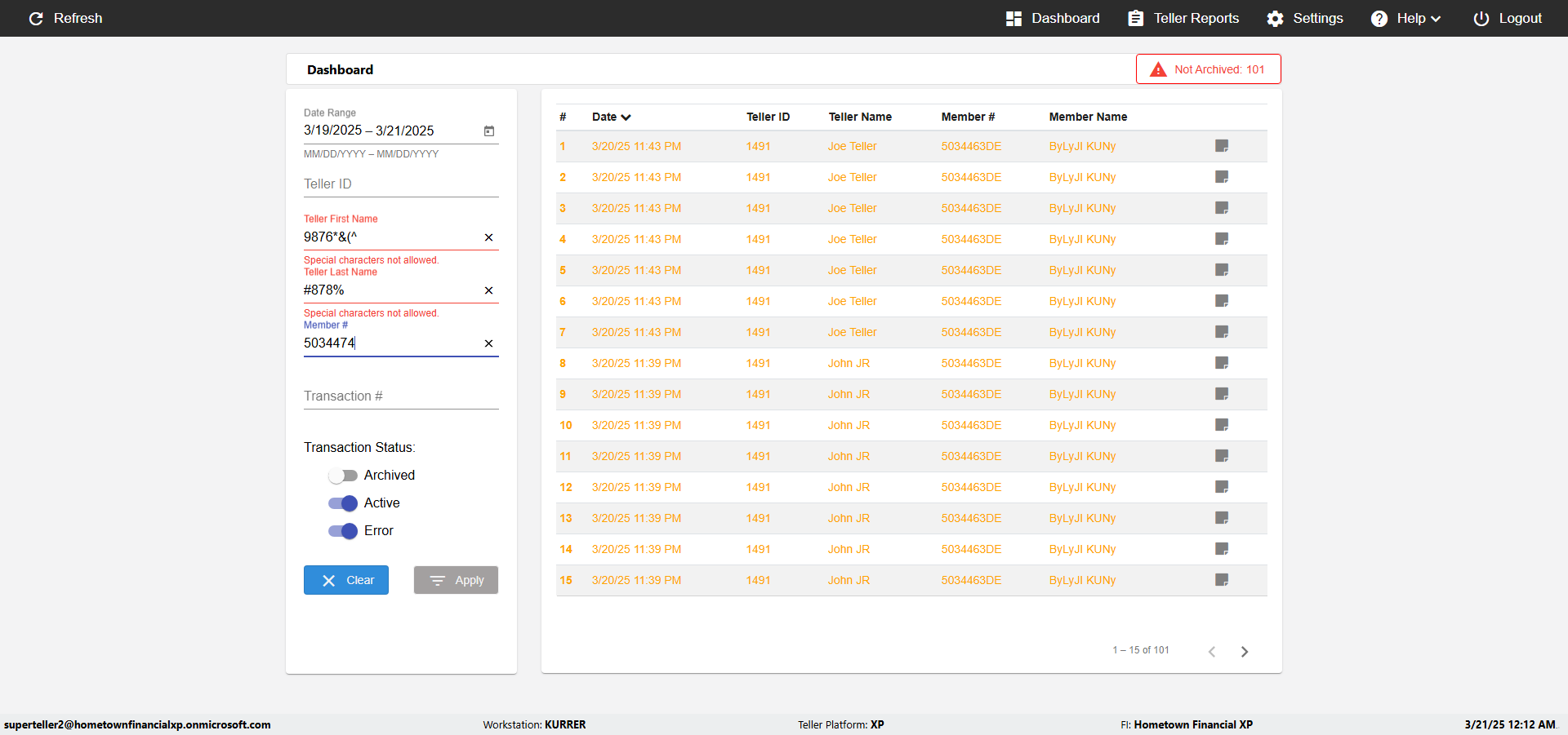 | {UserPwd=iMM2025!, Description=verify Error Messages in Report Page for Teller ID, Teller ID=%&^heg, errorMessage=Special characters not allowed., Teller Email=, View=, Date=, Clear=, Workstation=, errorint=1, TestID=verifyErrorMessagesInReports, Transaction=, Header=, Username=superteller2@hometownfinancialxp.onmicrosoft.com, Export=, Member #=, Search Text=, Level=} |