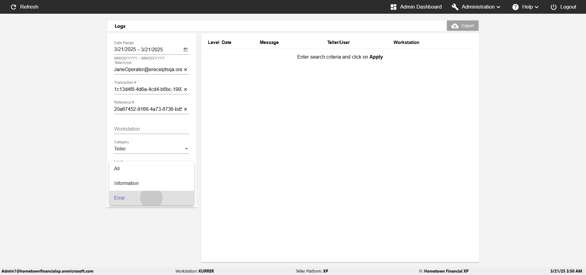 | {UserPwd=iMM2025!, Description=verify Error Messages in Report Page for Workstation Length, Teller ID=, errorMessage=Must be at least 4 characters long, Teller Email=, View=, Date=10, Clear=, Workstation=abc, errorint=1, TestID=verifyErrorMessagesInReports, Transaction=, Header=, Username=superteller2@hometownfinancialxp.onmicrosoft.com, Export=, Member #=, Search Text=, Level=} |