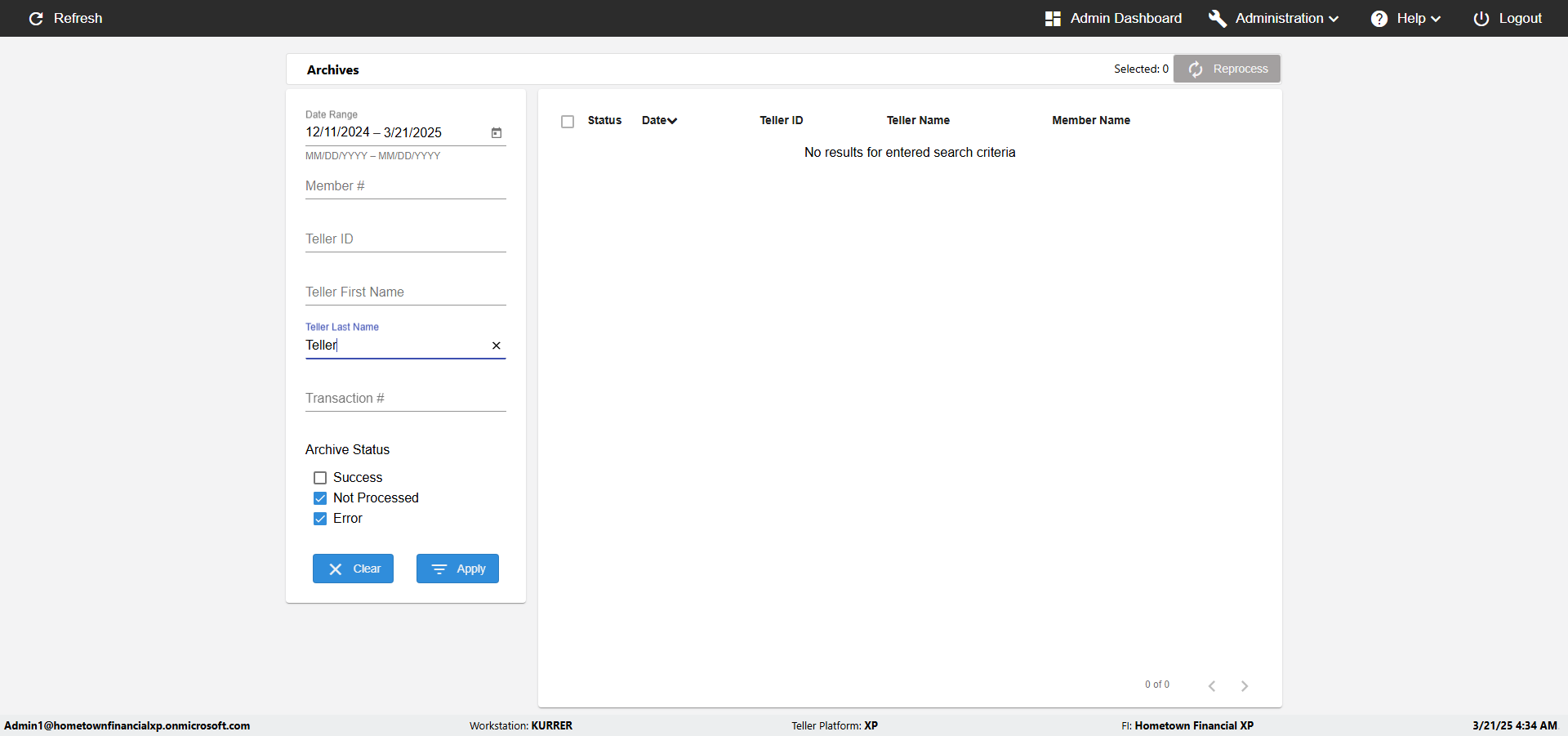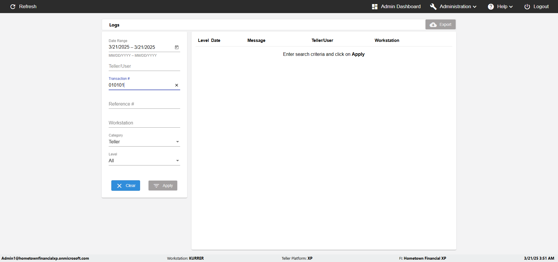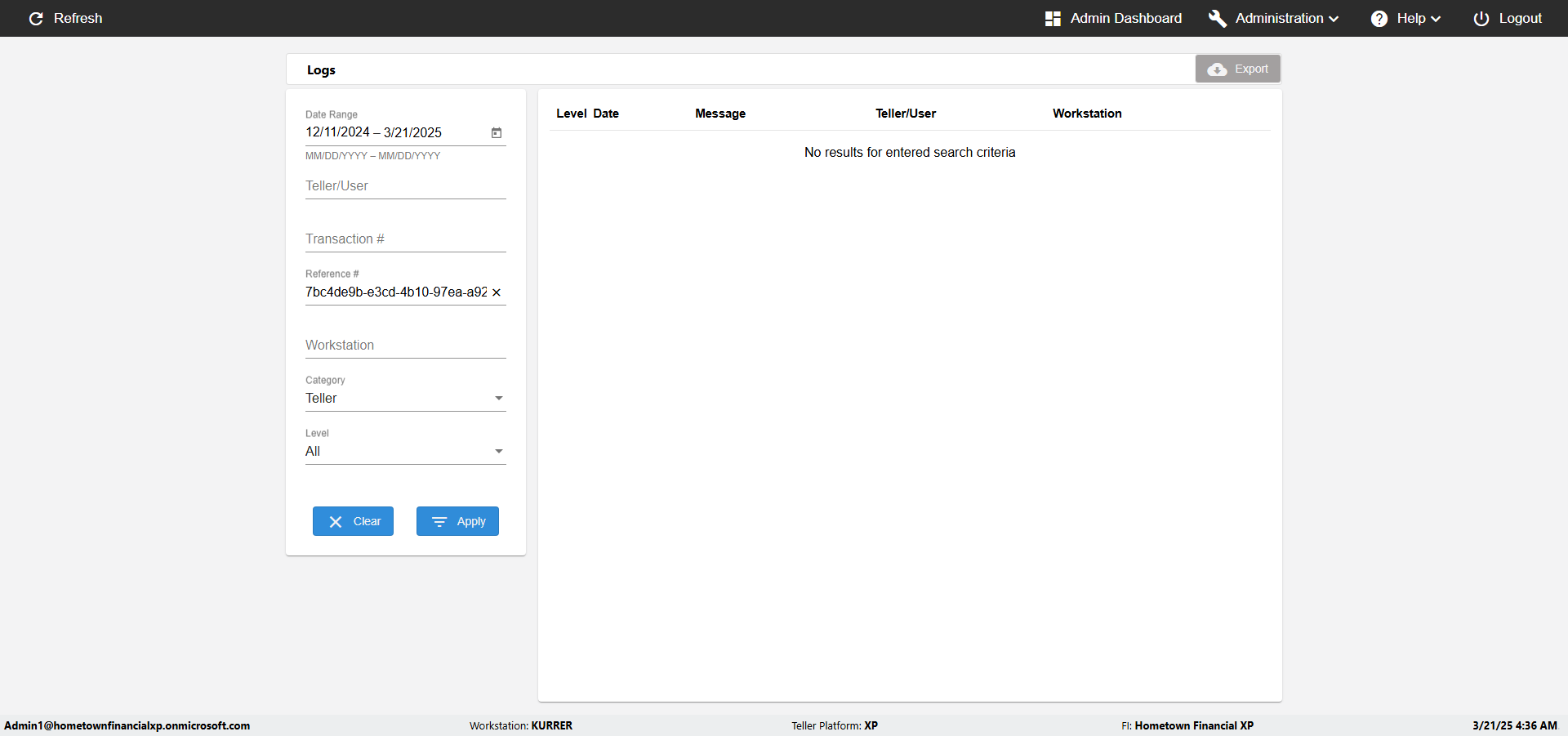 | {UserPwd=iMM2025!, Description=verify Search Elements In Report Page Teller ID, Teller ID=1491, errorMessage=, Teller Email=, View=, Date=2, Clear=, Workstation=, errorint=, TestID=verifySearchInReports, Transaction=, Header=, Username=superteller2@hometownfinancialxp.onmicrosoft.com, Export=, Member #=, Search Text=, Level=} |