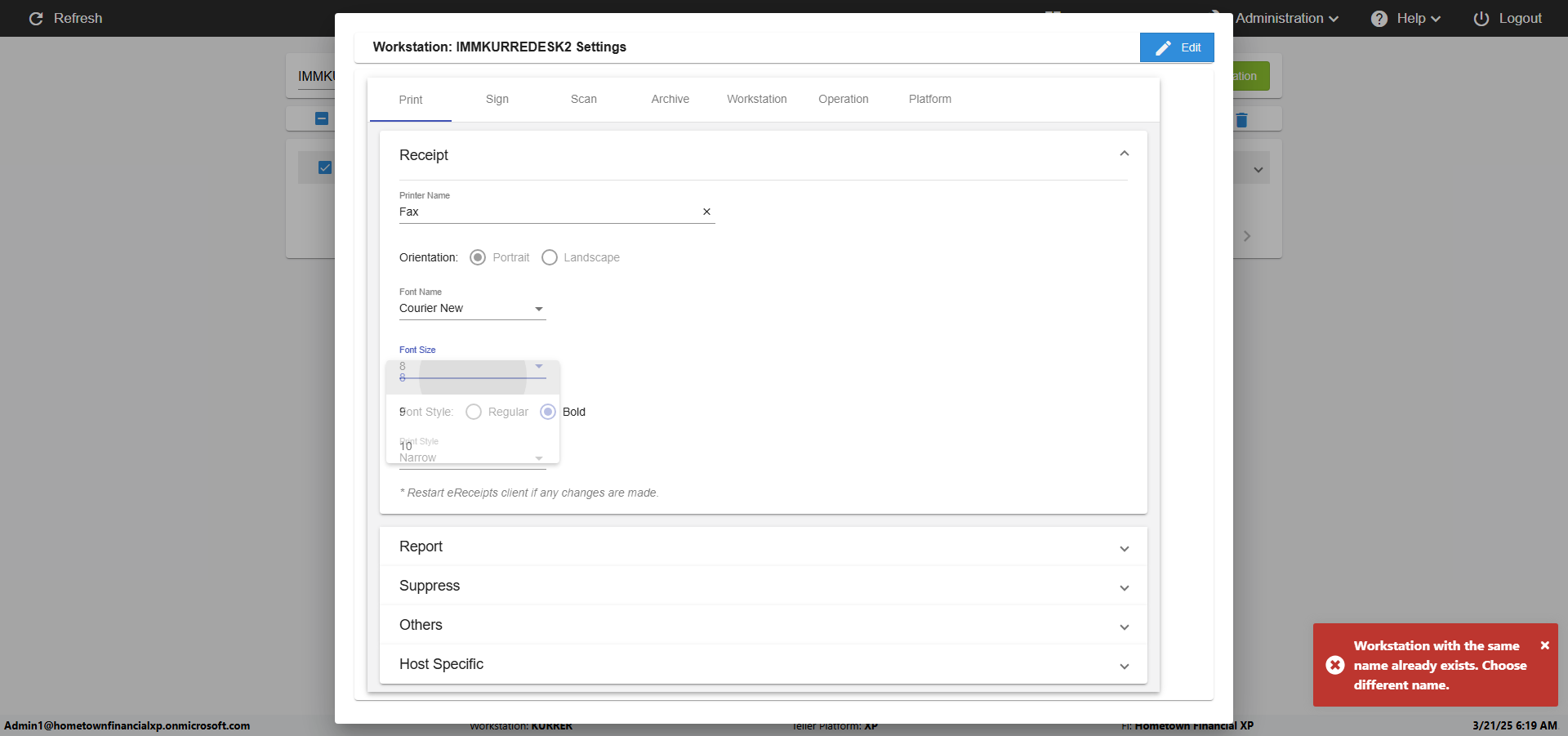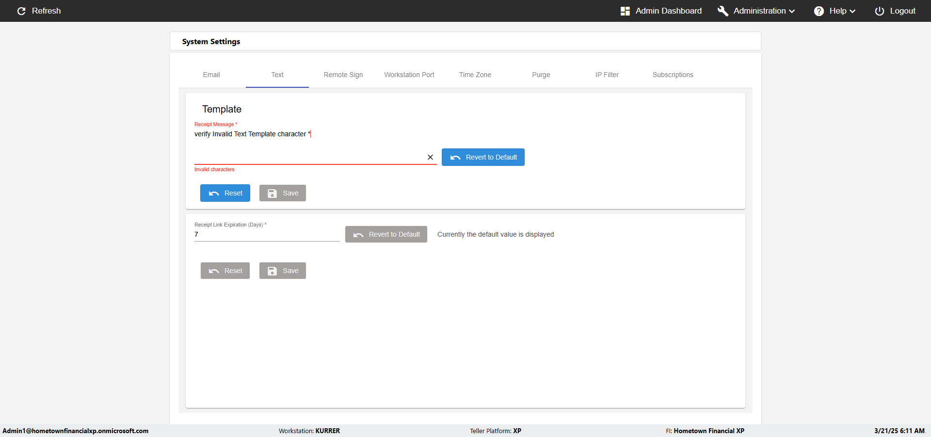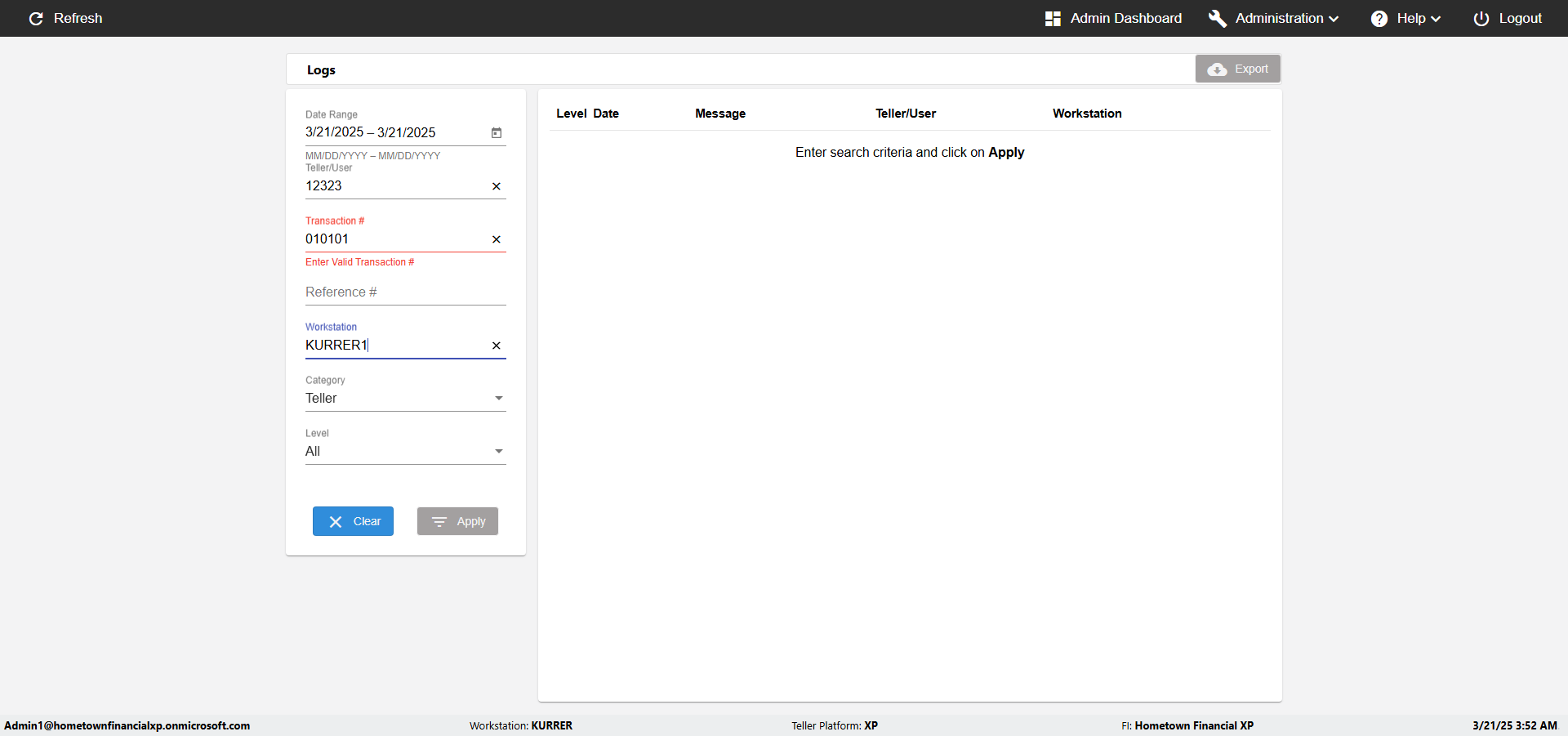 | {UserPwd=iMM2025!, Description=verify Error Messages in Report Page for Workstation special characters, Teller ID=, errorMessage=Special characters \,/,:,*,?,",>,<,|,.: not allowed, Teller Email=, View=, Date=10, Clear=, Workstation=abcsdfsd*, errorint=1, TestID=verifyErrorMessagesInReports, Transaction=, Header=, Username=superteller2@hometownfinancialxp.onmicrosoft.com, Export=, Member #=, Search Text=, Level=} |