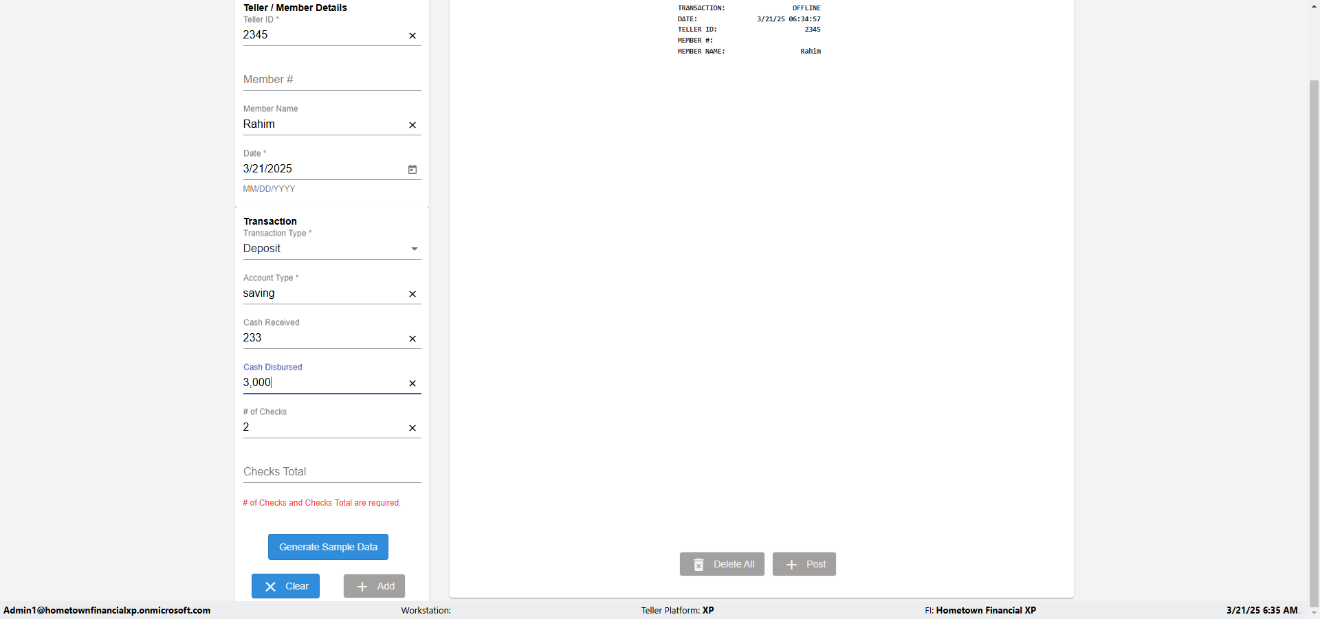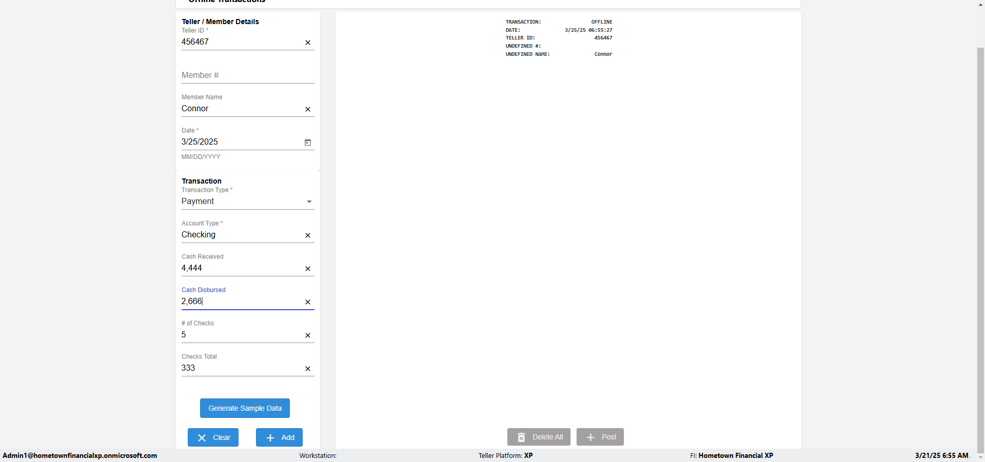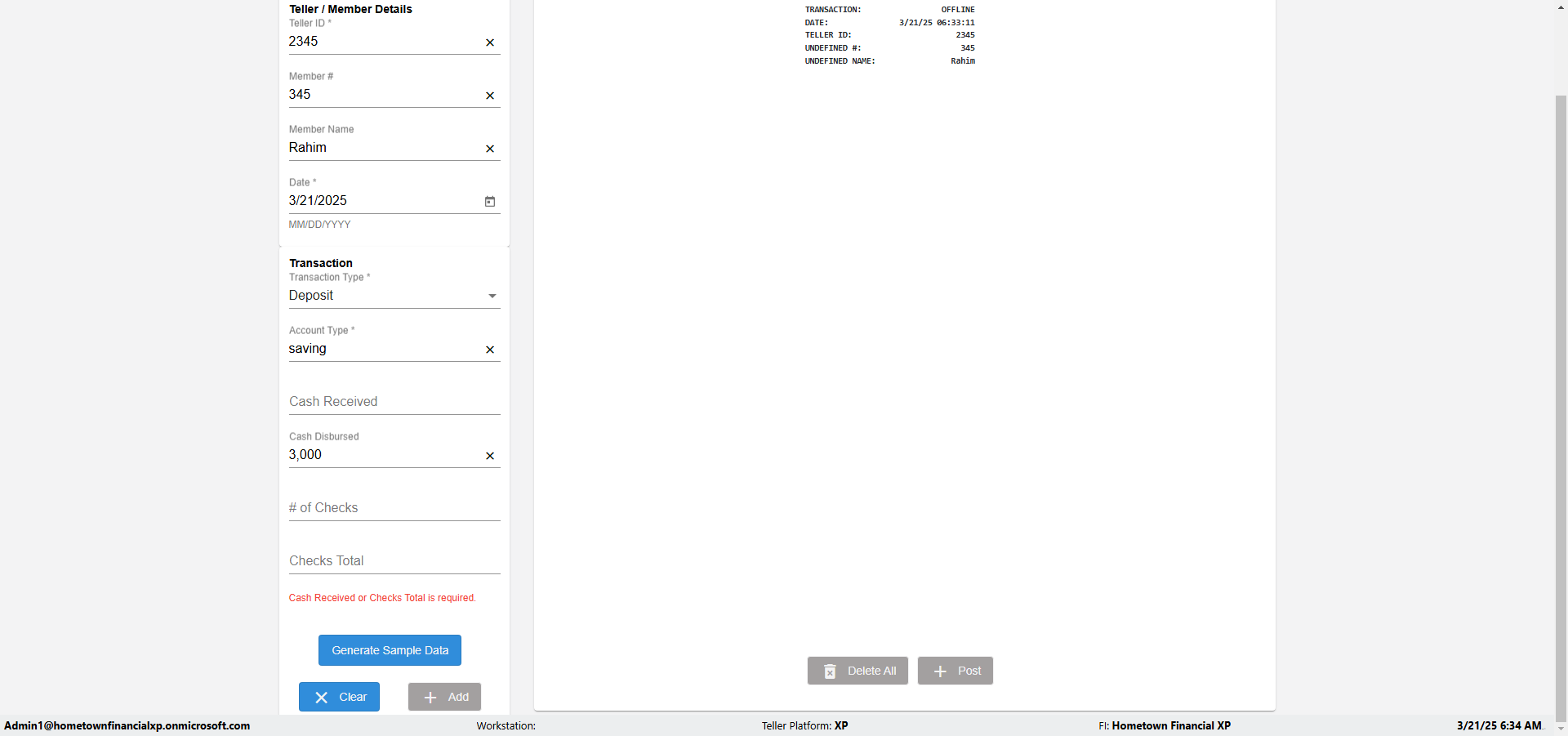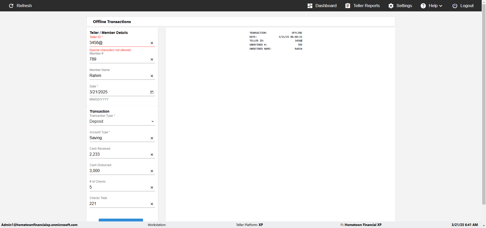 | {Description=Verify Teller ID error in Offline Transaction demo, From Account #=1212, Teller ID=3456@, To Account #=1414, Amount=555, errorMessage=Special characters not allowed.;, Transaction Type=Deposit, userpwd=iMM2025!, # of Checks=5, Member#=789, Member Name=Rahim, Cash Received=2233, From Account Type=checking, Date=, To Account Type=savings, errorint=1, TestID=verifyOfflineErrorMessagesTellerIDDetails, offlineurl=/offlinereceipt/demo, Cash Disbursed=3000, Account Type=Saving, Checks Total=221, username=Admin1@hometownfinancialxp.onmicrosoft.com} |