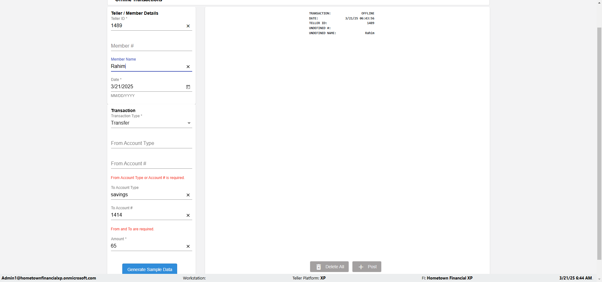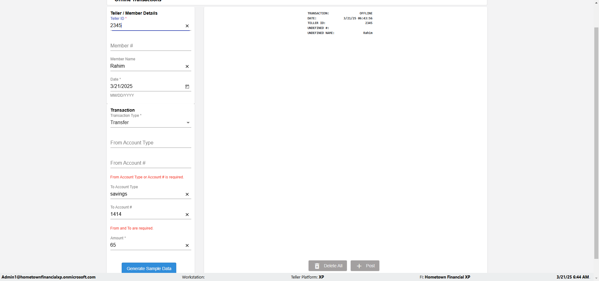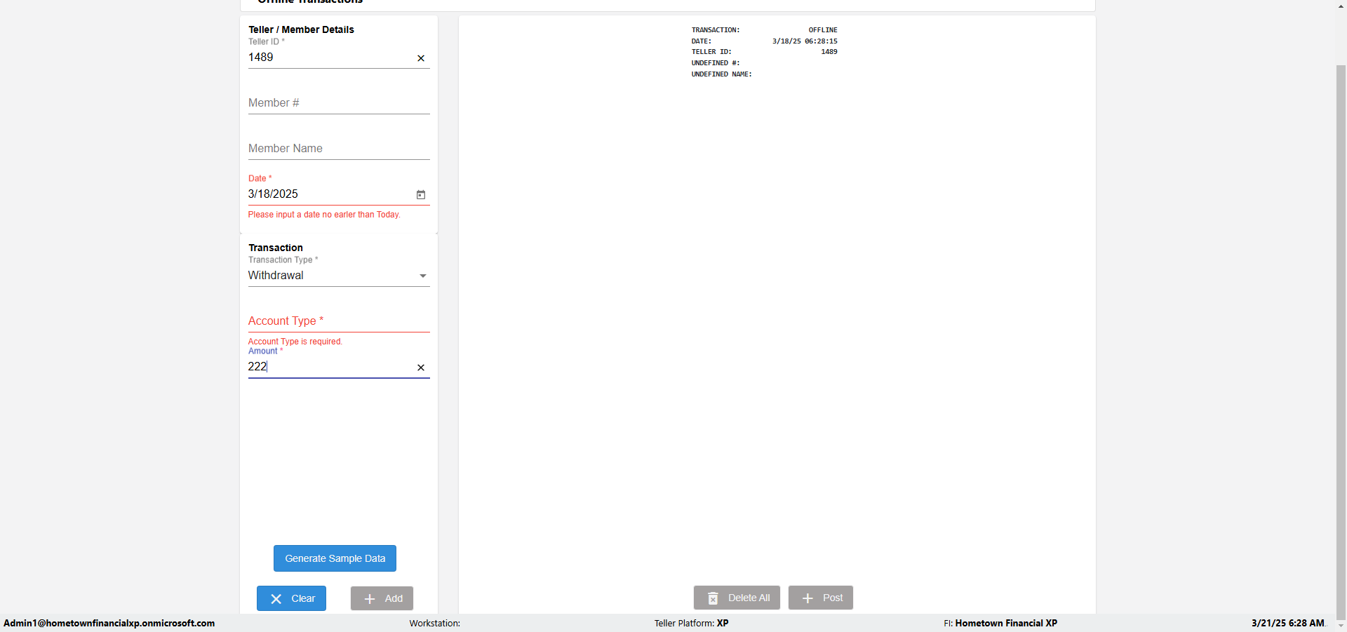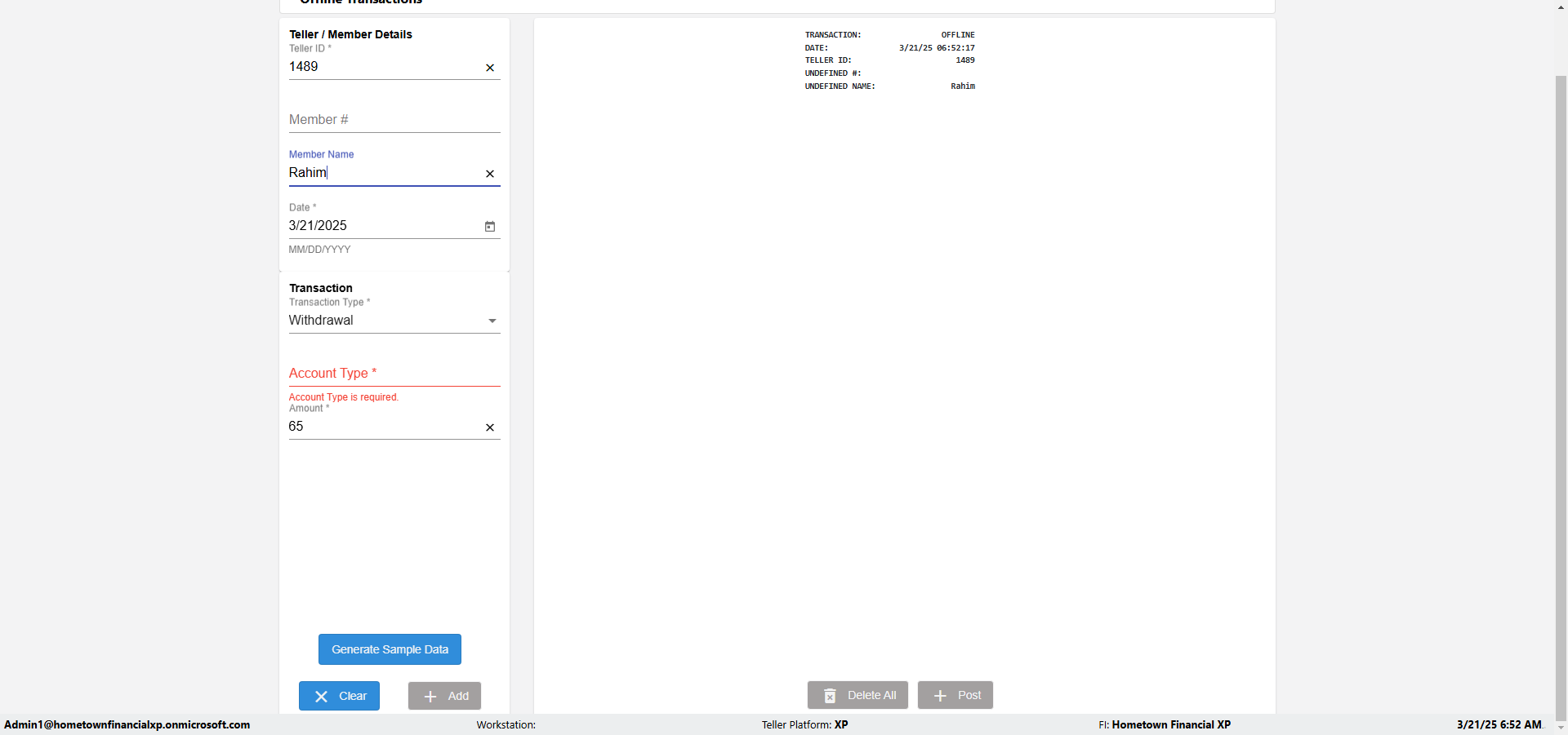 | {Description=Verify Teller ID error in Offline Transaction demo, From Account #=1212, Teller ID=3456@, To Account #=1414, Amount=555, errorMessage=Special characters not allowed.;, Transaction Type=Deposit, userpwd=iMM2025!, # of Checks=5, Member#=789, Member Name=Rahim, Cash Received=2233, From Account Type=checking, Date=, To Account Type=savings, errorint=1, TestID=verifyOfflineErrorMessagesTellerIDDetails, offlineurl=/offlinereceipt/demo, Cash Disbursed=3000, Account Type=Saving, Checks Total=221, username=Admin1@hometownfinancialxp.onmicrosoft.com} |