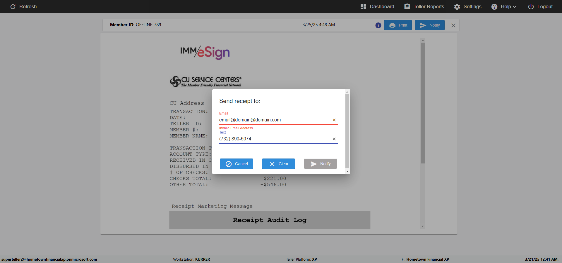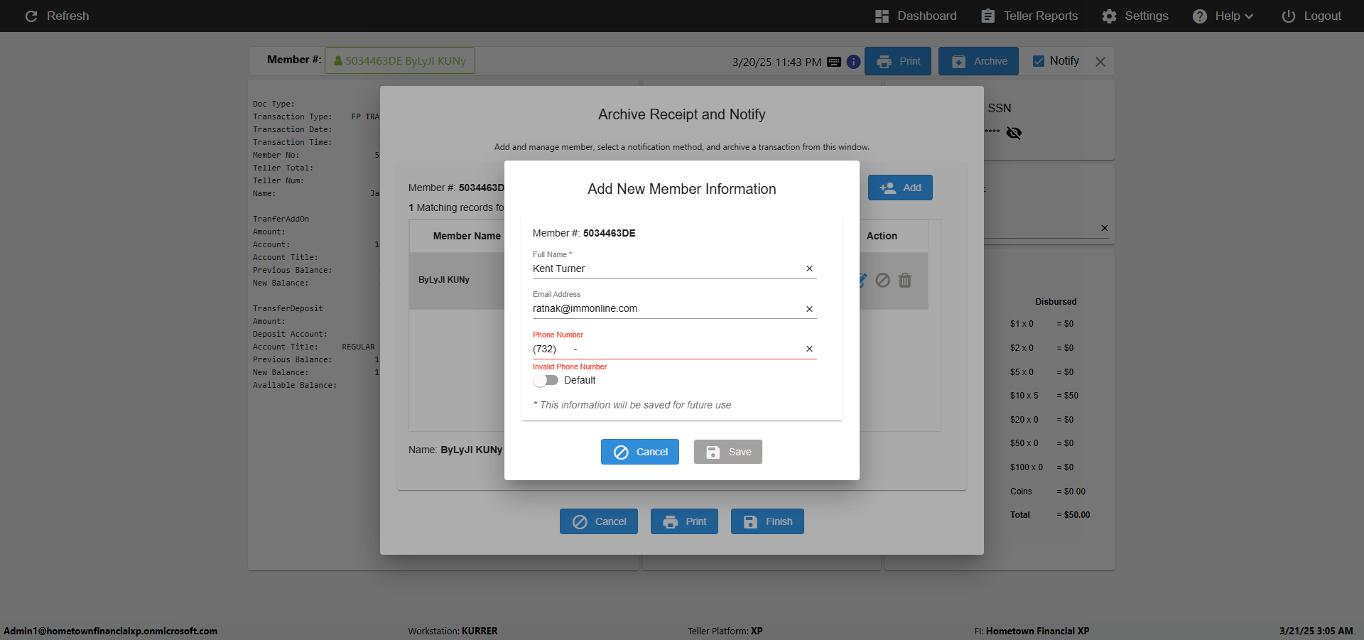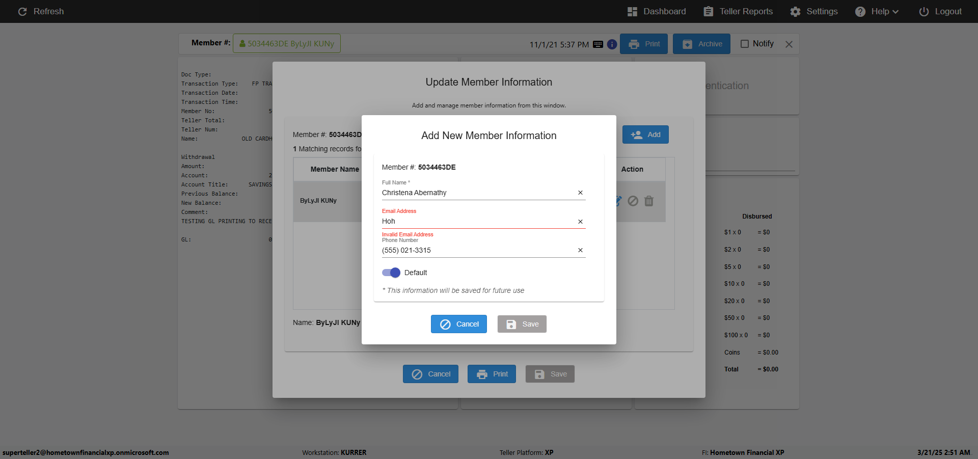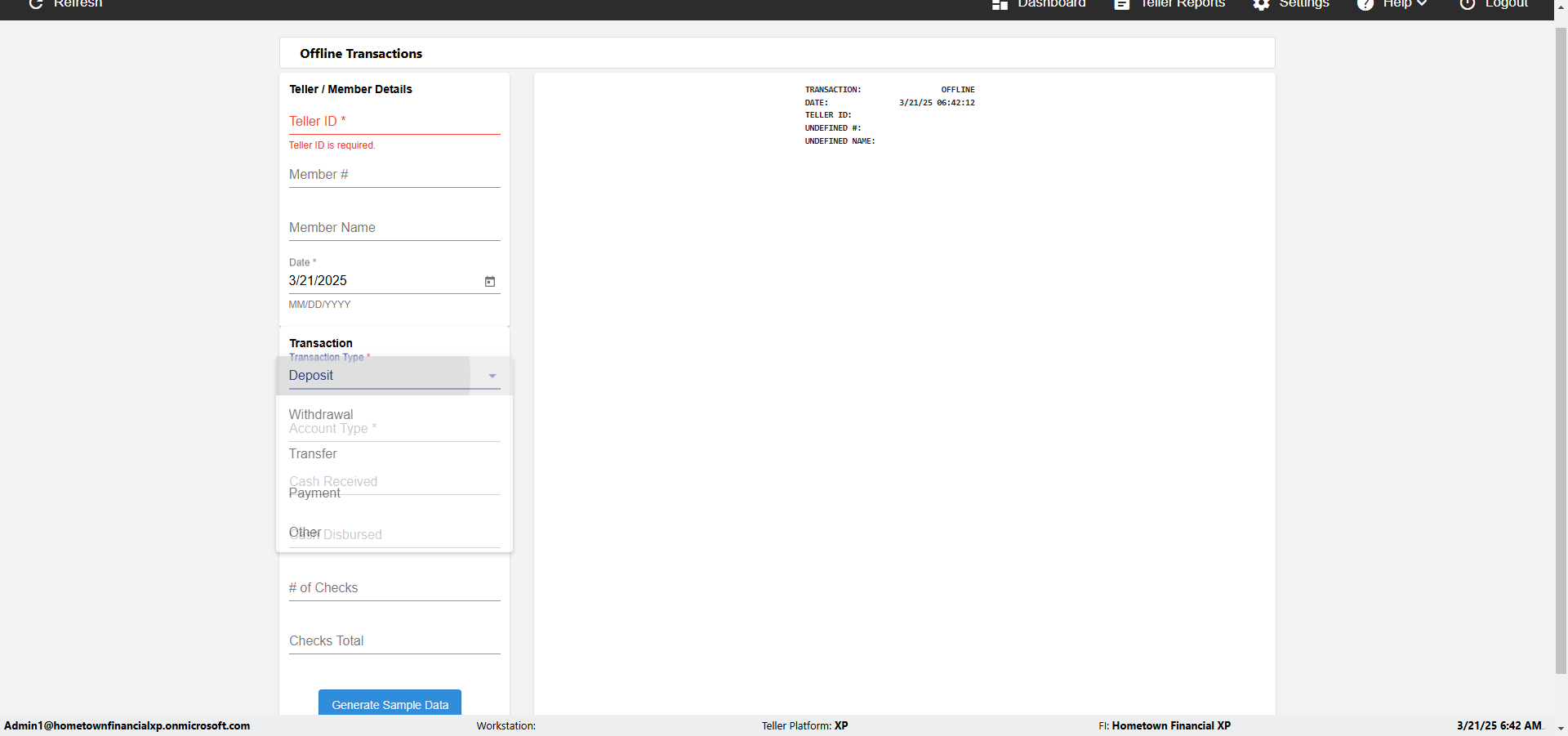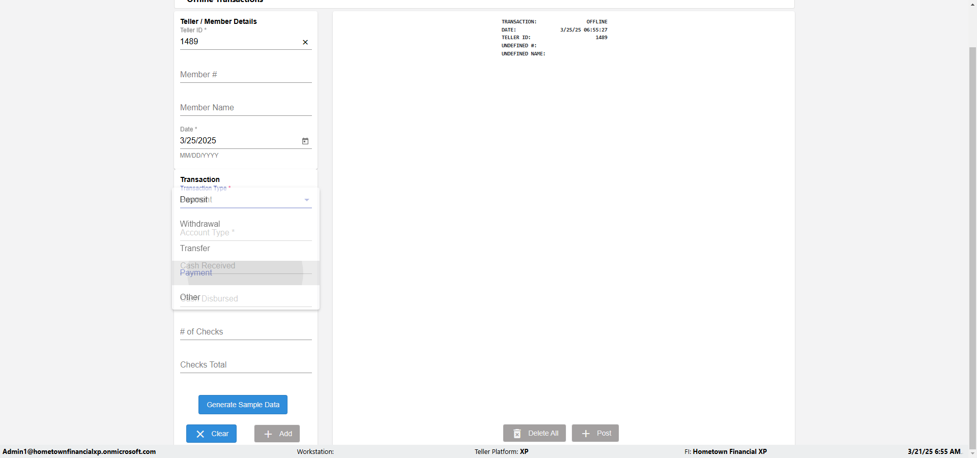 | {Description=Verify Teller ID error in Offline Transaction demo, From Account #=1212, Teller ID=3456@, To Account #=1414, Amount=555, errorMessage=Special characters not allowed.;, Transaction Type=Deposit, userpwd=iMM2025!, # of Checks=5, Member#=789, Member Name=Rahim, Cash Received=2233, From Account Type=checking, Date=, To Account Type=savings, errorint=1, TestID=verifyOfflineErrorMessagesTellerIDDetails, offlineurl=/offlinereceipt/demo, Cash Disbursed=3000, Account Type=Saving, Checks Total=221, username=Admin1@hometownfinancialxp.onmicrosoft.com} |
