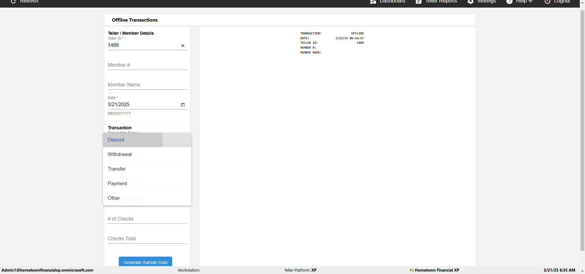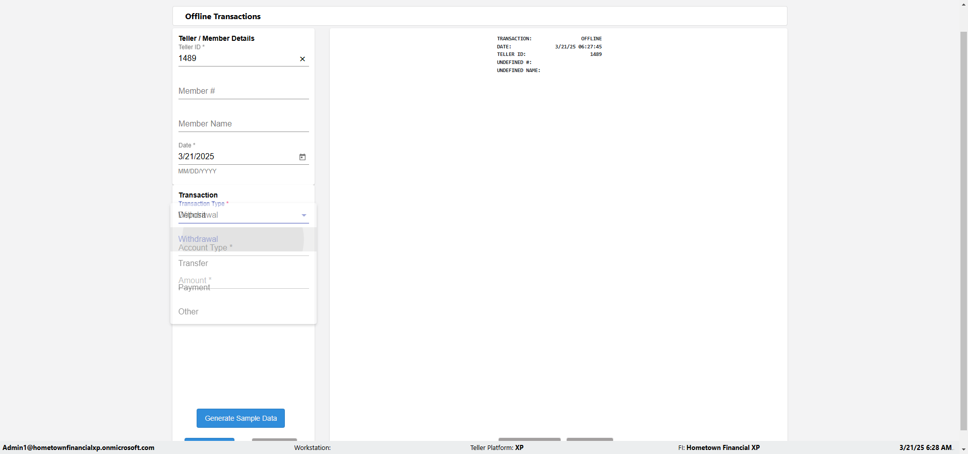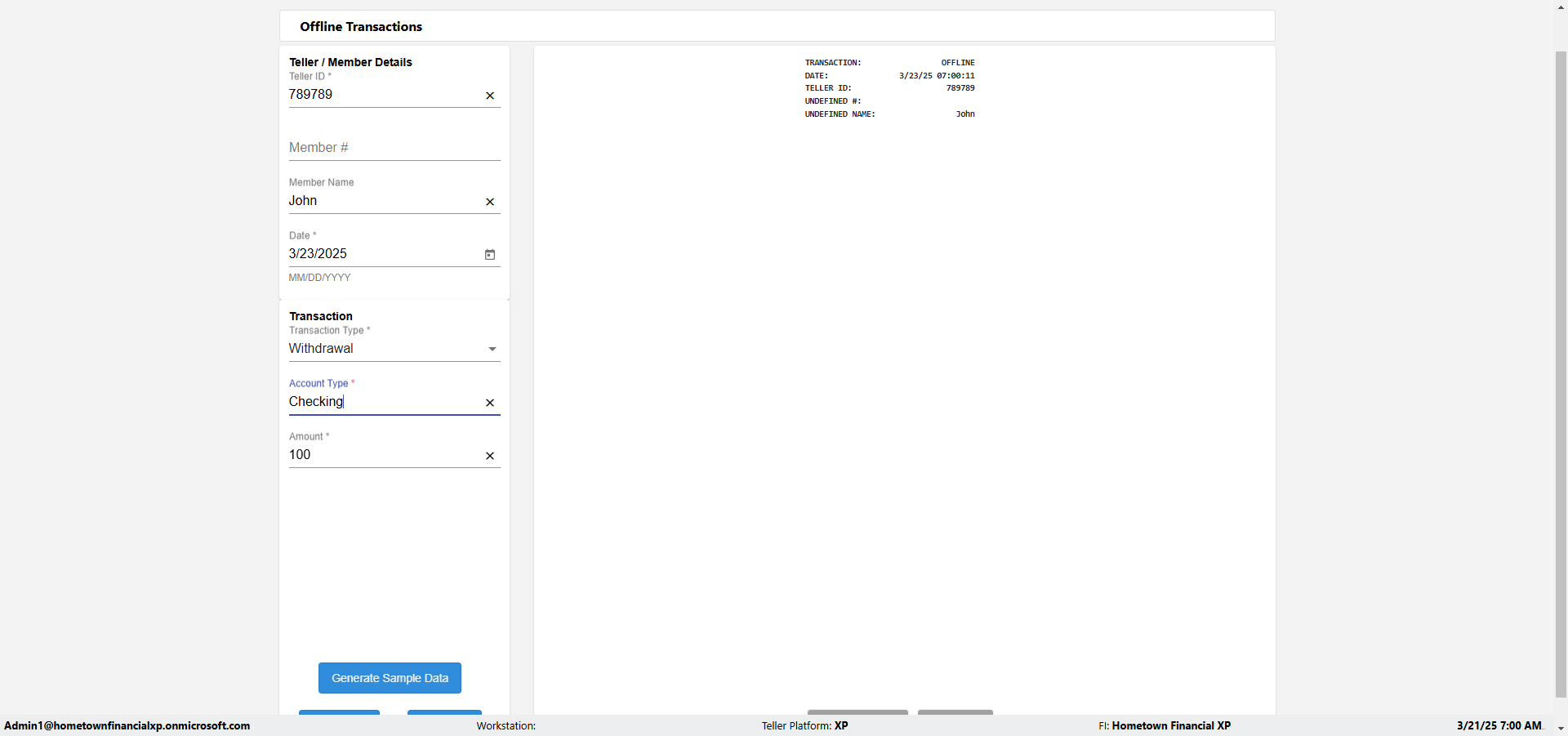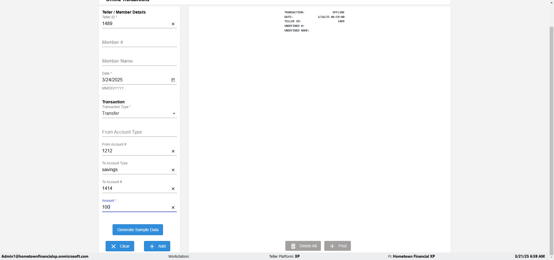 | {Description=Verify generate sample data in Offline Transaction demo, From Account #=1212, Teller ID=1488, To Account #=1414, Amount=565, errorMessage=, Transaction Type=Deposit, userpwd=iMM2025!, # of Checks=5, Member#=8888, Member Name=Alla, Cash Received=5000, From Account Type=checking, Date=3, To Account Type=savings, errorint=, TestID=verifyOfflineTranGenerateSample, offlineurl=/offlinereceipt/demo, Cash Disbursed=3000, Account Type=Checking, Checks Total=999, username=Admin1@hometownfinancialxp.onmicrosoft.com} |