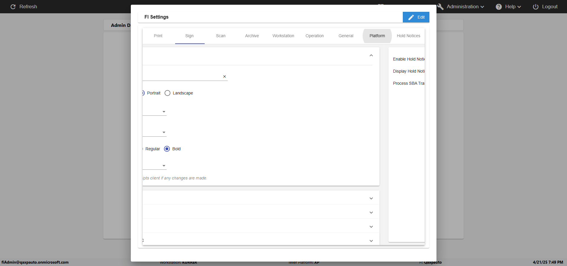 Actual(Passed): Sucessfully clicked on Settings button in Teller portal[ScreenShot]