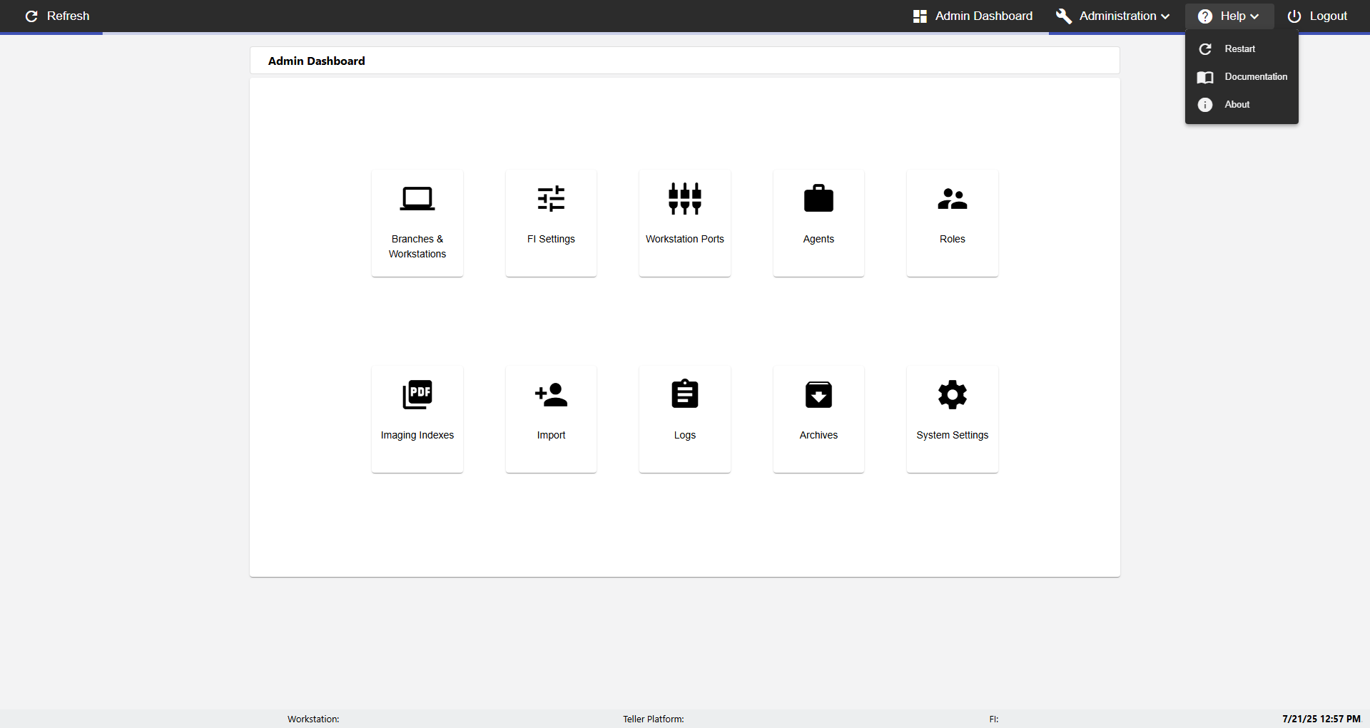 Control Panel, FI Management, Agents, Roles, Imaging Indexes, Member Import, Logging, Archives, About, Logout
