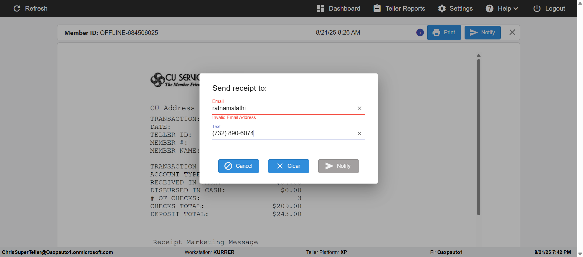 verifyInvalidEmailInNotifyInDashboardPage({Description=verify the invalid email in notify dashboard page, Email=ratnamalathi, Teller LastName=...)