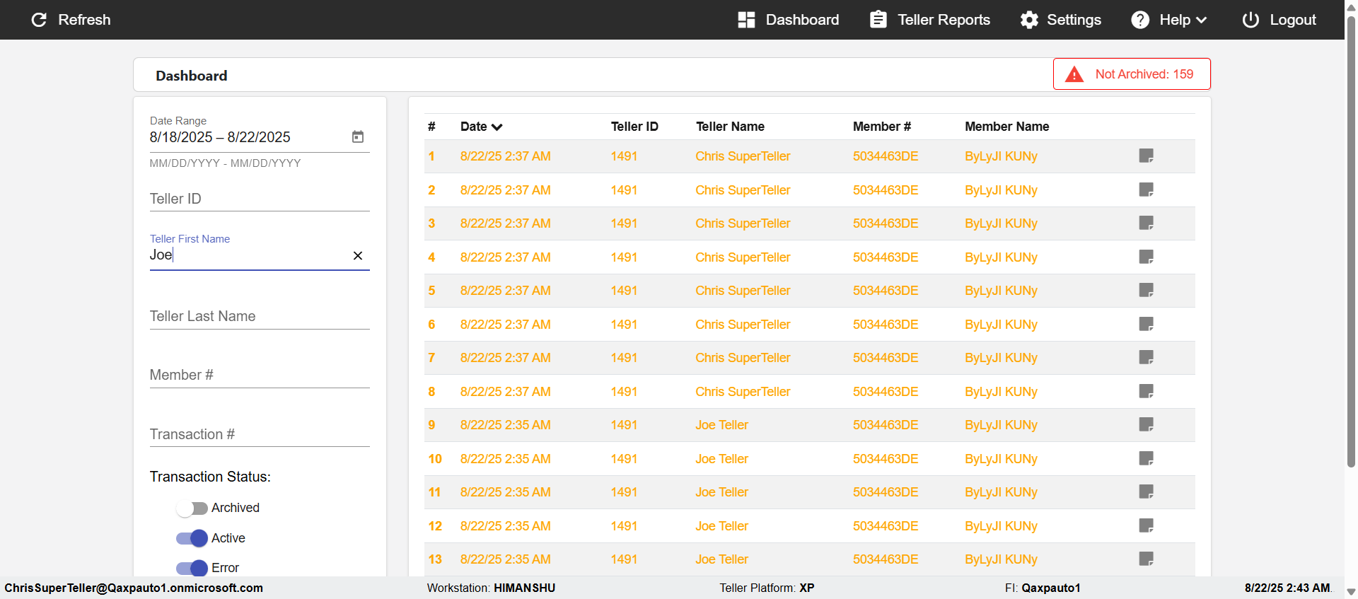({Description=verify Transactions in Teller, Email=, Teller LastName=, print signatur=, errorint=, TestID=verifyForTransactionInTellerAndSuperTeller, Color Transactions=, Member=999, UserPwd=iMM2022!, Transtatus=Archived-false;Active-true;Error-false, Receipt=, Report=, Teller=, Teller FirstName=, errorMessage=, Suppress=, Date=4, print Disburstments=, Print signature line=, Type=Teller, Transaction=, Header=, Username=JaneOperator@Qaxpauto1.onmicrosoft.com, SMS=, Sign=, Scan=})