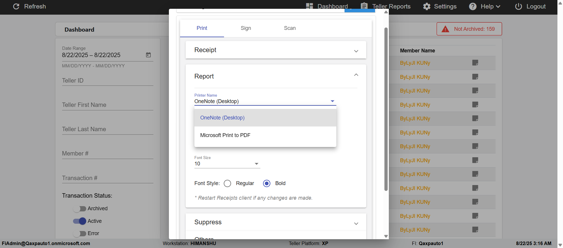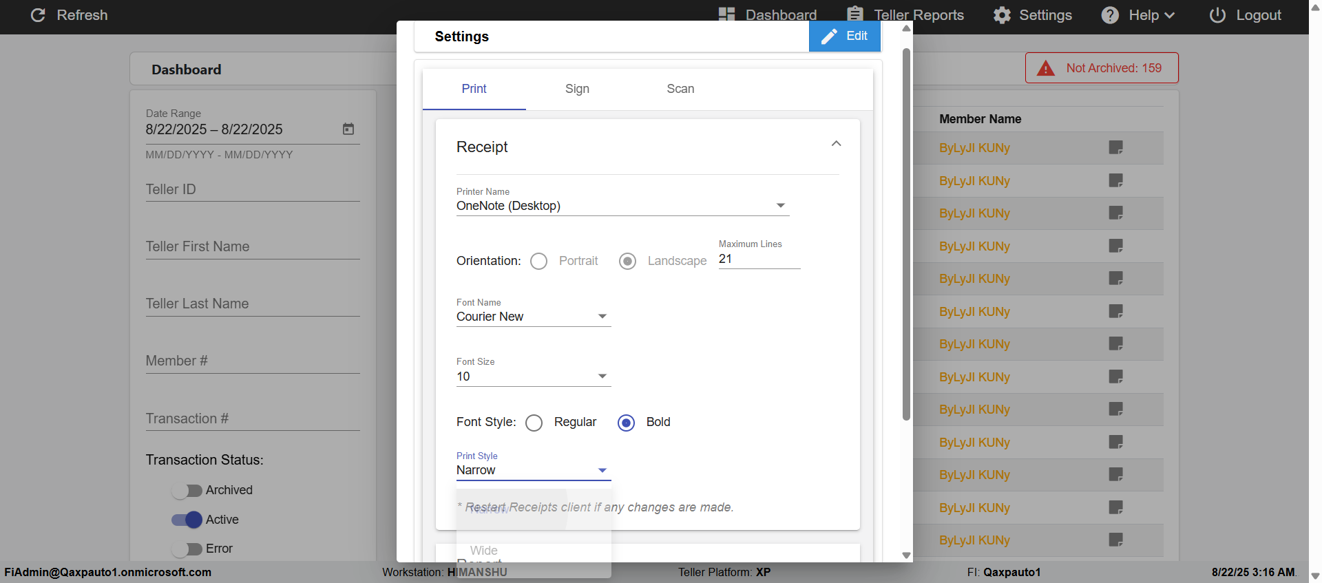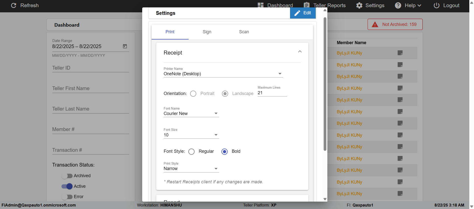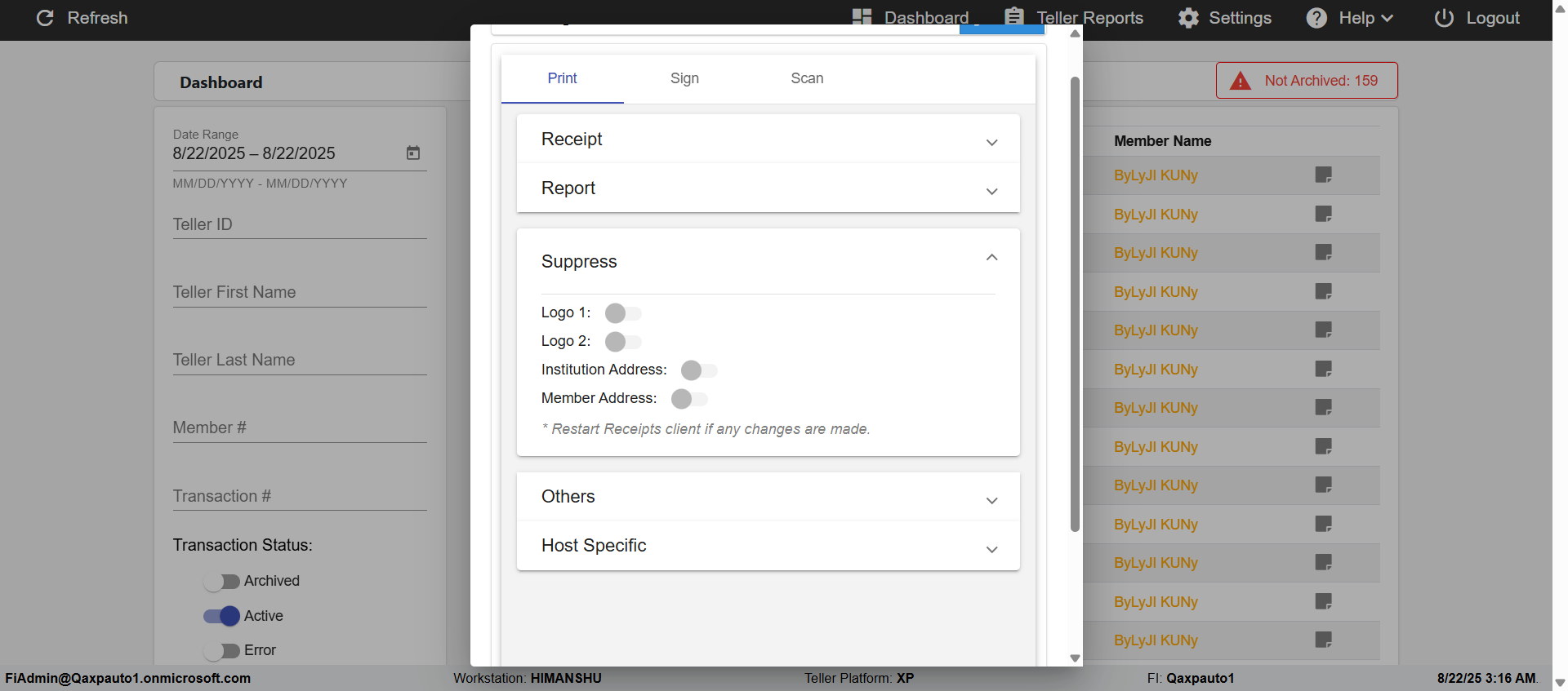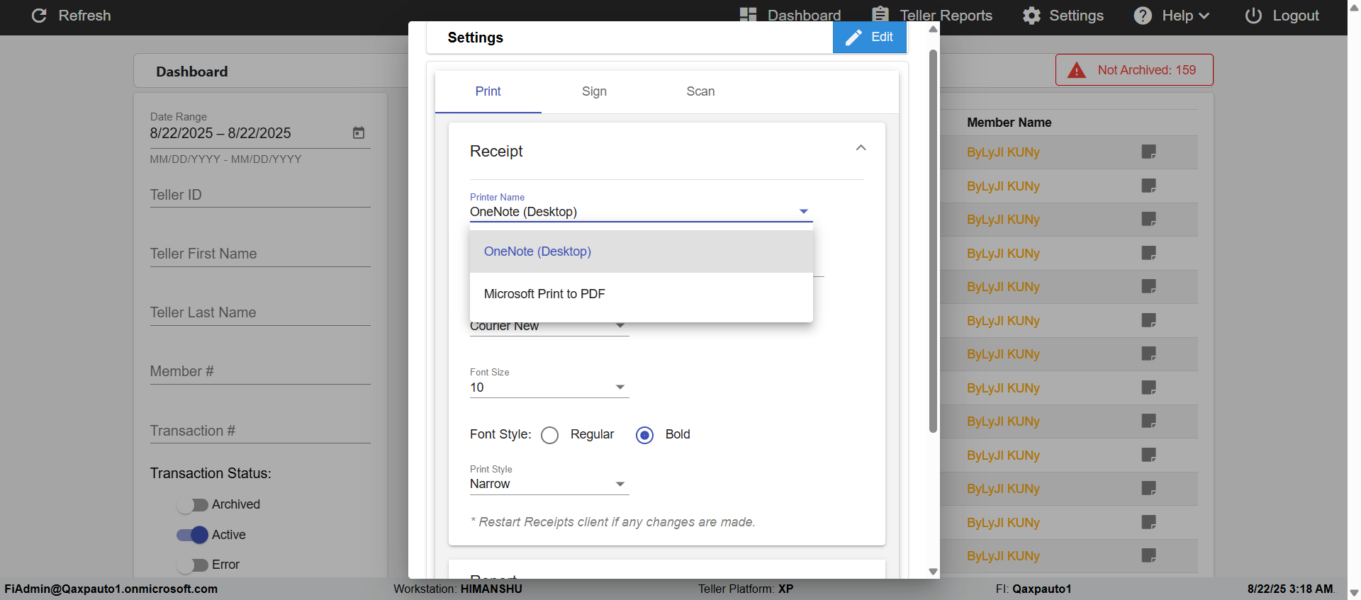 ({Description=verify Settings page In Teller Portal, Email=, Teller LastName=, print signatur=TRUE, errorint=, TestID=verifySettingsInTellerPage, Color Transactions=, Member=, UserPwd=iMM2022!, Transtatus=, Receipt=Printer Name-Fax;Name-Consolas;Size-10;Style-Bold,Narrow, Report=Printer Name-Fax;Orientation-Landscape;Name-Consolas;Size-10;Style-Bold, Teller=, Teller FirstName=, errorMessage=, Suppress=Log1-false;Log2-false;CuAddress-false;Member Address-false, Date=, print Disburstments=FALSE, Print signature line=print the sign, Type=, Transaction=, Header=, Username=fiAdmin@Qaxpauto1.onmicrosoft.com, SMS=, Sign=Default Signature Device-Sigpad;Device Model-Topaz 4x5;Connection-COM1;Backlight-true, Scan=Scanner Type-ScanShell 3000D;Image Mode-Singleside;USB Connection-false})