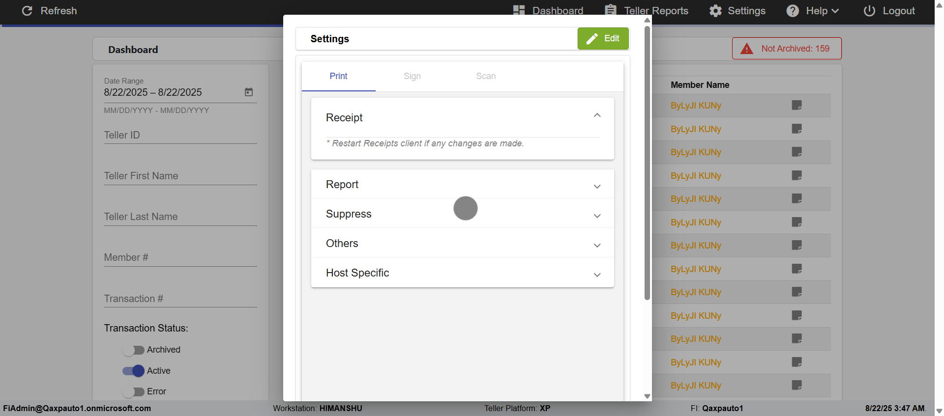 ({Description=verify Settings page In Teller Portal, Email=, Teller LastName=, print signatur=TRUE, errorint=, TestID=verifySettingsInTellerPage, Color Transactions=, Member=, UserPwd=iMM2022!, Transtatus=, Receipt=Printer Name-Fax;Name-Consolas;Size-10;Style-Bold,Narrow, Report=Printer Name-Fax;Orientation-Landscape;Name-Consolas;Size-10;Style-Bold, Teller=, Teller FirstName=, errorMessage=, Suppress=Log1-false;Log2-false;CuAddress-false;Member Address-false, Date=, print Disburstments=FALSE, Print signature line=print the sign, Type=, Transaction=, Header=, Username=fiAdmin@Qaxpauto1.onmicrosoft.com, SMS=, Sign=Default Signature Device-Sigpad;Device Model-Topaz 4x5;Connection-COM1;Backlight-true, Scan=Scanner Type-ScanShell 3000D;Image Mode-Singleside;USB Connection-false})