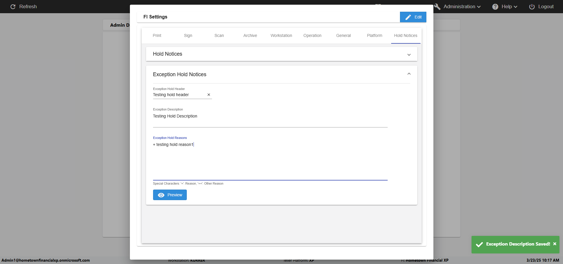 ({Archived Transactions=, Archive=, print signatur=, Name=, MultipleWorkstation=, WorkstationDeleteOption=, BranchName=, Agent=, UserPwd=iMM2025!, BranchDeleteOption=, Receipt=, Role=, Brand=, Print signature line=, TimeZone=, Header=, MappedOption=, Scan=, PortNumber=, FromBranch=, Description=verify hold notice Settings In Admin, Operation=, Clear=, TestID=verifyFIHoldNoticeSettingsInAdmin, Phone=, WorkstationName=, ToBranch=, Subscription Names=, retention=, FilePath=, Transtatus=Archived-false;Active-true;Error-false, Report=, Index_Field_Name=, Agents=, IPFilter=, Text=, Hold Notice=Hold Header-Testing hold header; Hold Description-Testing Hold Description; Hold Reasons-+ testing hold reason1, Suppress=, SchedualType=, Date=, Platfrom=Enable Hold Notice-true;, GroupId=, print Disburstments=, SMTP=, Imaging System=, MultipleBranches=, Username=Admin1@hometownfinancialxp.onmicrosoft.com, Sign=})
