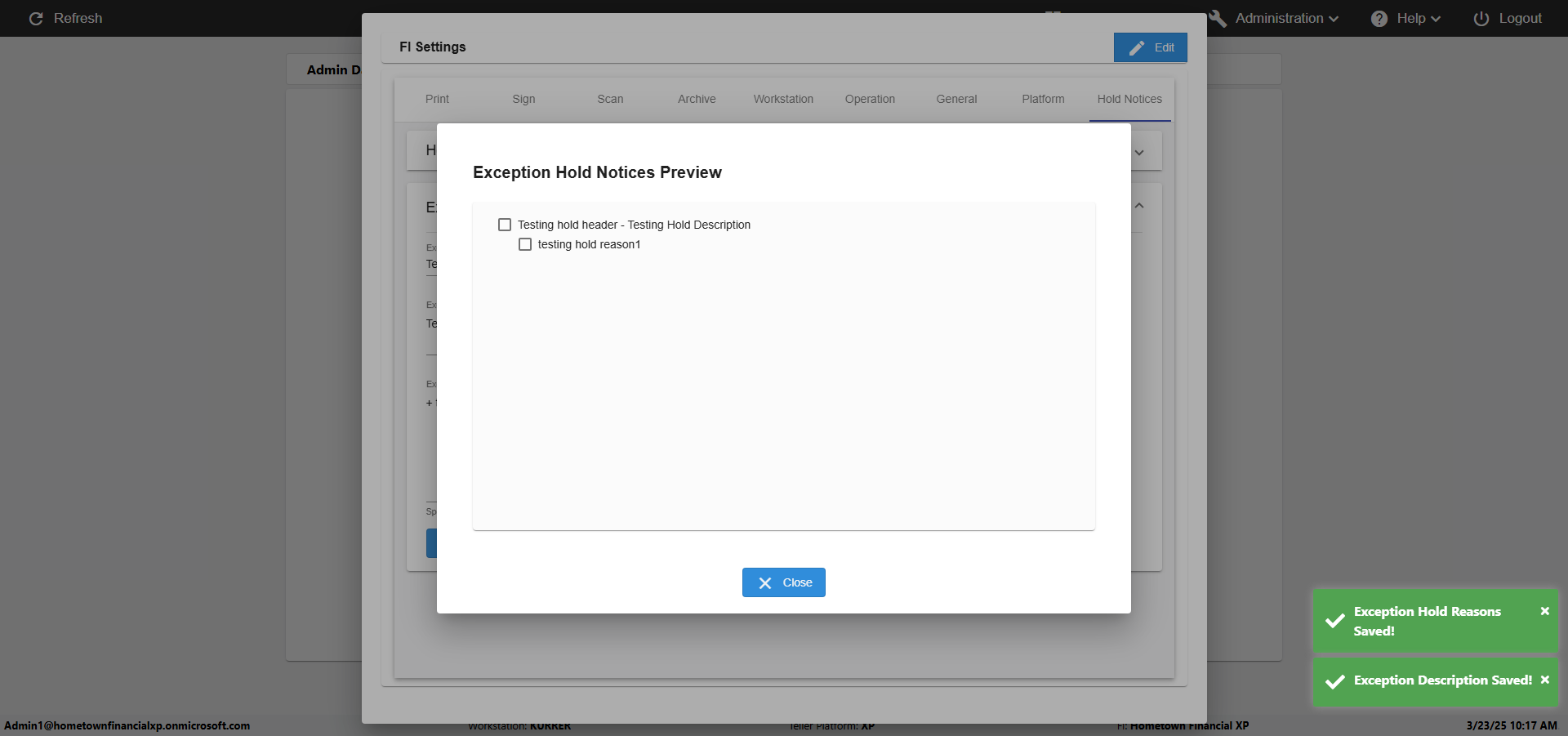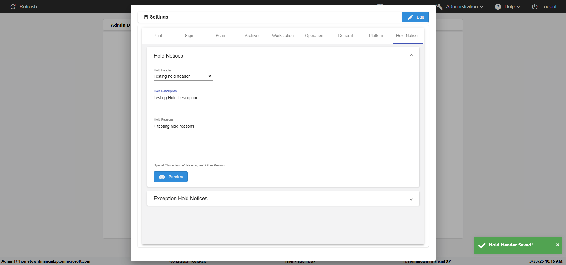 verifyFIHoldNoticeSettingsInAdmin ({Archived Transactions=, Archive=, print signatur=, Name=, MultipleWorkstation=, WorkstationDeleteOption=, BranchName=, Agent=, UserPwd=iMM2025!, BranchDeleteOption=, Receipt=, Role=, Brand=, Print signature line=, TimeZone=, Header=, MappedOption=, Scan=, PortNumber=, FromBranch=, Description=verify hold notice Settings In Admin, Operation=, Clear=, TestID=verifyFIHoldNoticeSettingsInAdmin, Phone=, WorkstationName=, ToBranch=, Subscription Names=, retention=, FilePath=, Transtatus=Archived-false;Active-true;Error-false, Report=, Index_Field_Name=, Agents=, IPFilter=, Text=, Hold Notice=Hold Header-Testing hold header; Hold Description-Testing Hold Description; Hold Reasons-+ testing hold reason1, Suppress=, SchedualType=, Date=, Platfrom=Enable Hold Notice-true;, GroupId=, print Disburstments=, SMTP=, Imaging System=, MultipleBranches=, Username=Admin1@hometownfinancialxp.onmicrosoft.com, Sign=}) (verify hold notice Setings test cases in admin)