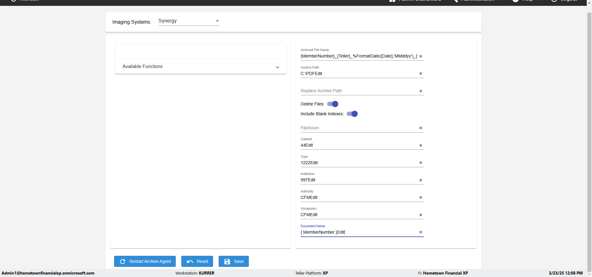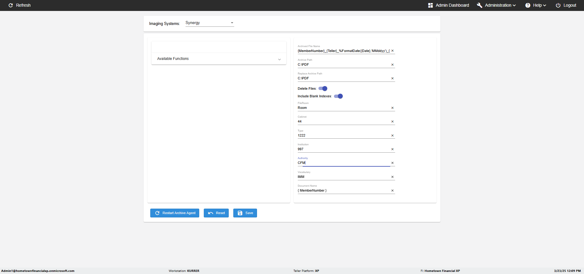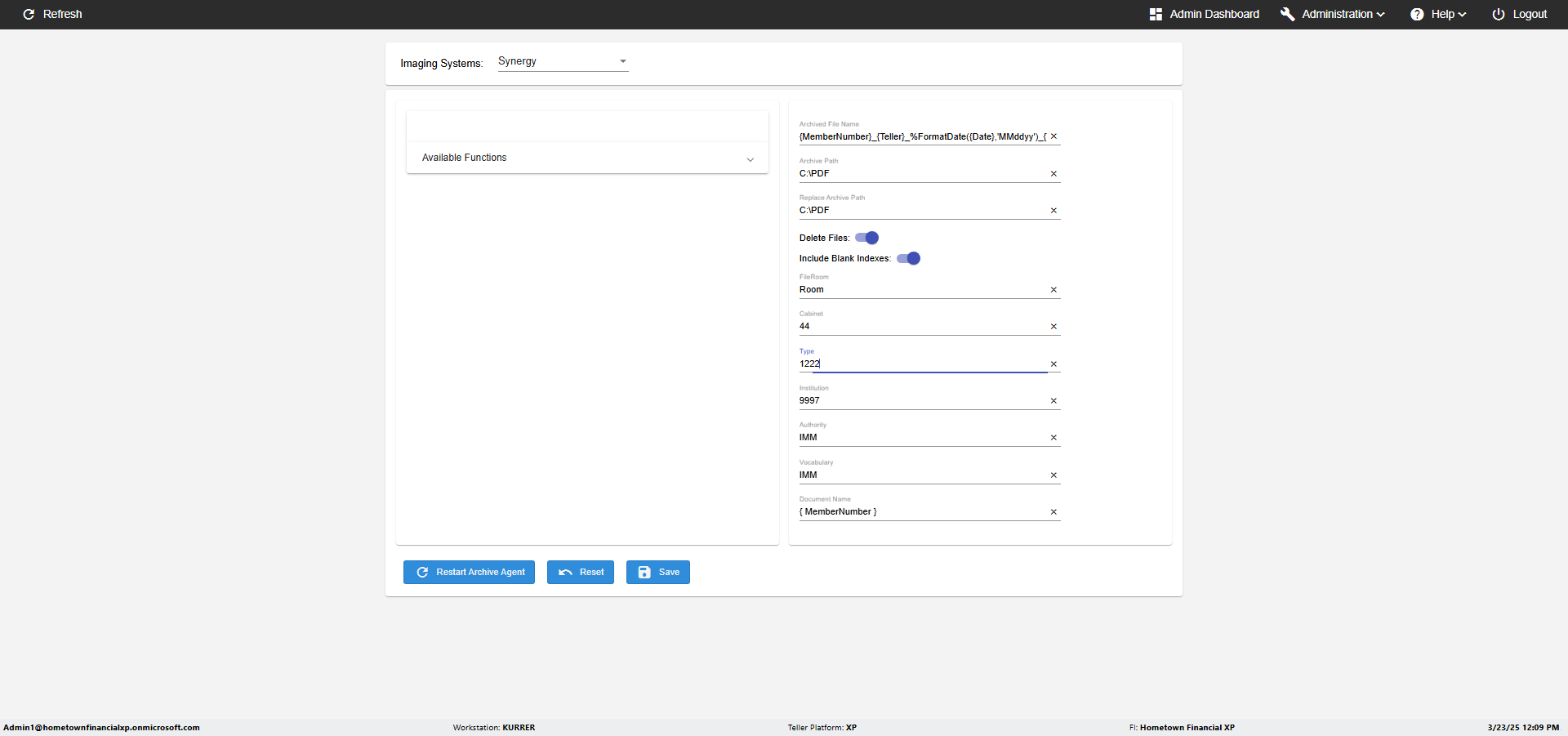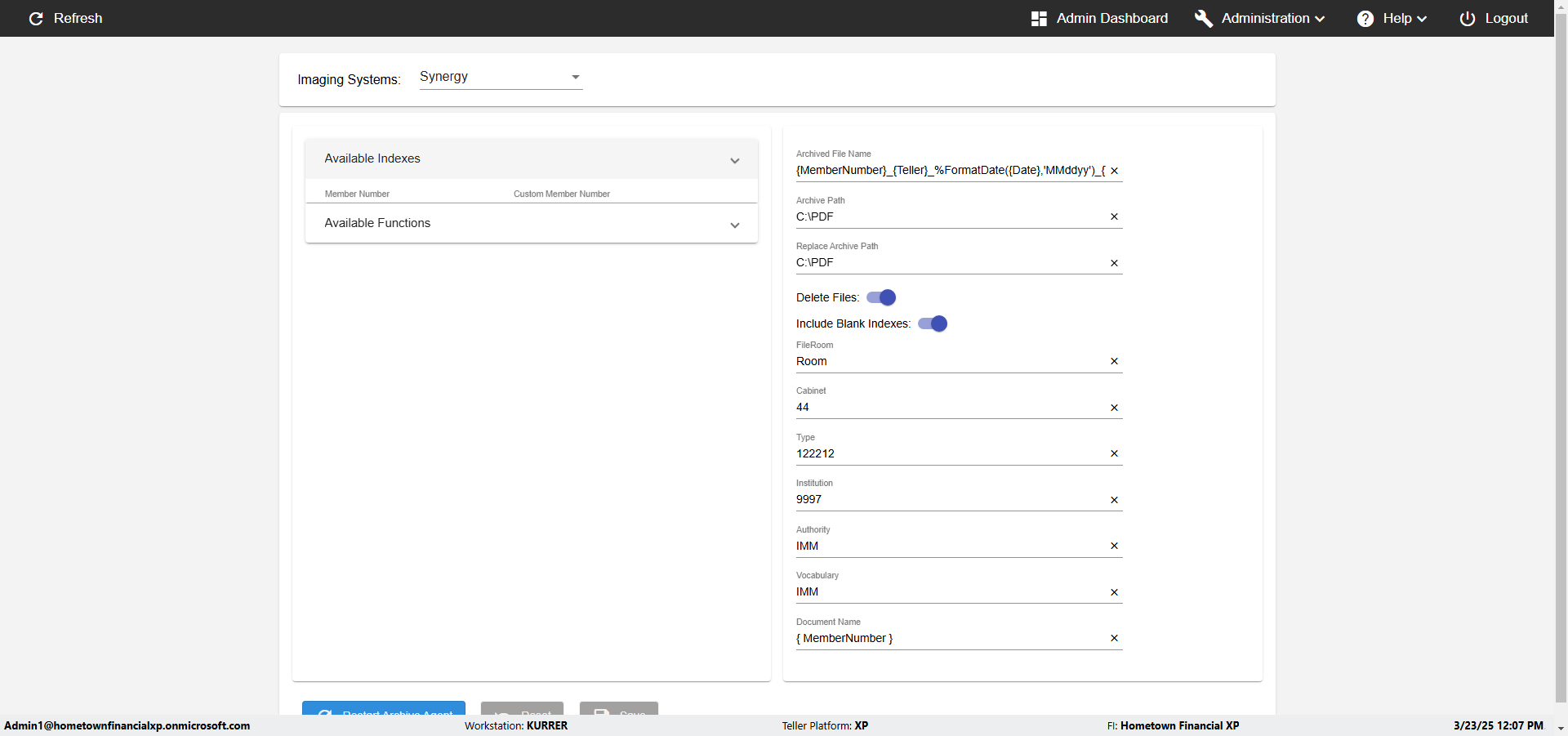 ({Archived Transactions=, Archive=, print signatur=, Name=, MultipleWorkstation=, WorkstationDeleteOption=, BranchName=, Agent=, UserPwd=iMM2025!, BranchDeleteOption=, Receipt=, Role=, Brand=, Print signature line=, TimeZone=, Header=, MappedOption=, Scan=, PortNumber=, FromWks=, FromBranch=, Description=Verify Imaging system UI elements, weeks=, Operation=, Clear=, TestID=verifyImagingSystem, Phone=, WorkstationName=, ToBranch=, ToWks=, Subscription Names=, FilePath=, Transtatus=Archived-false;Active-true;Error-false, Report=, Index_Field_Name=Archived File Name Template-{MemberNumber}_{Teller}_%FormatDate({Date},'MMddyy')_{Time}%GetCurrentDateTime('ffff').pdf;Archived Path-C:\PDF;FileRoom-Room;Cabinet-44;Type-1222;Institution-997;Authority-CFM;Vocabulary-CFM;Document Name-{ MemberNumber }, Agents=, Text=, Hold Notice=, Suppress=, SchedualType=, Date=, Platfrom=, GroupId=, print Disburstments=, SMTP=, Imaging System=Synergy, MultipleBranches=, Username=Admin1@hometownfinancialxp.onmicrosoft.com, Sign=})