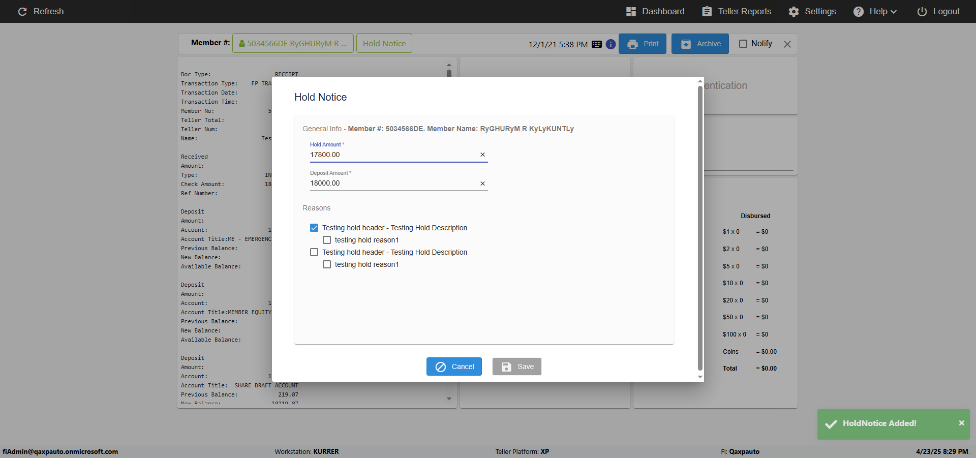 ({Toggel=, Archived Transactions=no, Description=verify Hold Notice Warning Message with Reasons Saved, Email=, Archive=, Document Type=, Notify=, SignatureTab=, DisbursedExpression=, Operation=, Teller LastName=, Disbursed cash=, errorint=, TestID=verifyHoldNoticeWarningWithReasons, Print=, DisbursedExpressionValue=, Phone=, ReceivedCashValue=, Member=5034566, UserPwd=iMM2022!, Transtatus=Archived-false;Active-true;Error-false, Docment ID=, Teller=1881881, Teller FirstName=, errorMessage=, ReceivedExpressionValue=, Date=, Platfrom=Enable Hold Notice-true; Hold Notice Warning-true;, Received cash=, Transaction=, Header=, Expression=, Username=fiAdmin@Qaxpauto.onmicrosoft.com, DisbursedCashValue=, FullName=, ReceivedExpression=, SMS=, Memo=})