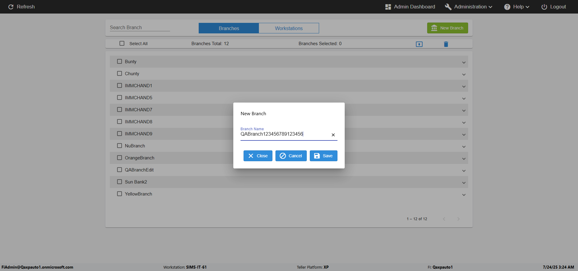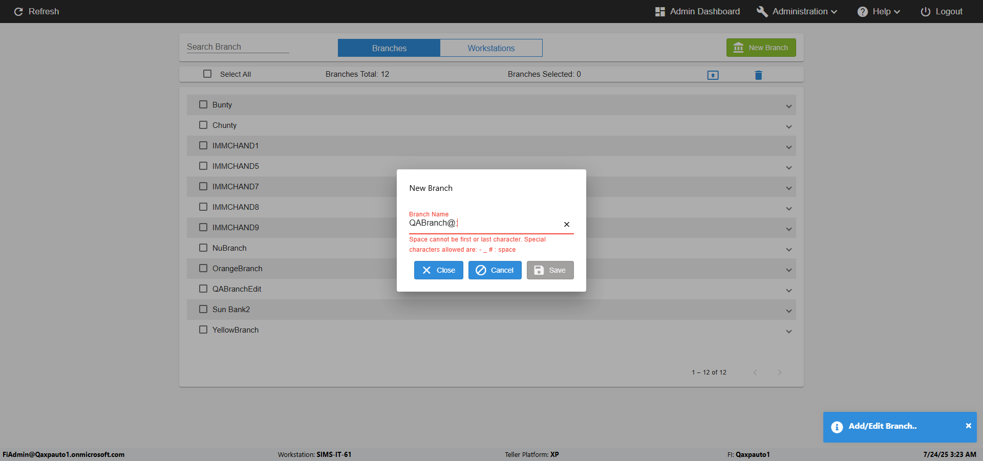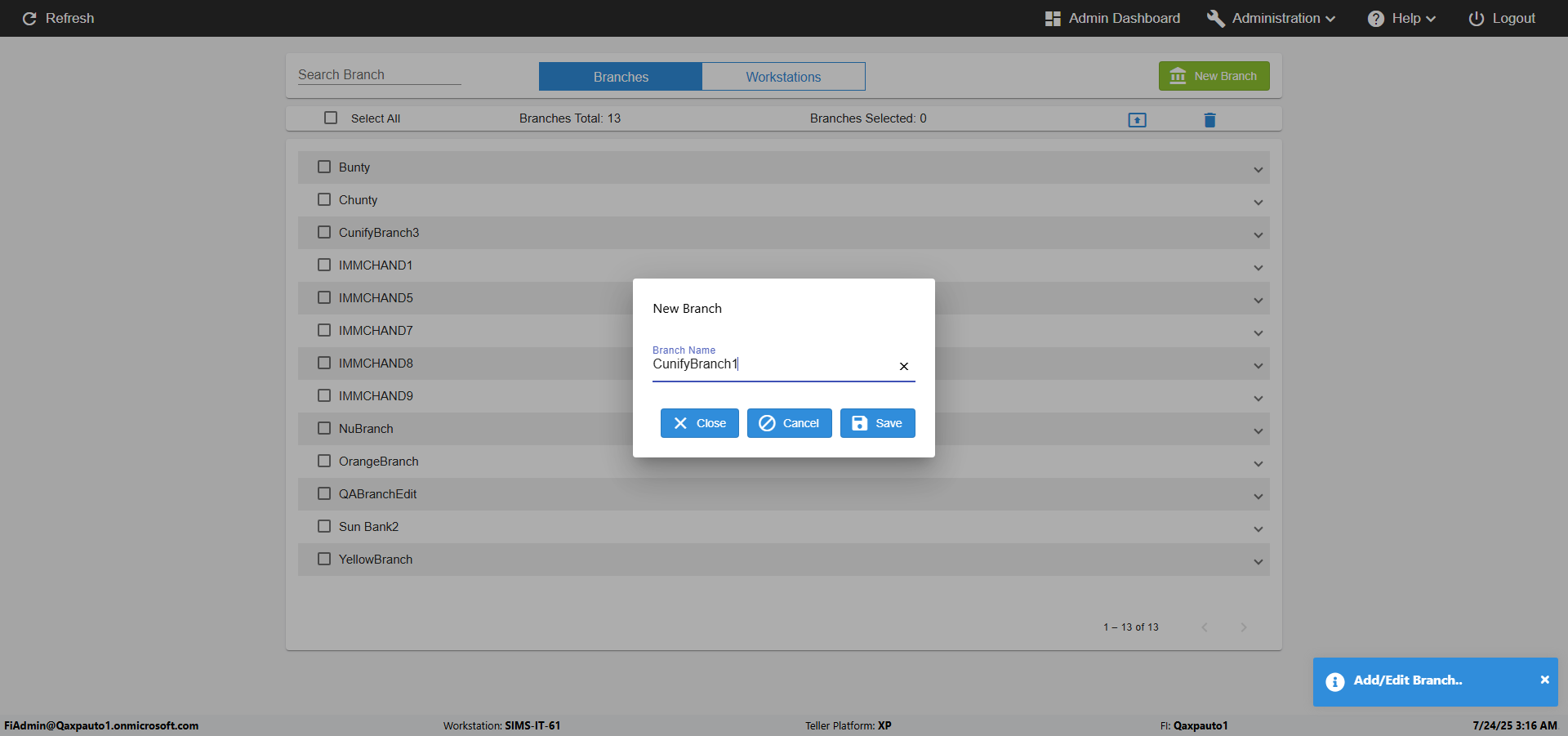 | 04:14:35 AM | Expected: verify the close functionality in Newly created Branch Page Actual(Passed): Successfully verified the close functionality in Newly created Branch Page [ScreenShot] |